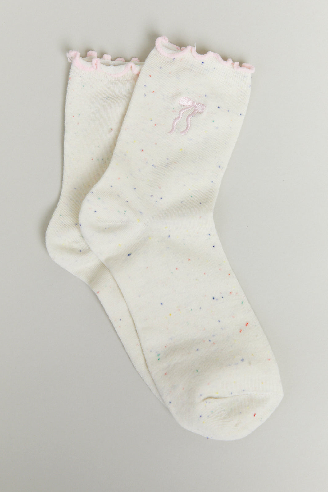 Embroidered Speckled Bow Ruffle Ankle Socks - Pink