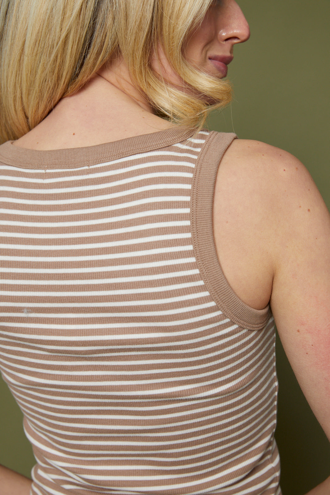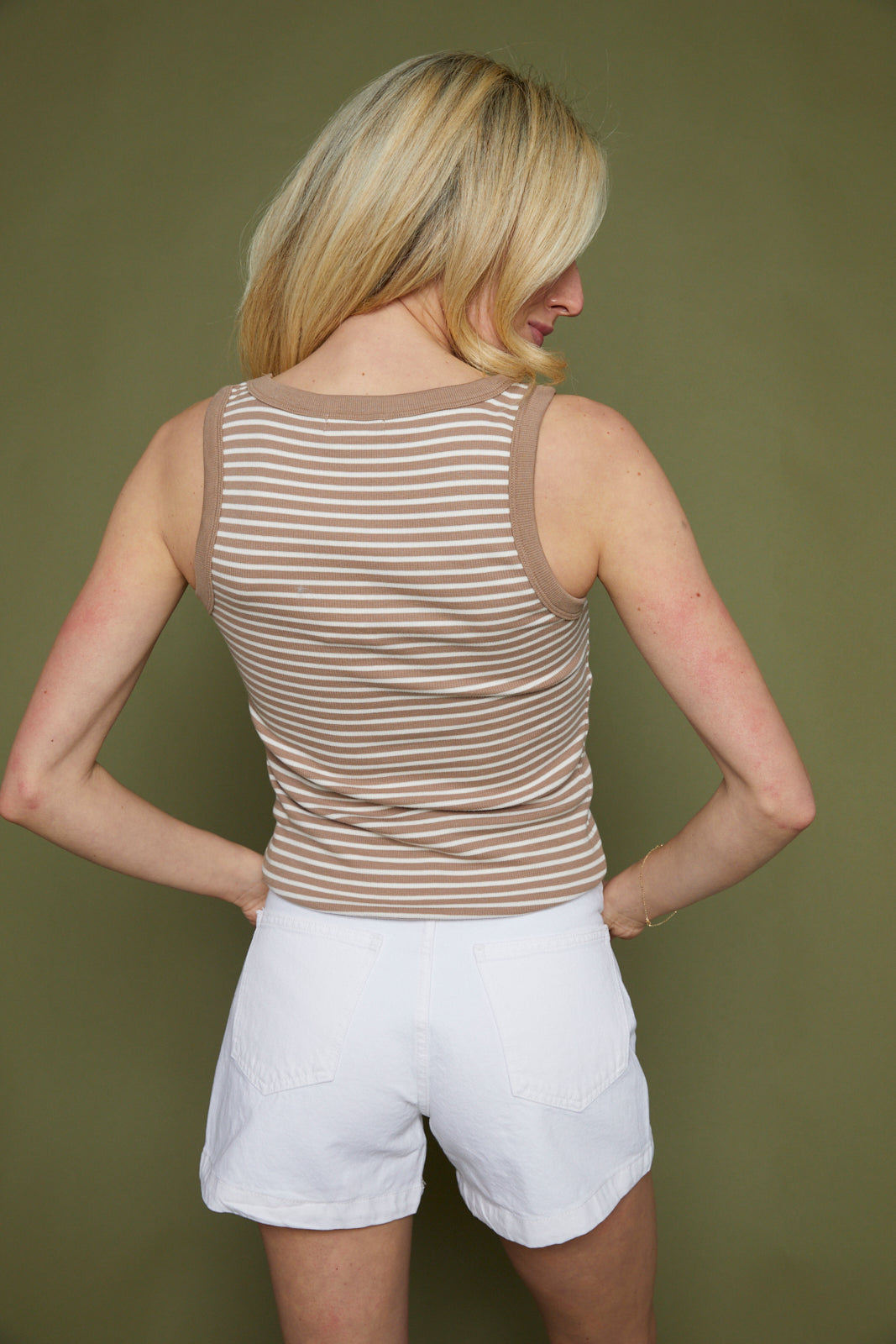 Classic with a twist, this fitted rib tank features a timeless yarn-dyed stripe and a flattering scoop neckline. Made from a comfy cotton-modal blend, it’s bra-friendly, versatile, and perfect for layering or wearing solo.