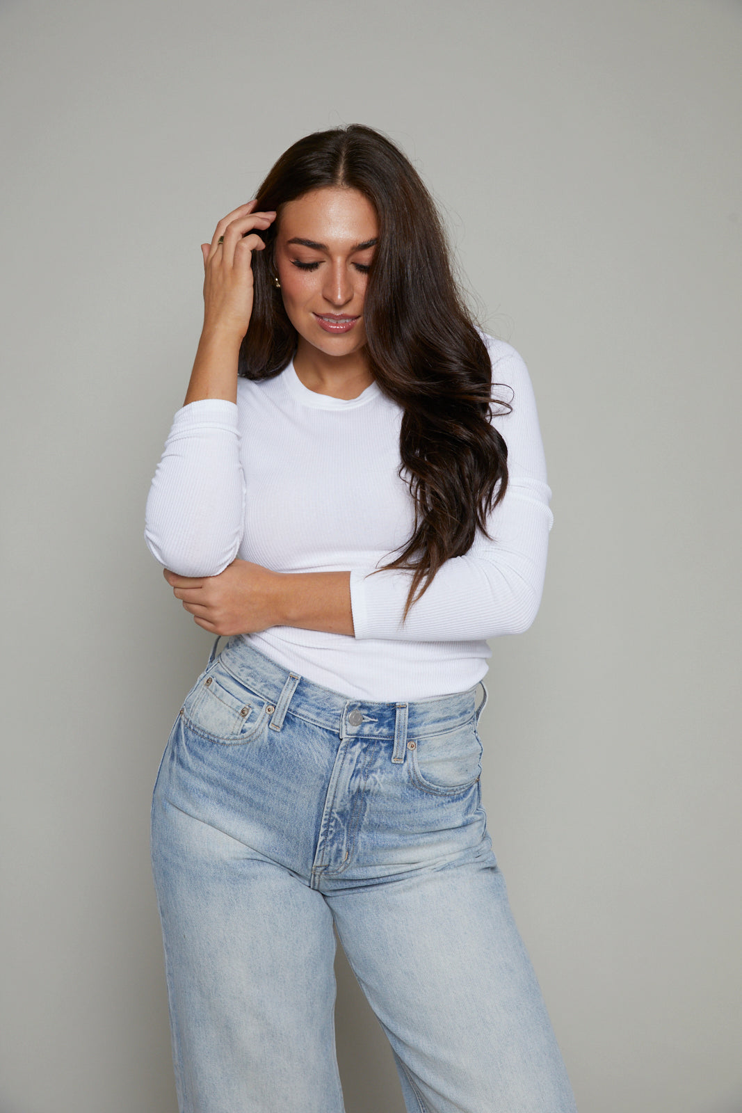 Featured include a crew neck, long fitted sleeves, and length finishing at the hip. This can be tucked in or worn over mid-rise bottoms.