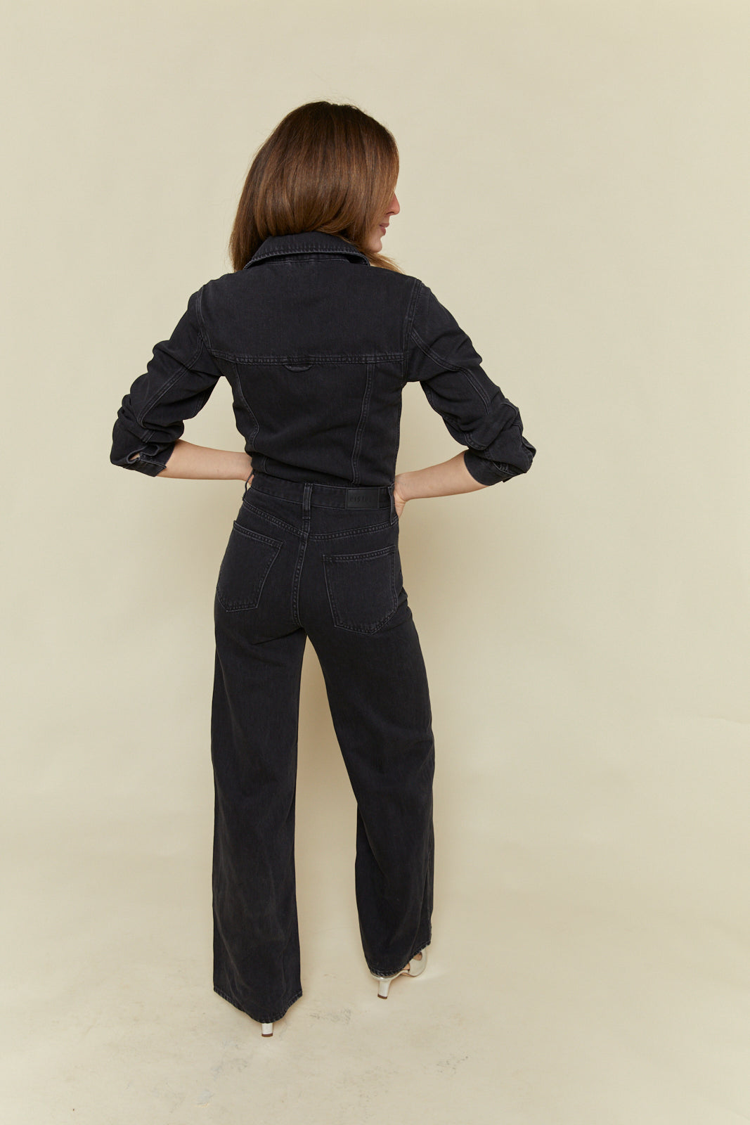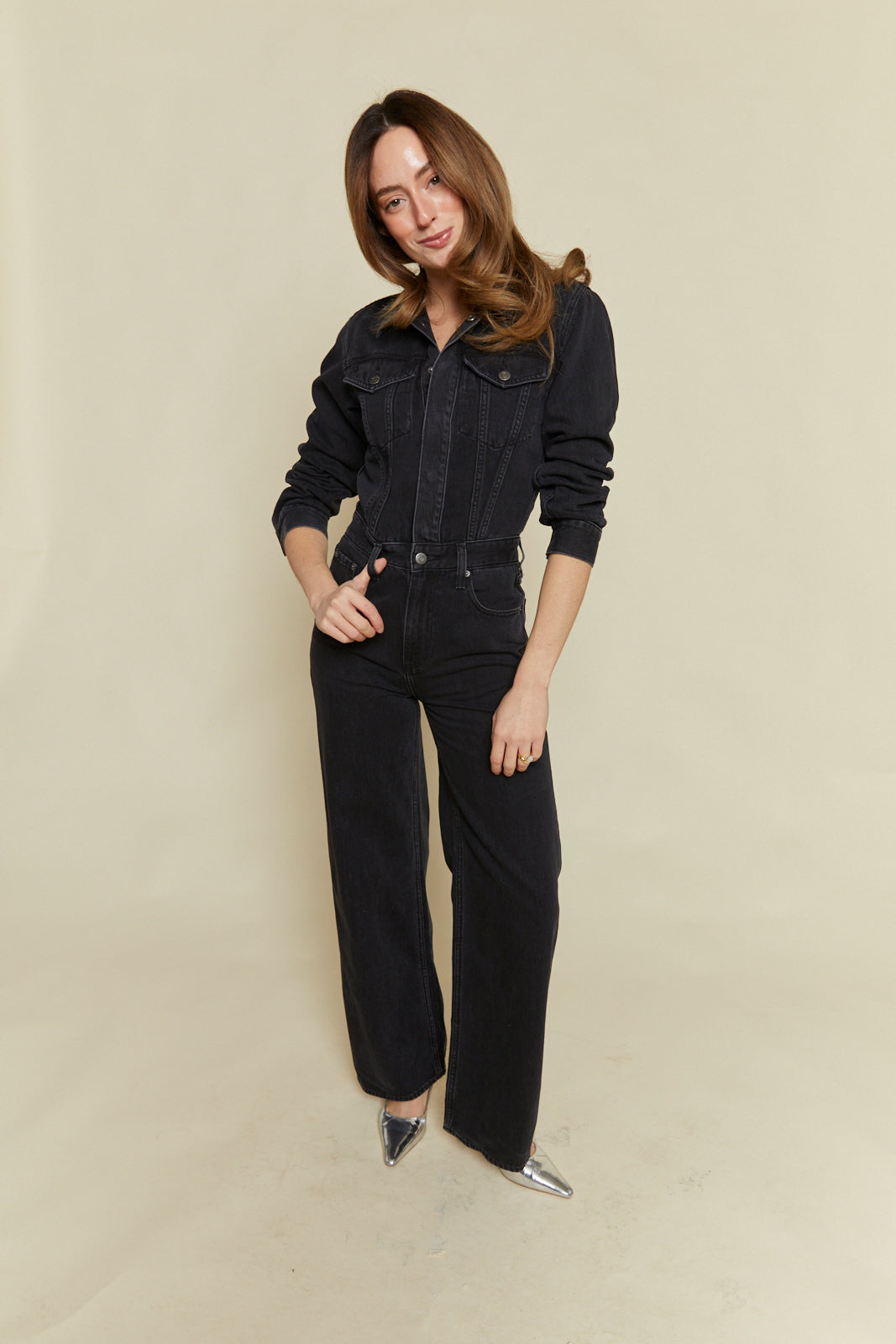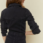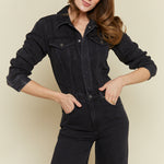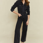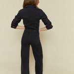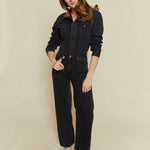 Longsleeve denim jumpsuit with collared neckline and concealed snap button front closure. Five pocket denim design details with a wide leg silhouette and clean finished look. Front flap pockets and directional seaming. Slope is a washed black denim hue with tonal stitching and chrome hardware accents.