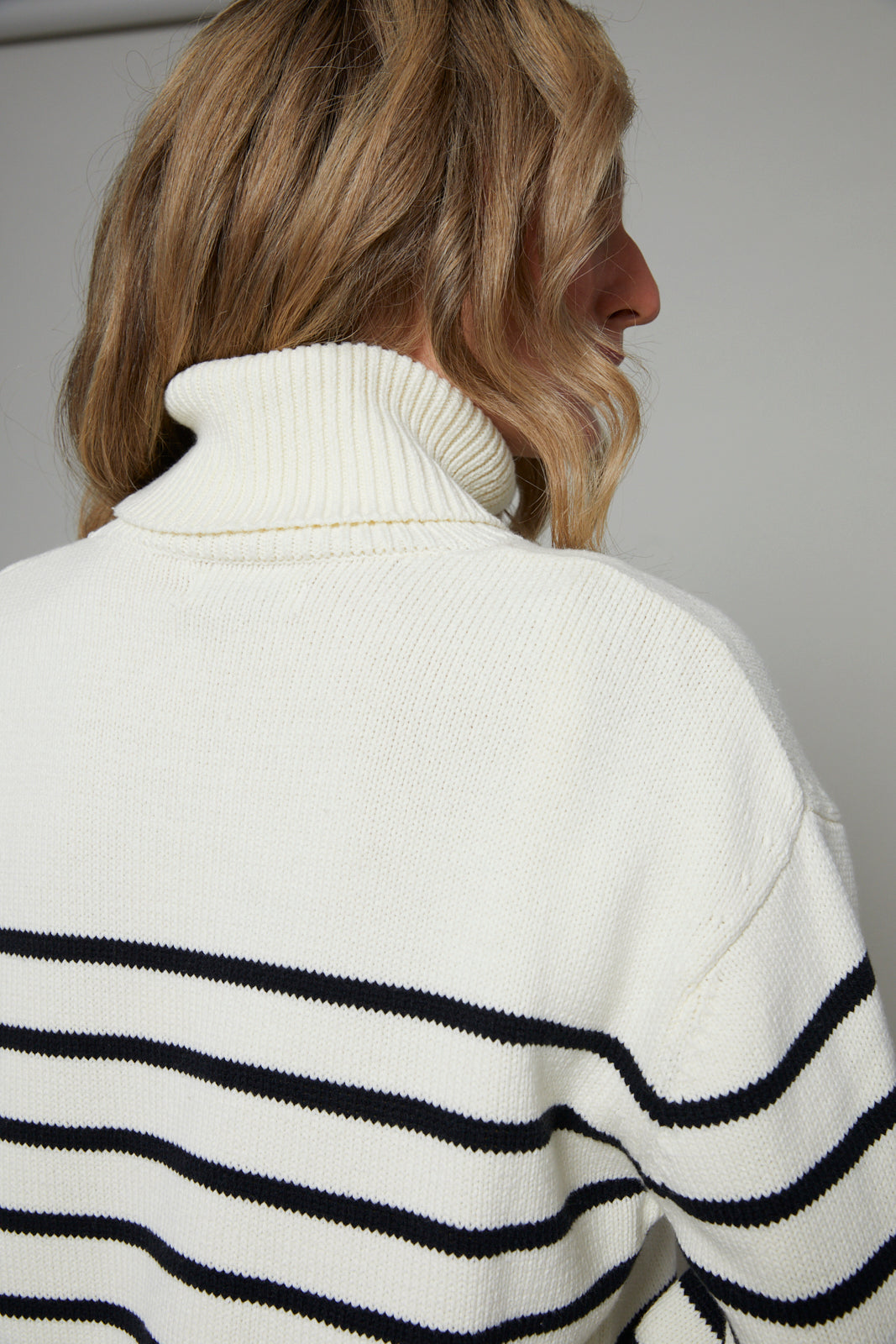 The Ellis Turtleneck is made from a cotton blend yarn with a soft hand feel. The silhouette is relaxed with a dropped shoulder, and length finishing below the hips. Features include fold over turtleneck, placement stripe design, ribbed collar, cuff and hem.