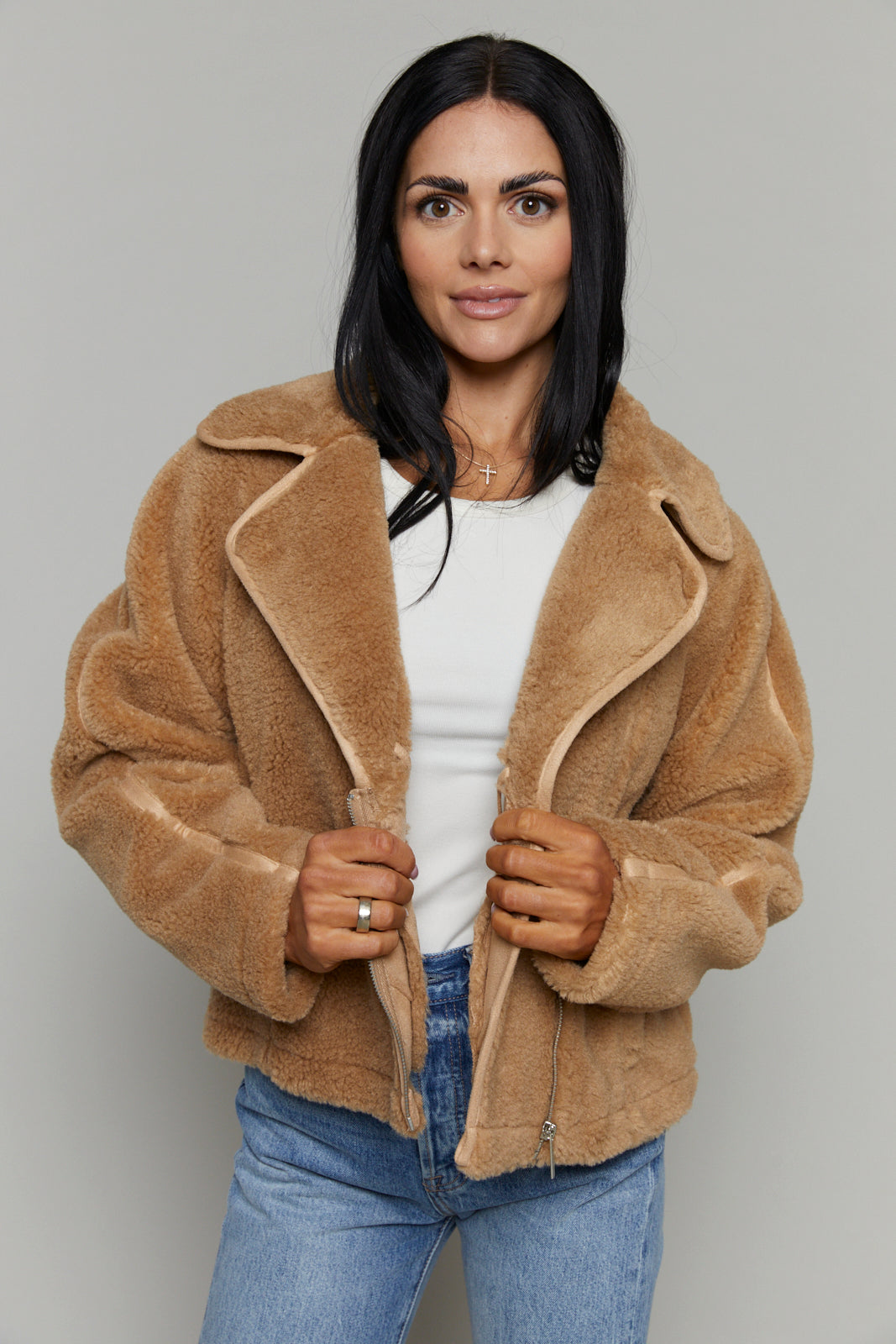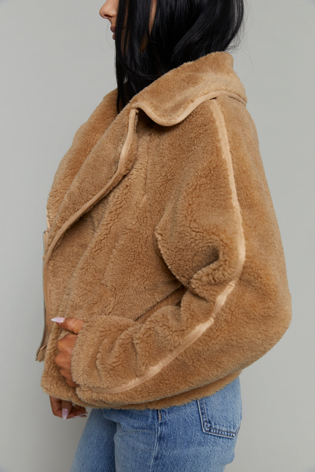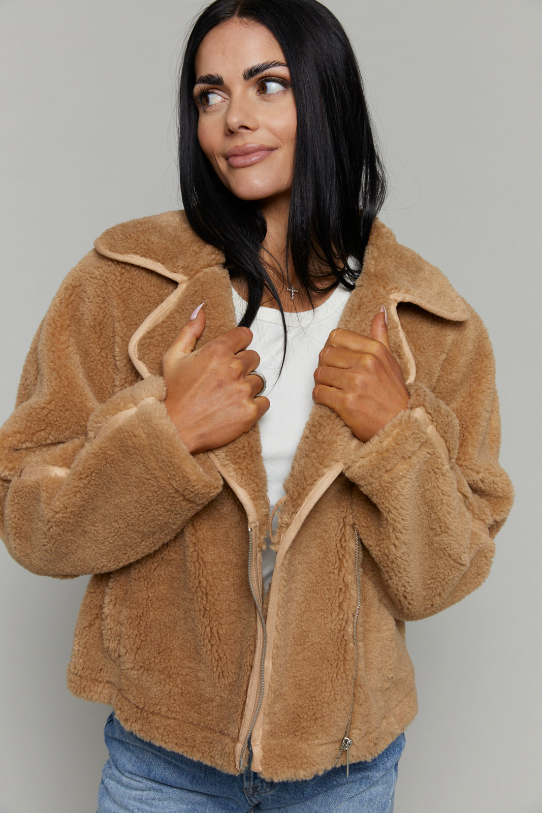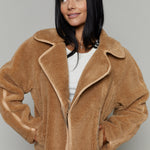 Faux suede and cozy sherpa combine in this cool-weather essential. Designed with moto-inspired lines, raglan sleeves, and contrast trim, it’s equal parts function and standout style.