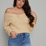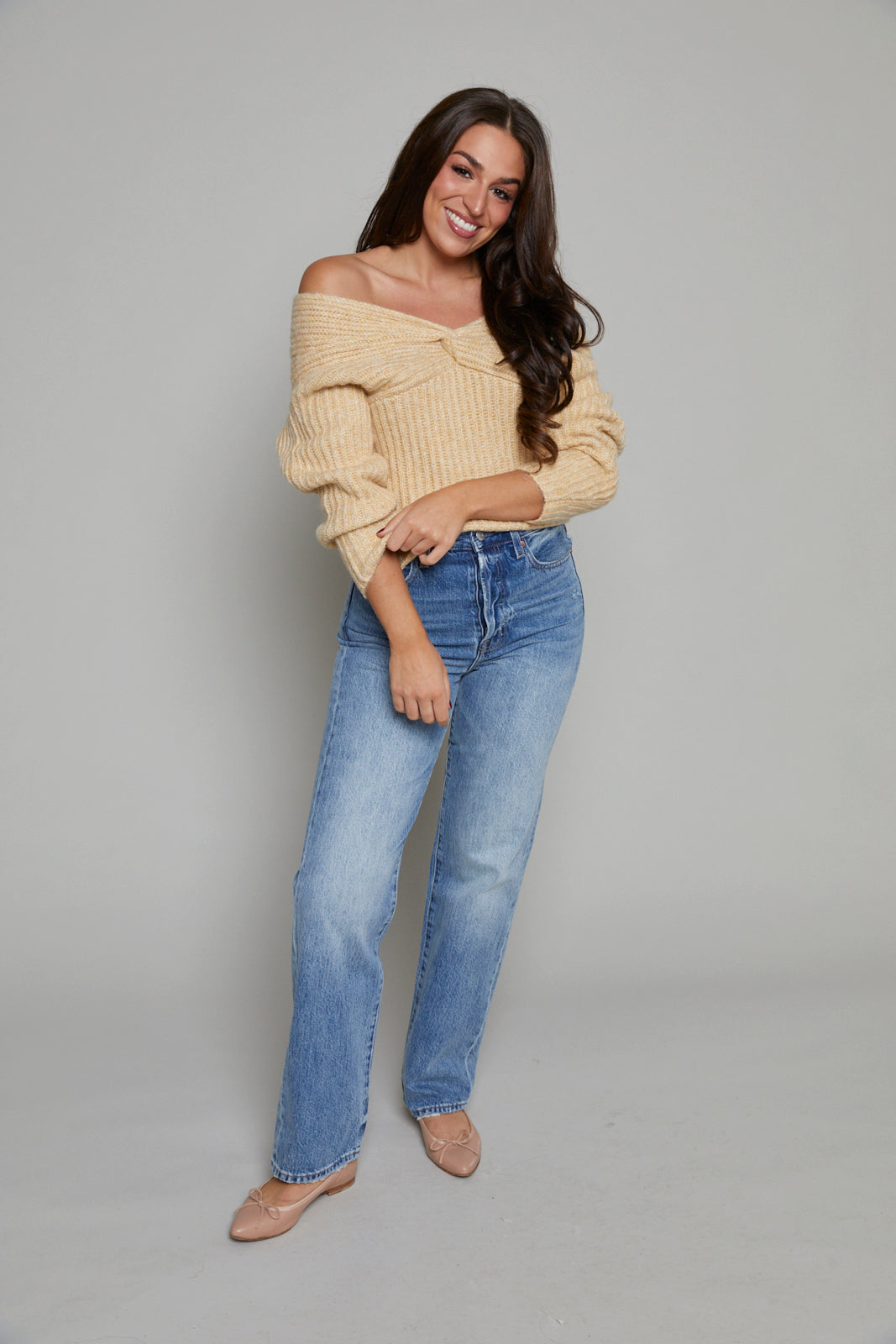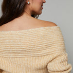 A twisted front brings graceful drape to this wool-kissed sweater designed to be slung off the shoulders.