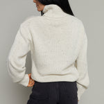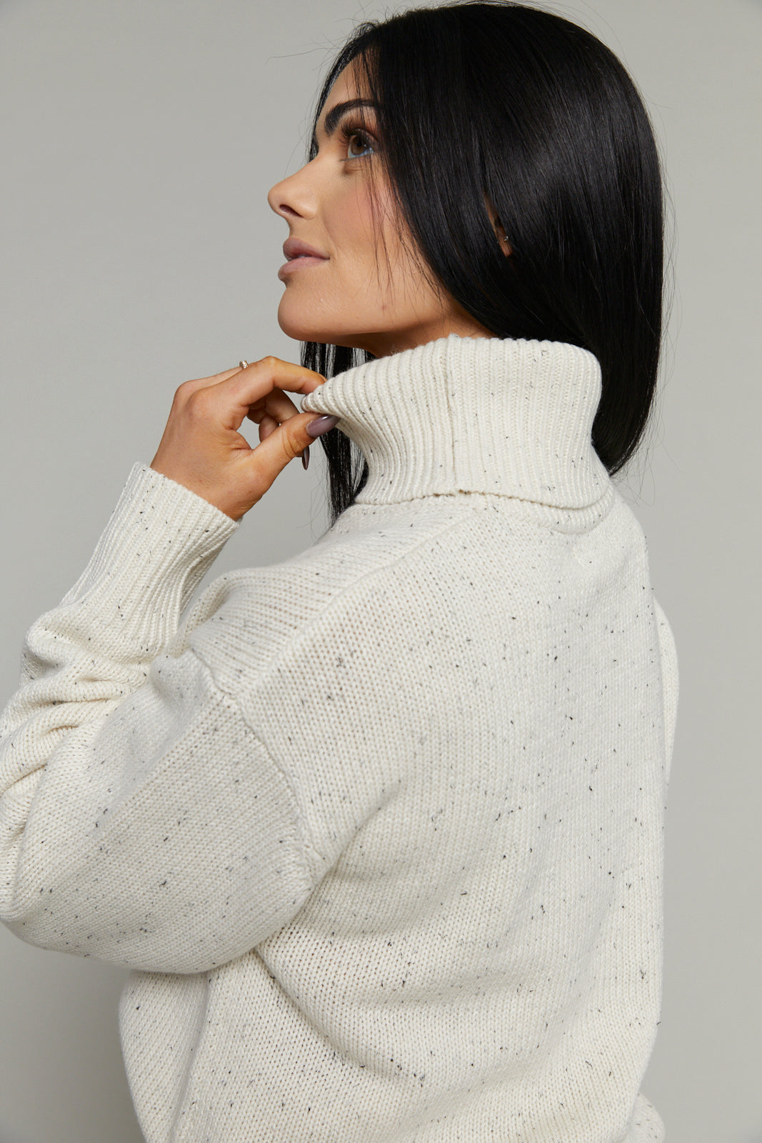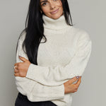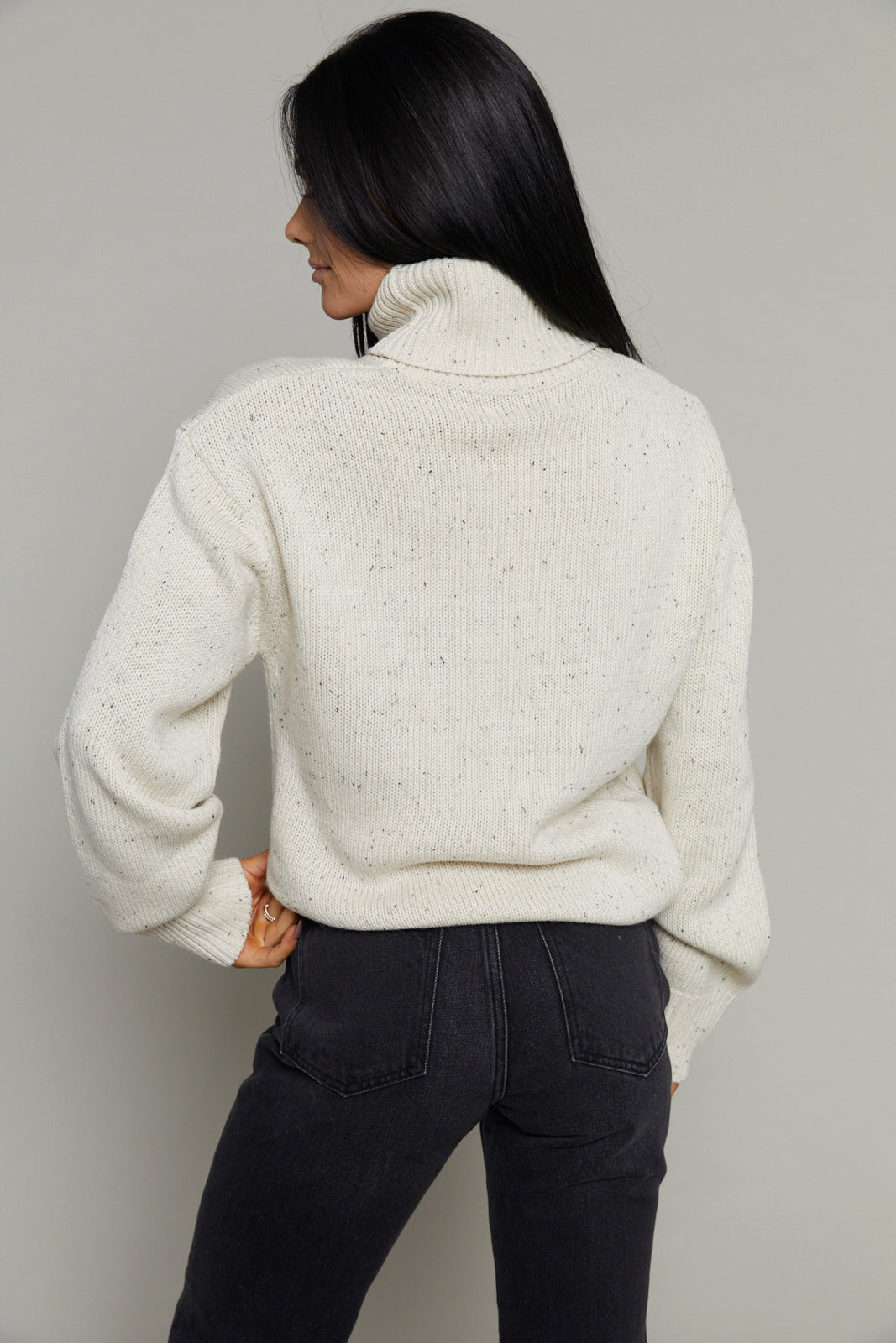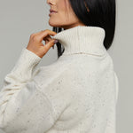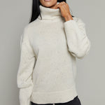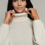 The Rochelle Turtleneck Knit is made from a cotton blend yarn with a soft hand feel and speckled yarn throughout. The silhouette is relaxed with a dropped shoulder, and length finishing below the hips. Features include fold over turtleneck, ribbed collar, cuff and hem.