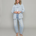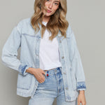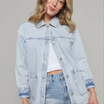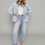 This collared jacket has patch pockets and a button front closure. The easy oversized fit and midweight feel make it a must-have for layered looks.
