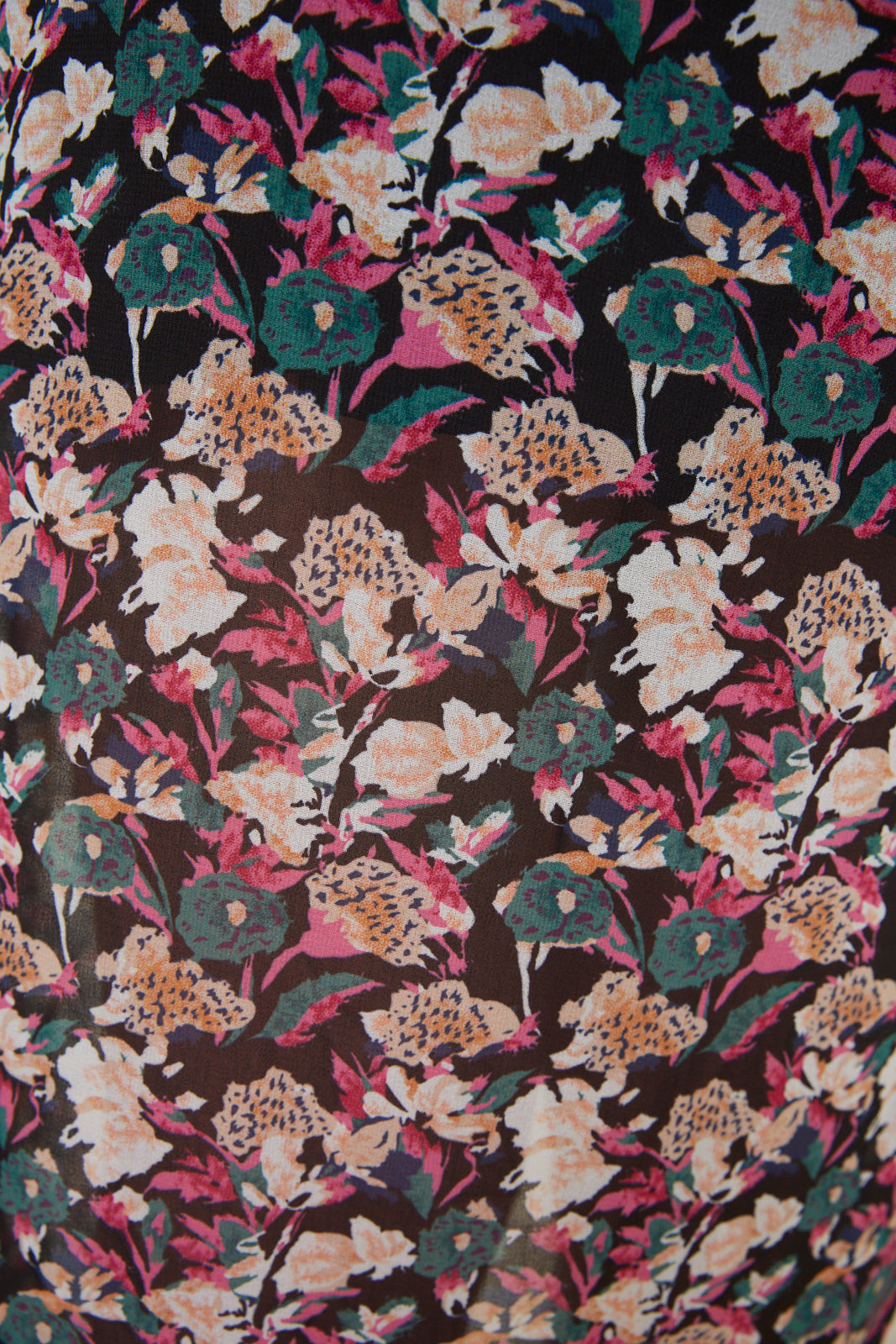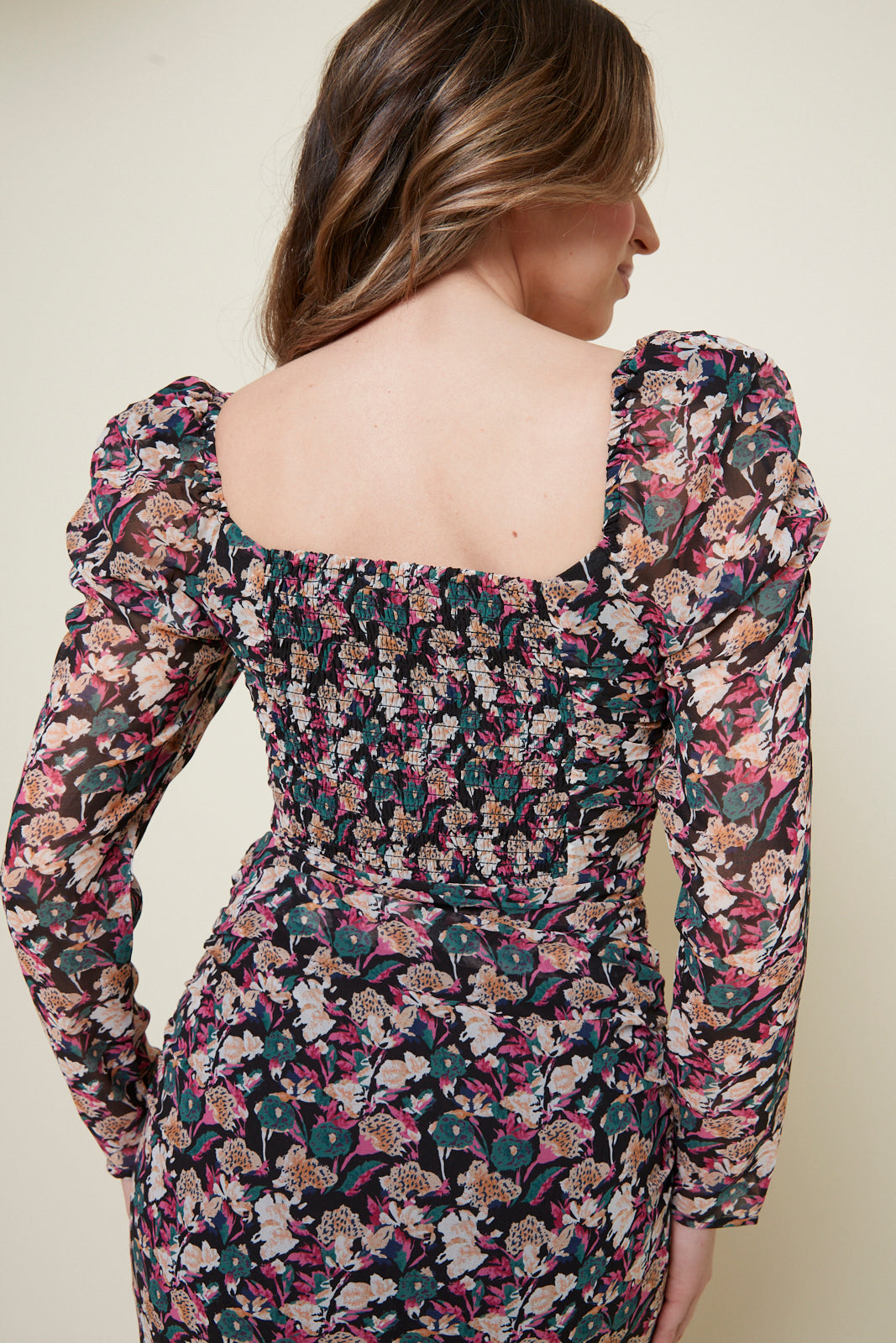 The Bella Dress features a statement floral print throughout. Sweetheart neckline leads to a ruched front and front slit accent. Lightly padded shoulders lead to long sleeves. Smocked back.