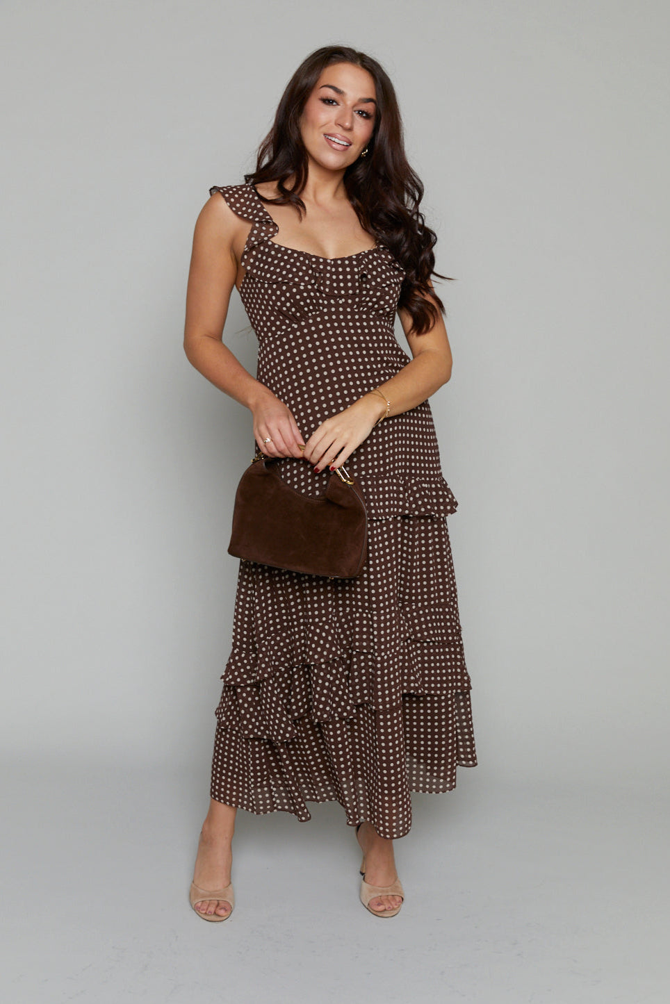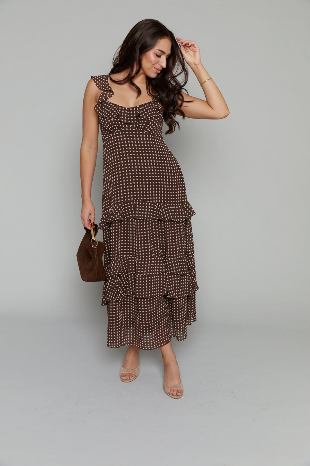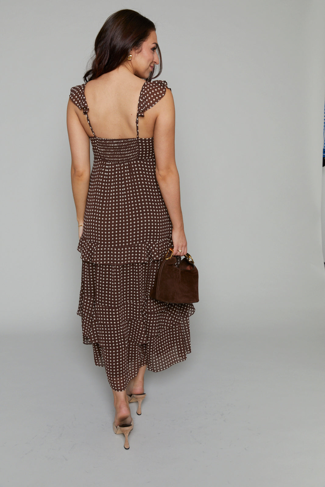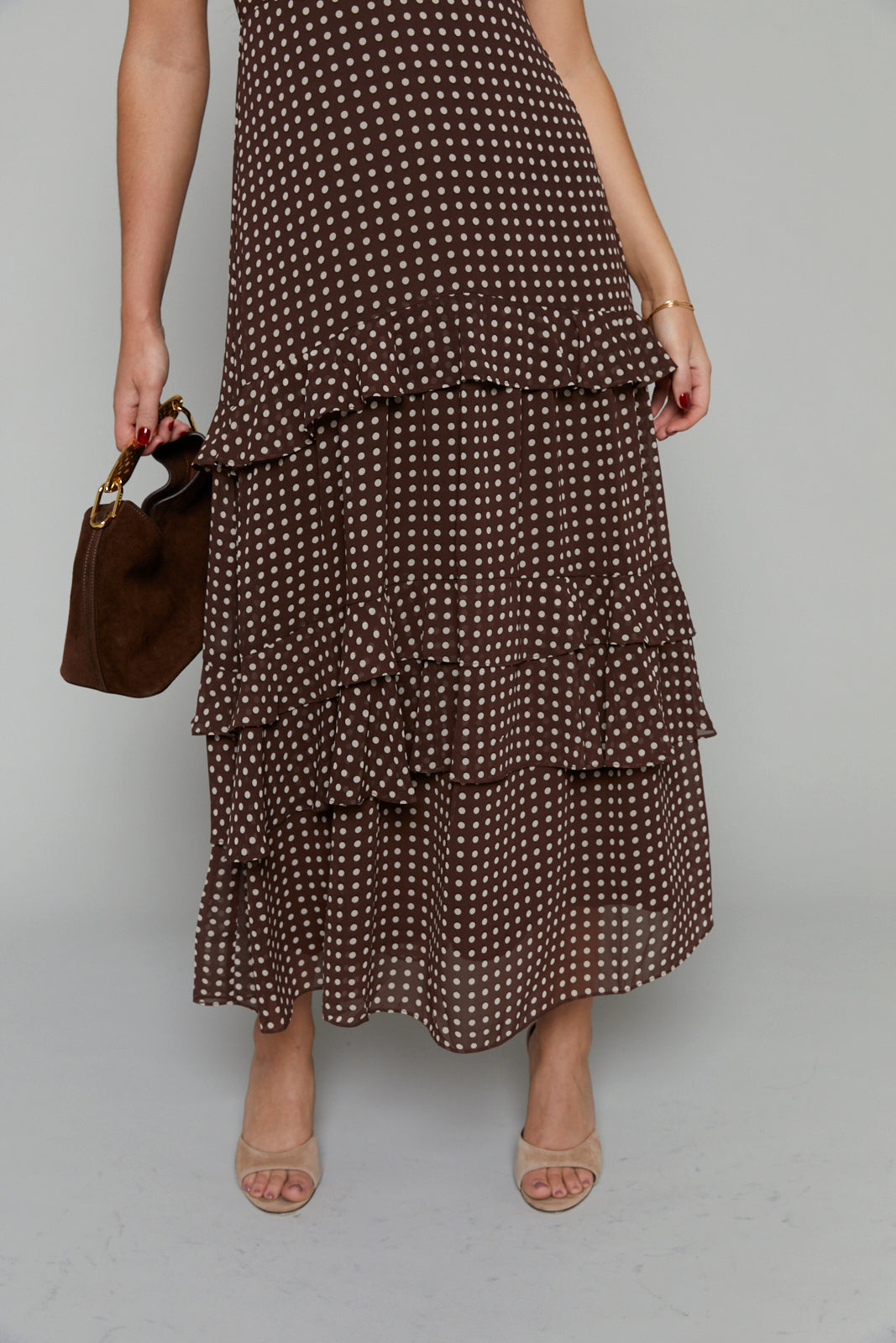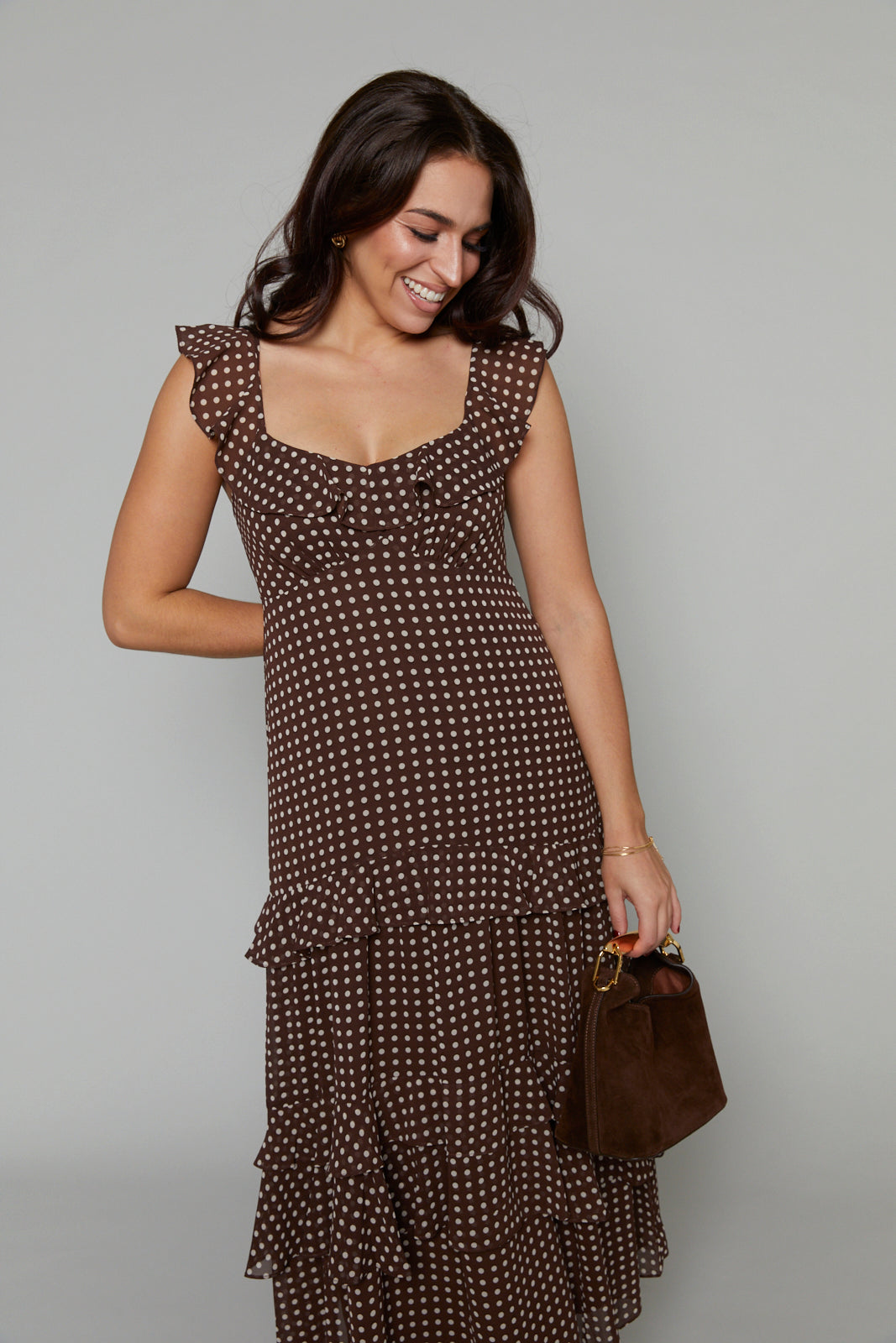 Its playful polka dot pattern and tiered ruffle silhouette bring a romantic whimsy to every movement. Delicate ruffle sleeves add an elegant touch, while the midi length strikes the perfect balance between vintage inspiration and modern flair.
