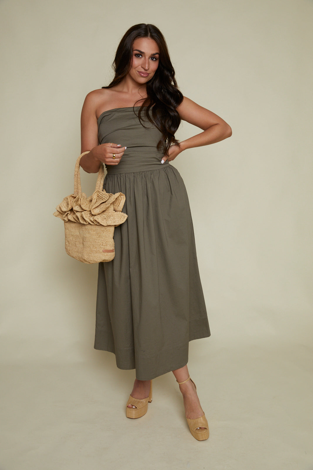 She features beautiful ruching on the bodice that subtly enhances your figure, before flowing into a perfect midi length in our crisp cotton poplin.