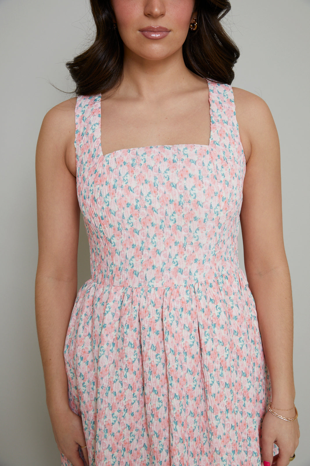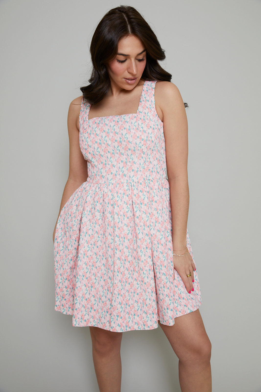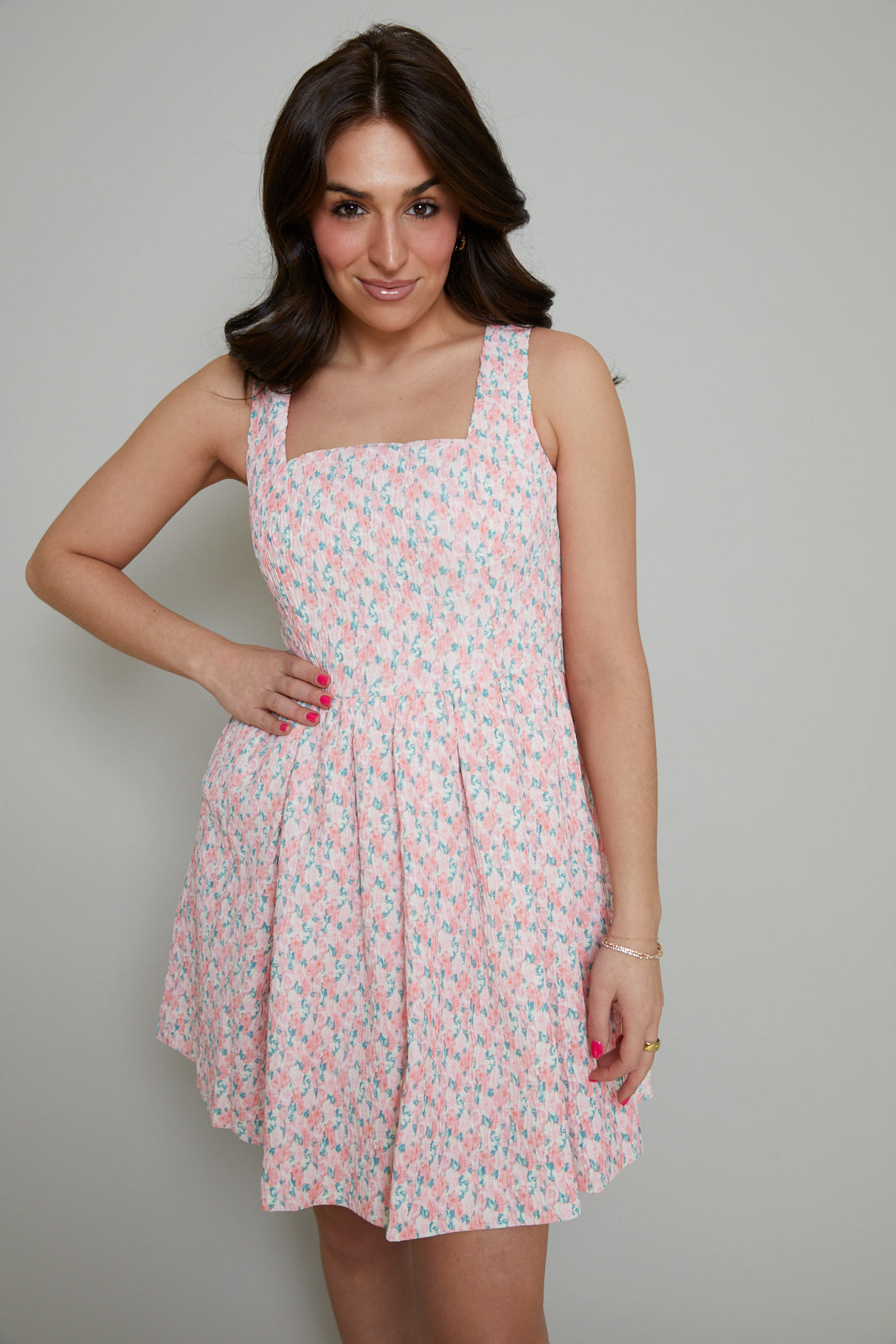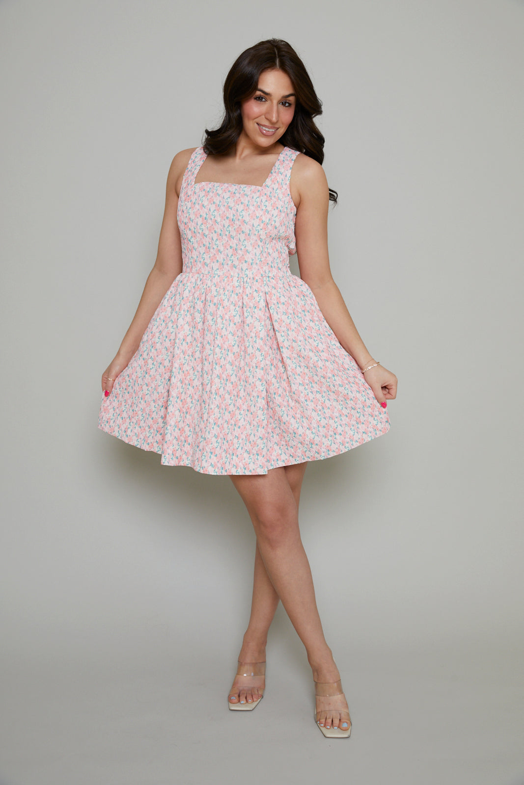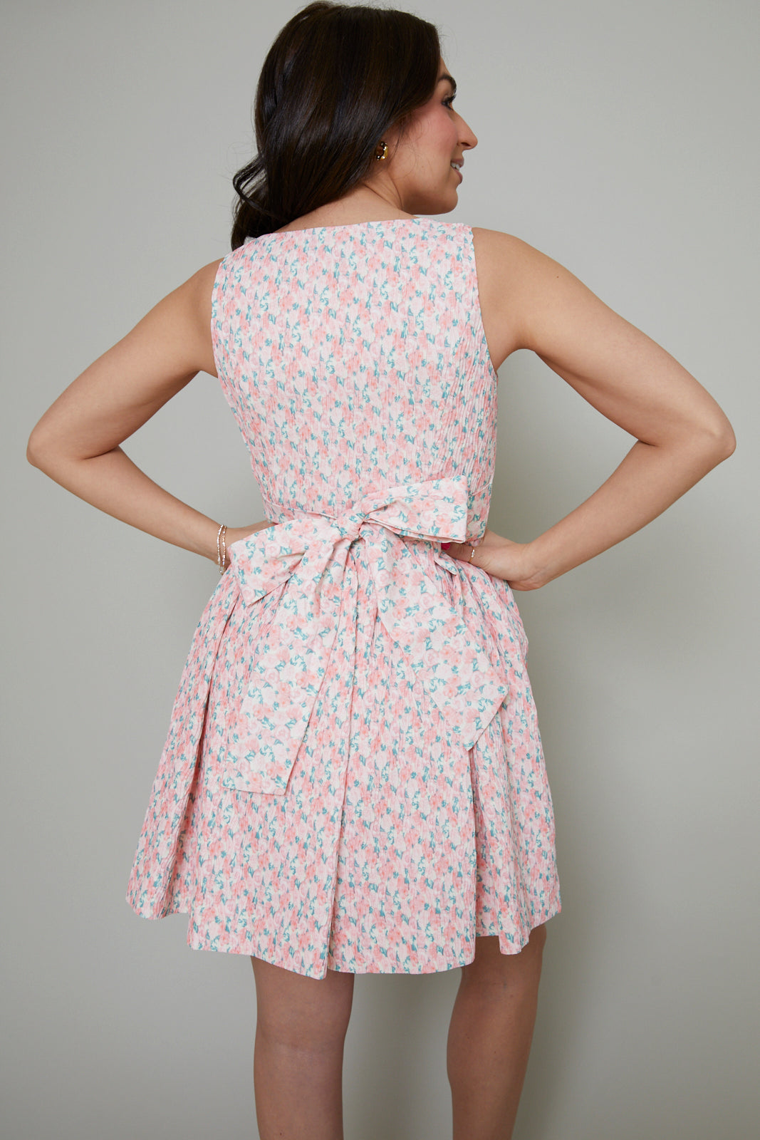 Elevate your wardrobe with our stunning Pearla Dress. Designed in a flattering mini length, this dress showcases a beautiful textured fabric that adds an element of sophistication. The delicate floral print is perfect for any season, while the curved neckline adds a touch of femininity. Complete with a charming bow tie detail, this dress will have you looking effortlessly stylish.