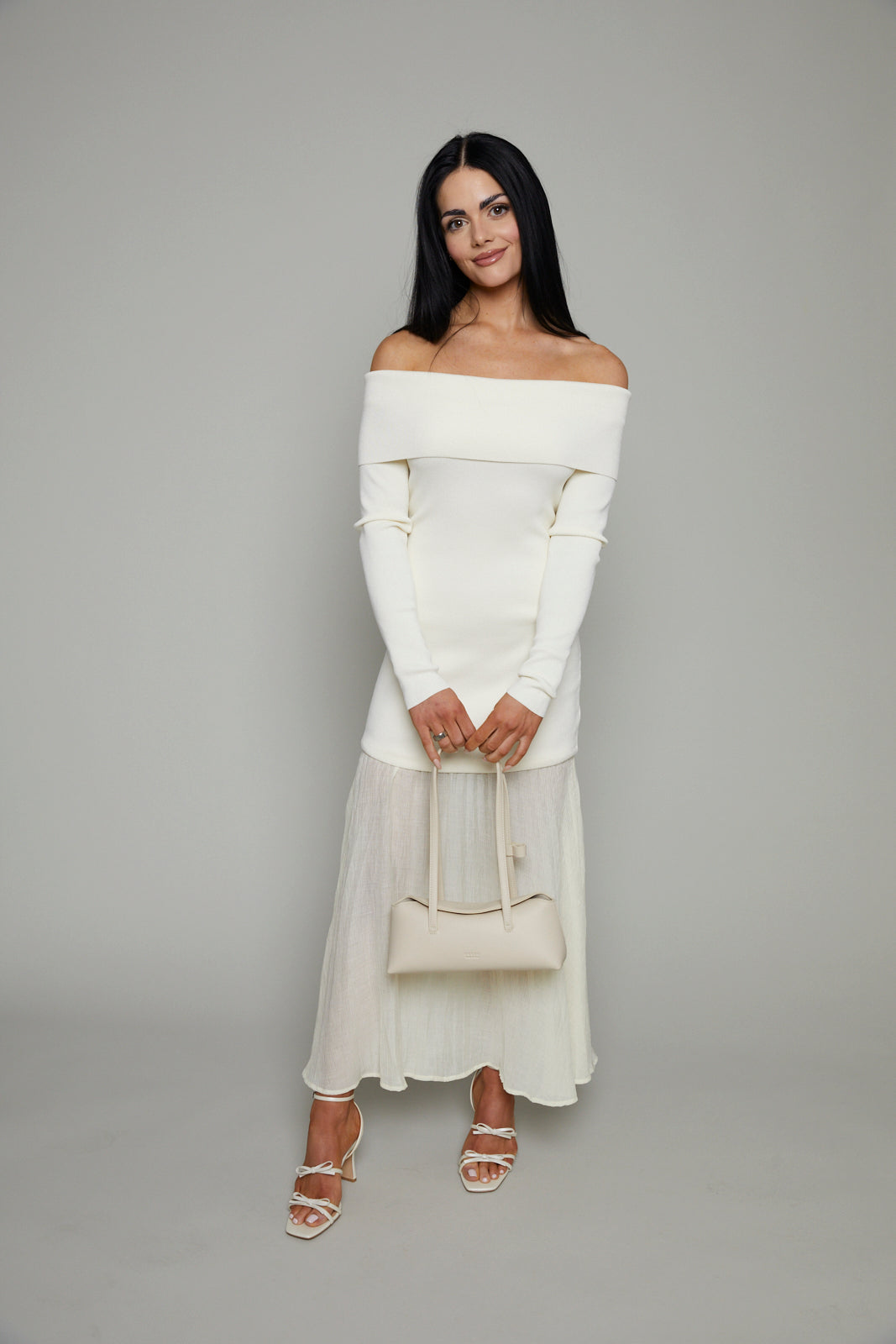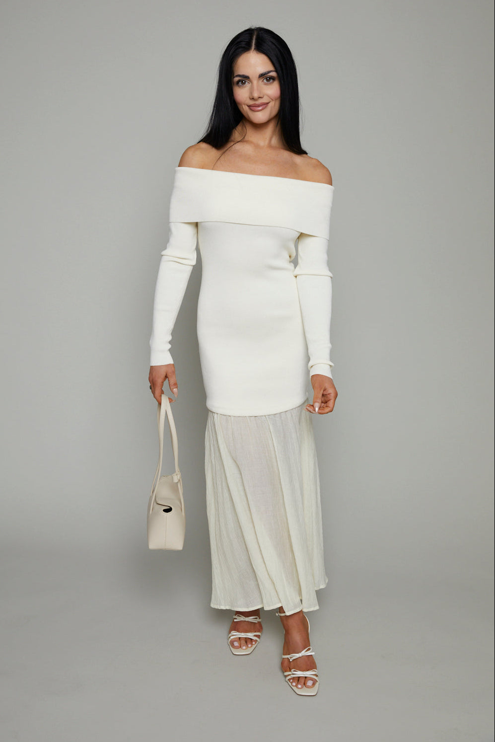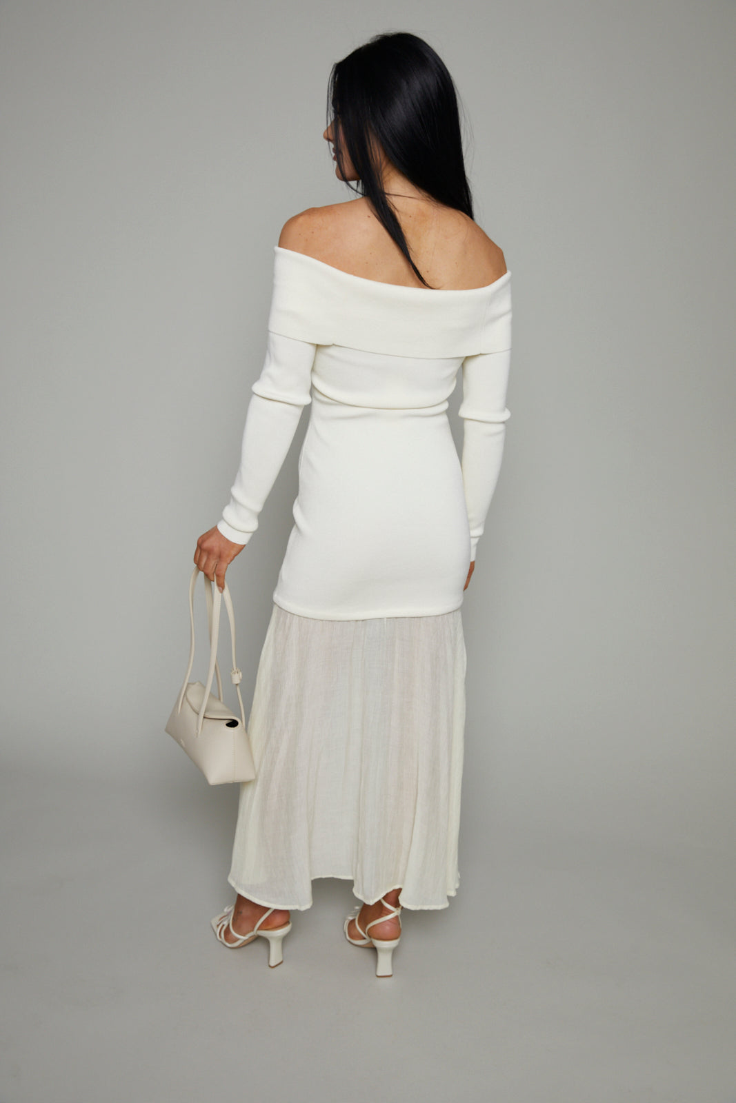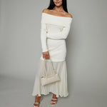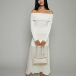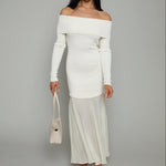- Off shoulder mixed media maxi dress