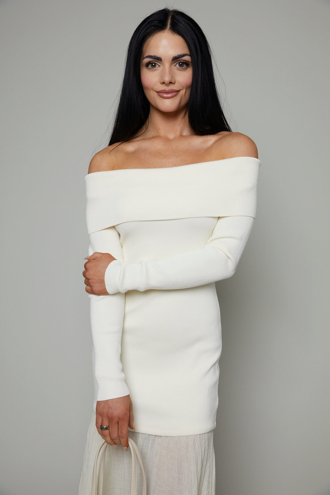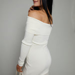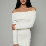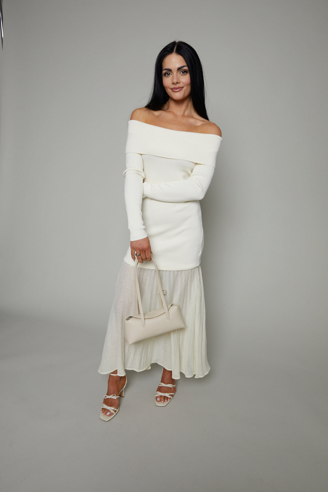 This off shoulder maxi dress features a soft ribbed knit body and delicate semi-sheer pleated skirt. Understatedly elegant, this dress is ideal for date nights, holiday parties or a night out with friends.