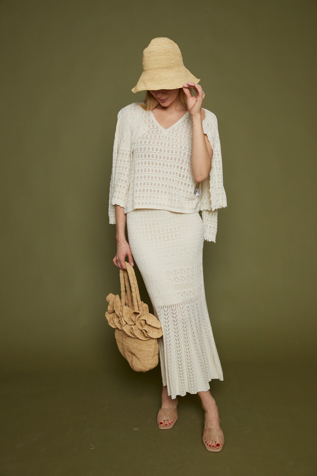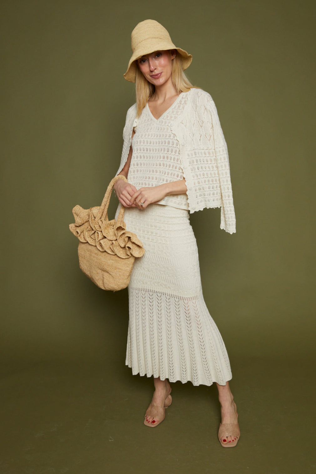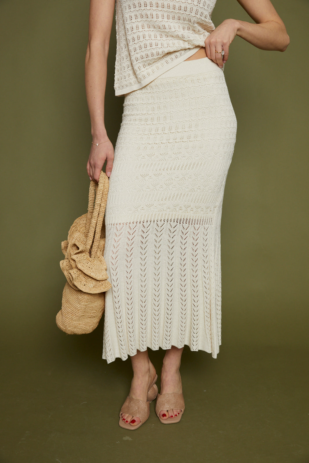 This mid-rise crochet midi skirt is the perfect mix of structure and flow, with a lined top half and a breezy flared bottom. Finished with an elastic waistband, it’s midweight and made to move with you all day long.