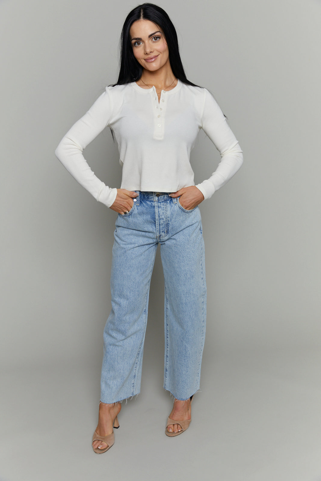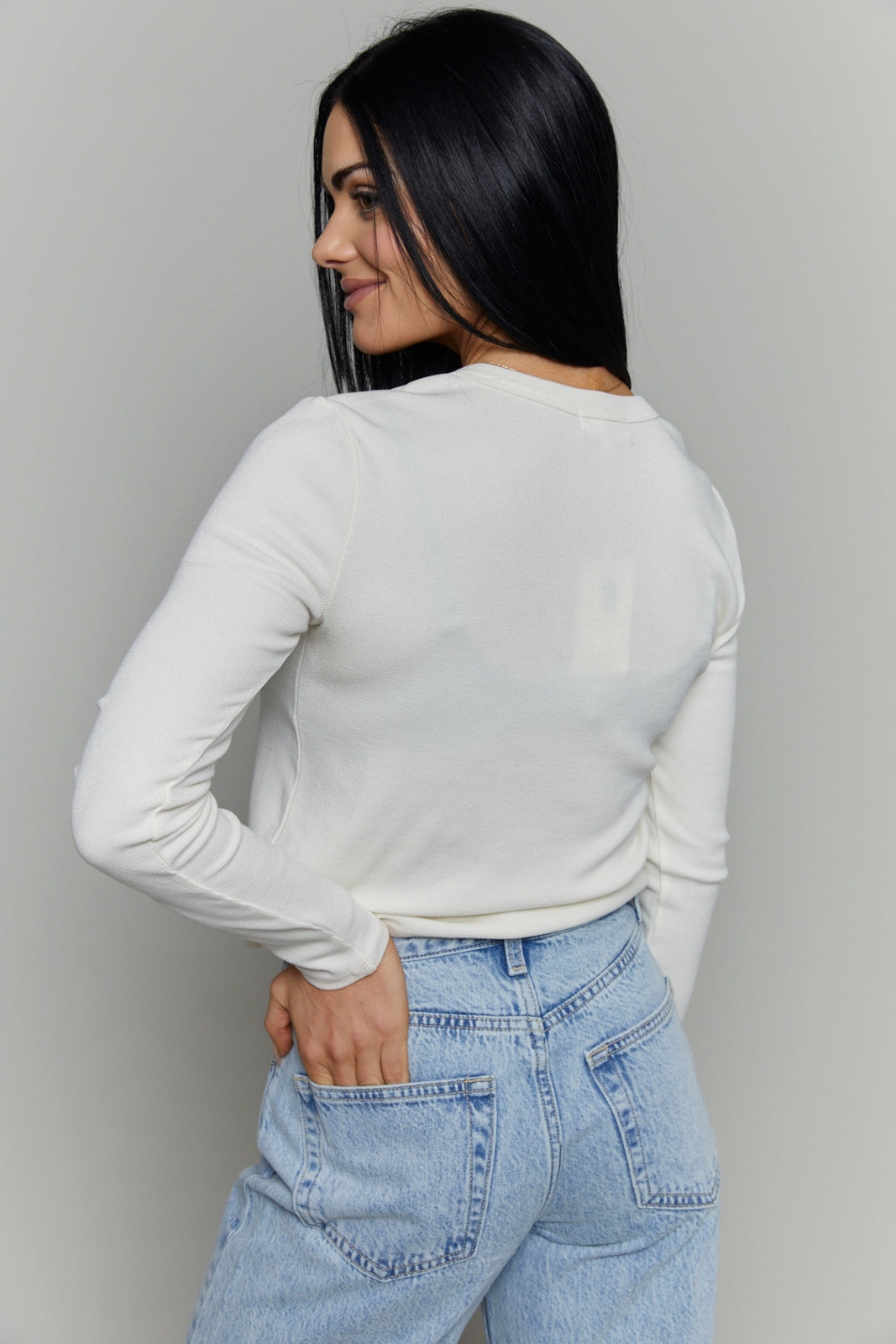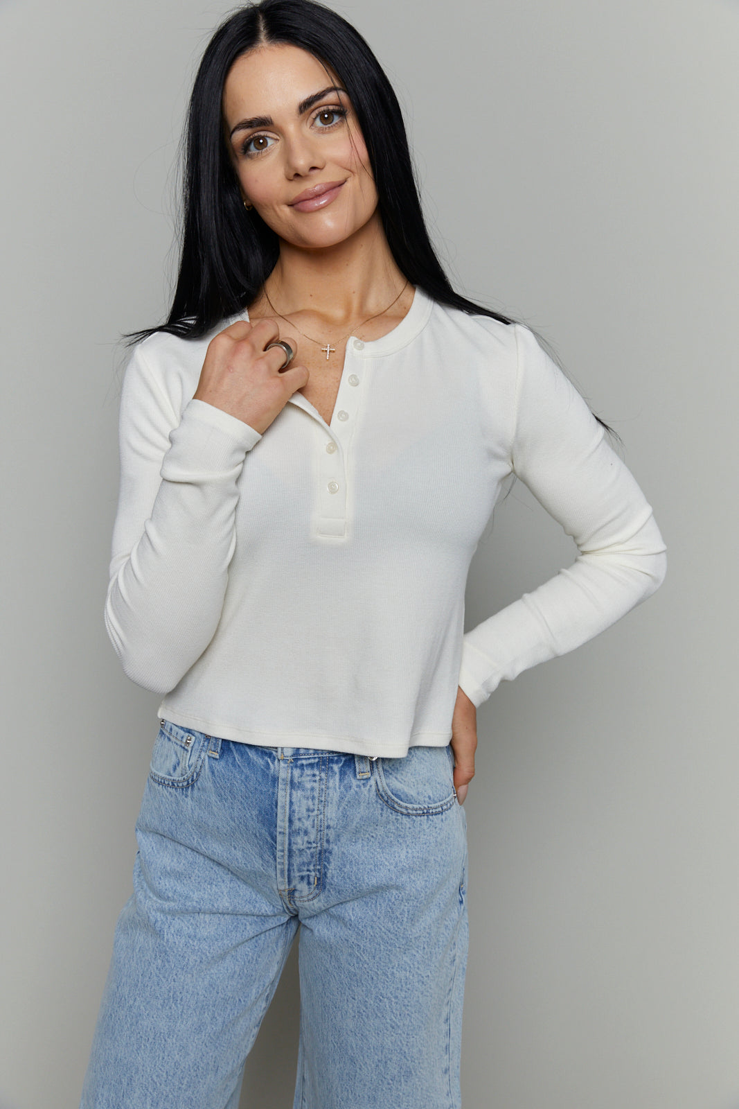 A slightly boxy, cropped henley that keeps things casual but polished. Made with a soft, slub rib knit and finished with a crew neckline, button front, and long sleeves, it’s the kind of top you’ll reach for on repeat.