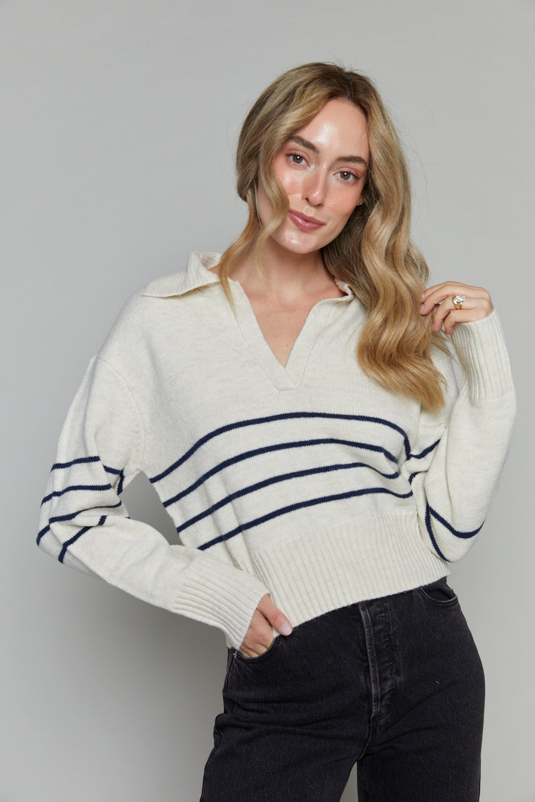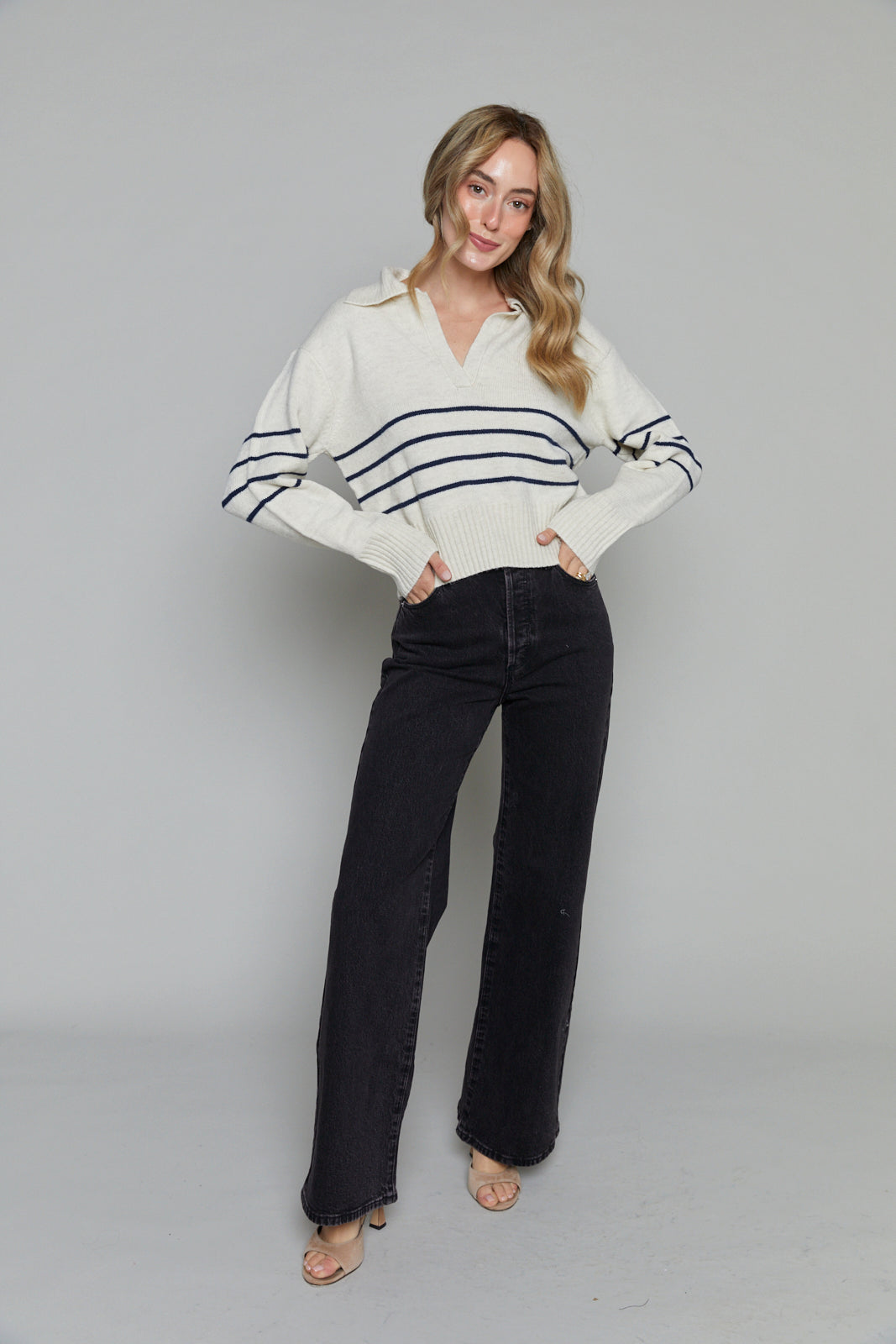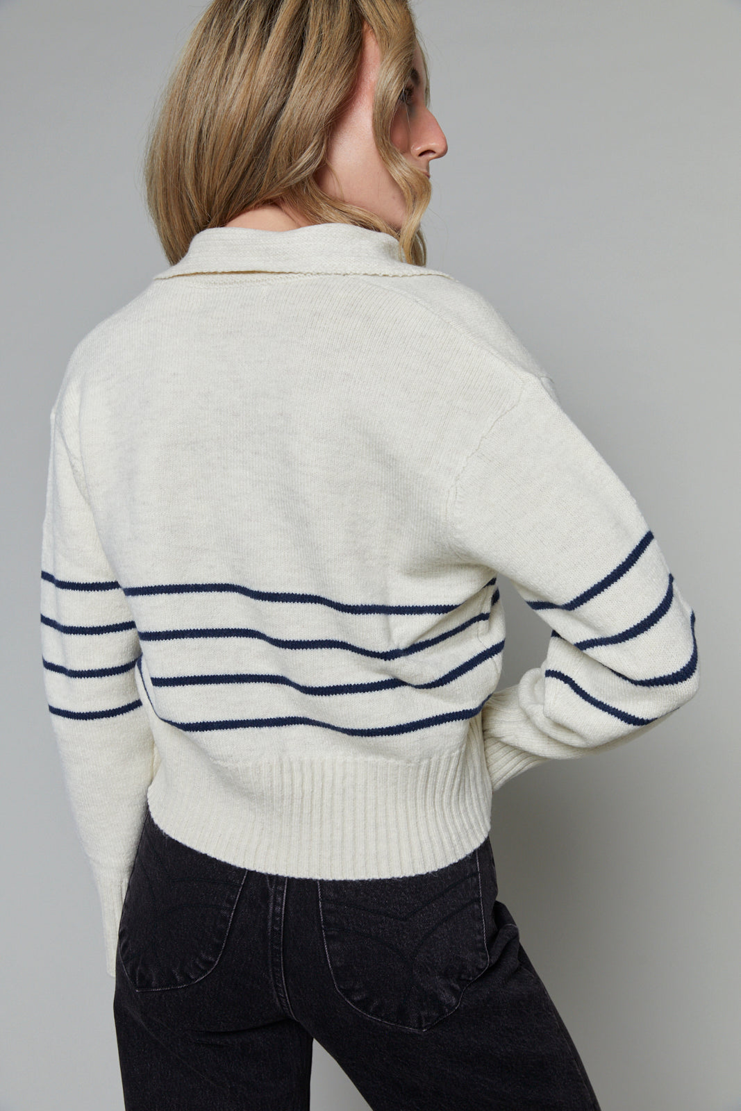 The Logan Rugby Knit is made from a thick yarn which has a soft hand feel. The silhouette is relaxed with long sleeves and length finishing at the hips. Features include a knitted stripe design, fully knitted rugby collar and a ribbed hemline and cuffs.
