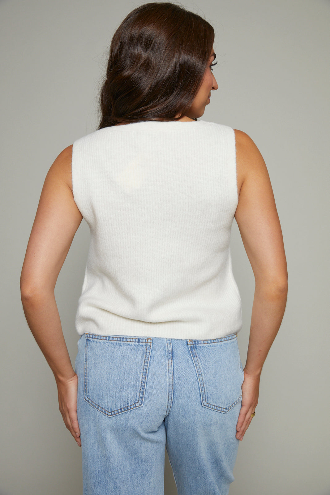 Designed in our soft Cozy Summer yarns, this sleeveless v-neck brings an airy weight and textured rib detailing. A standout piece that works solo in warm weather or layered as temps cool.