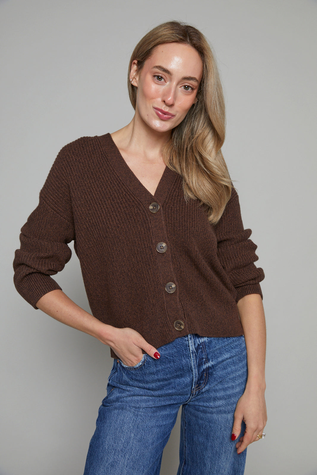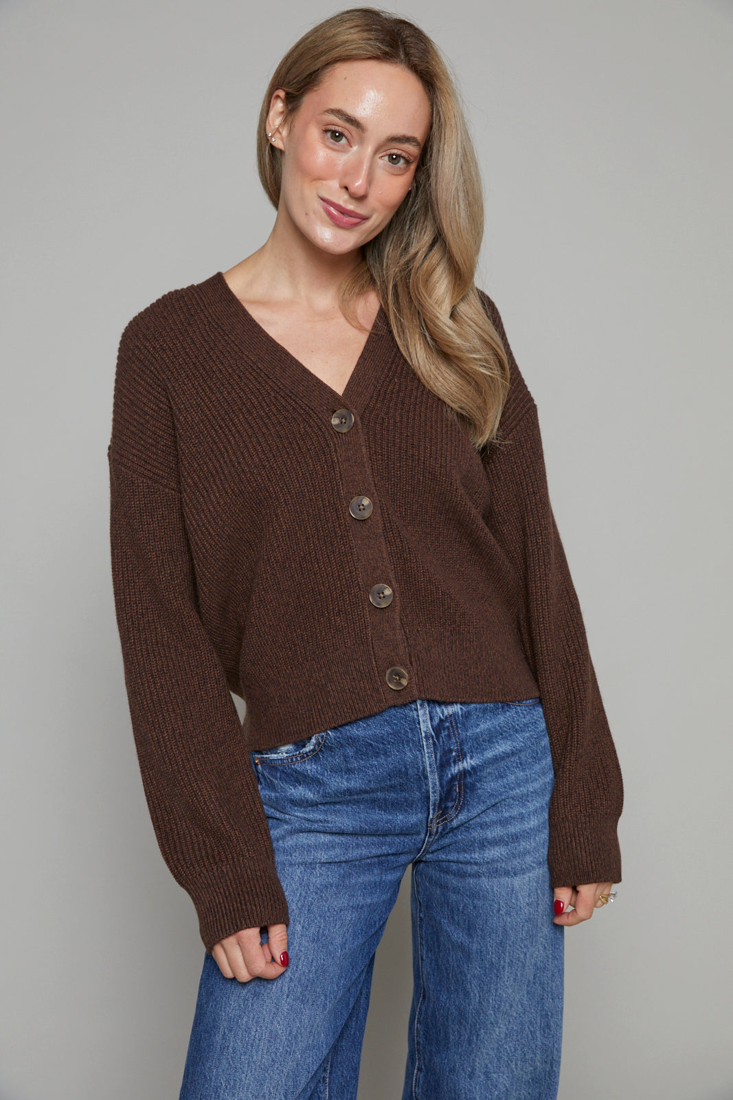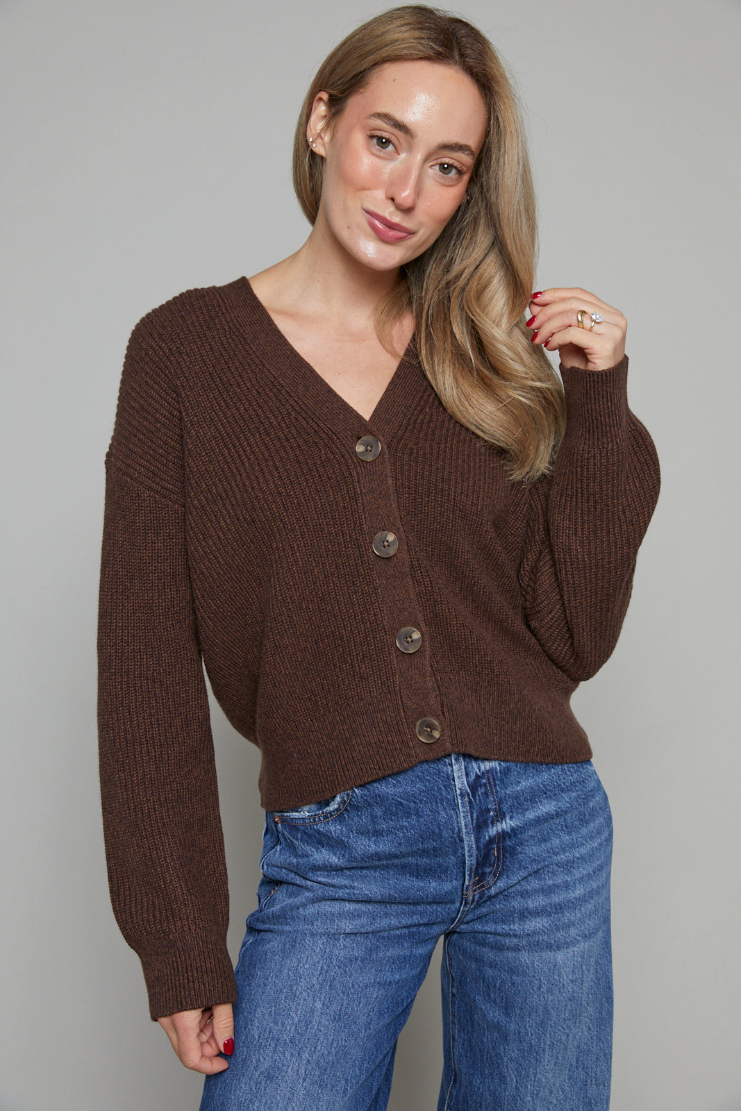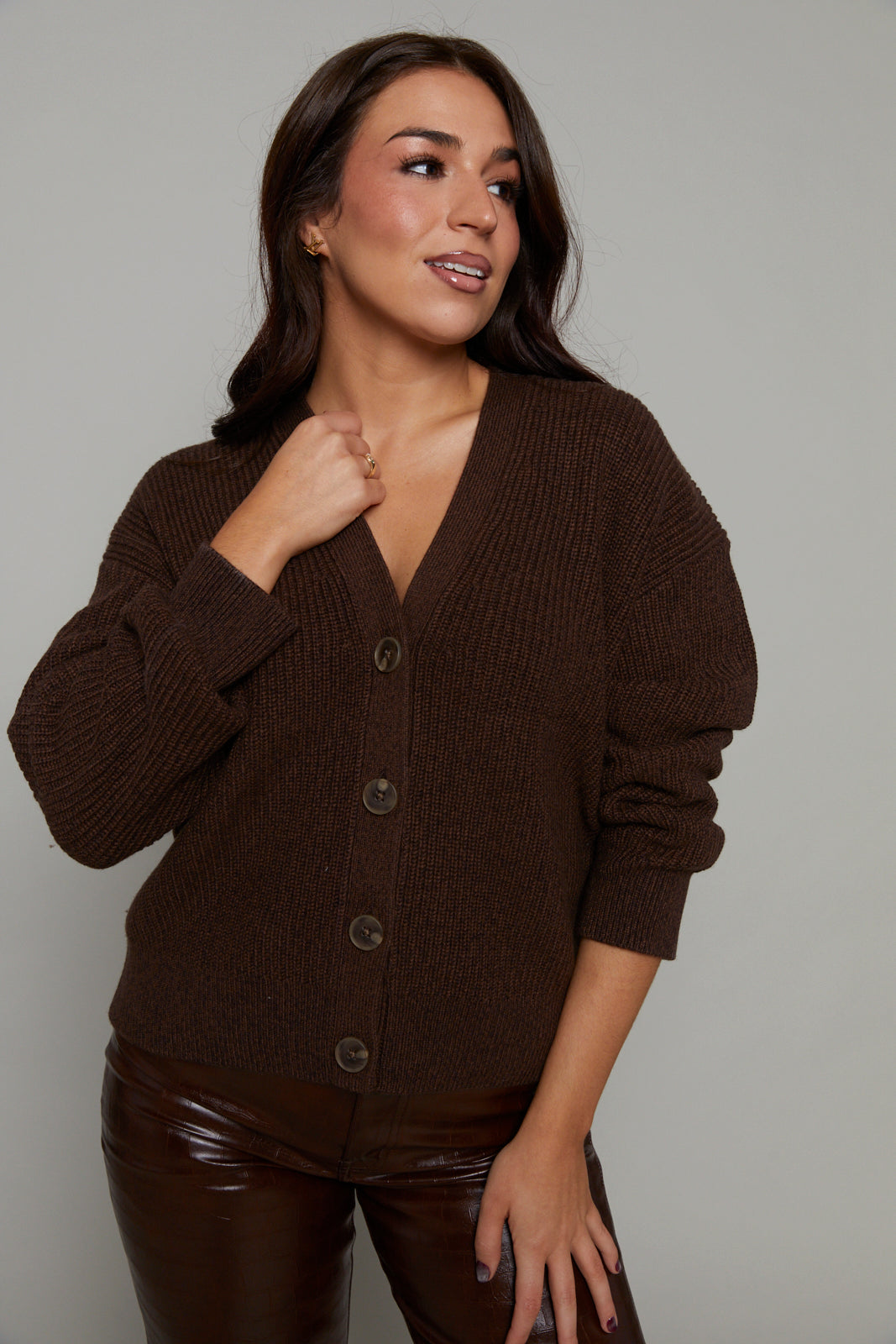 Wrap yourself in the cozy charm of the Carmina Relaxed V Neck Cardigan. With its rich chocolate hue and classic button-up design, this long-sleeve cardigan invites moments of comfort and calm. The soft fabric drapes effortlessly, creating a relaxed silhouette perfect for layering on crisp mornings or unwinding on quiet evenings.