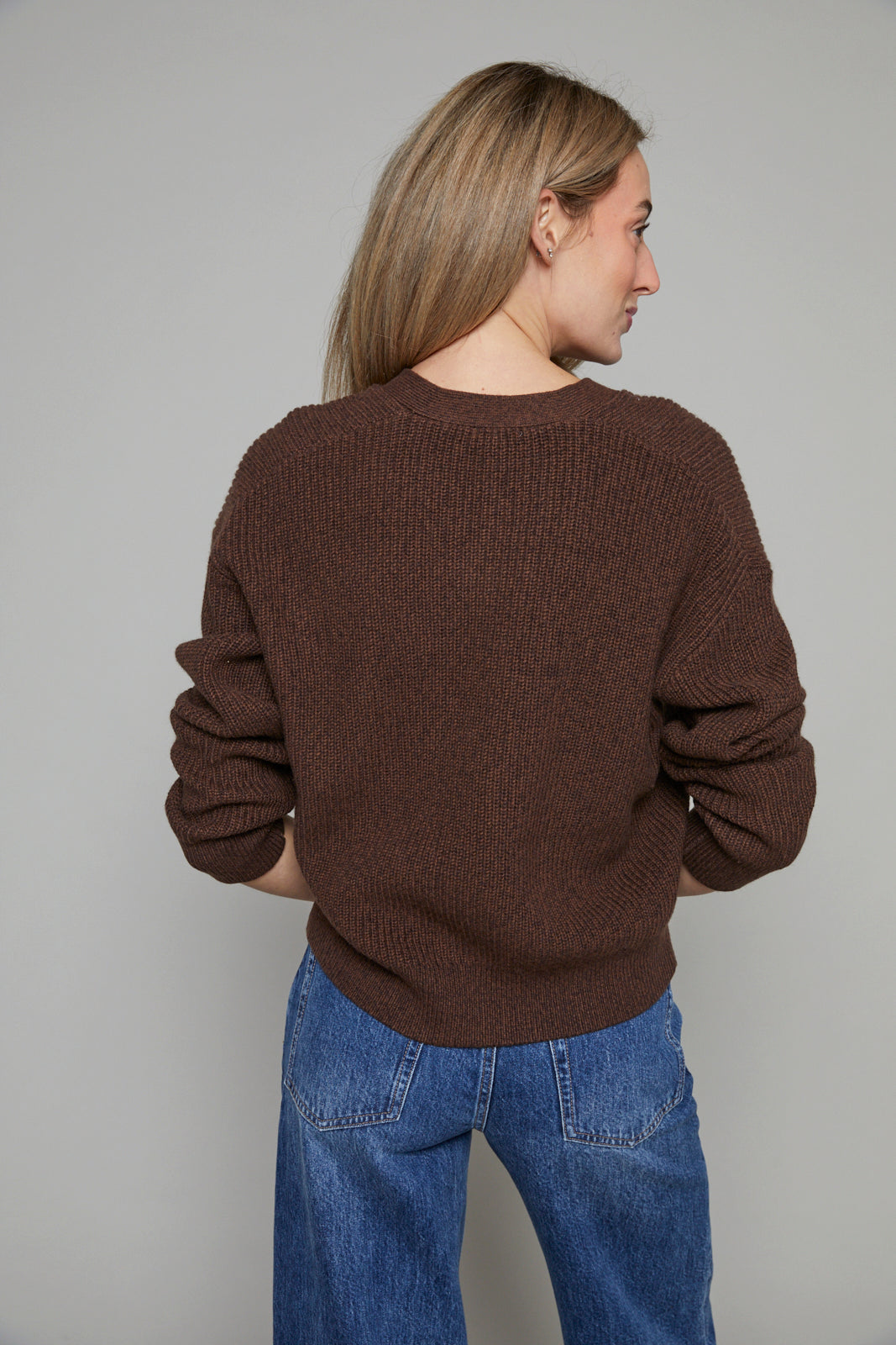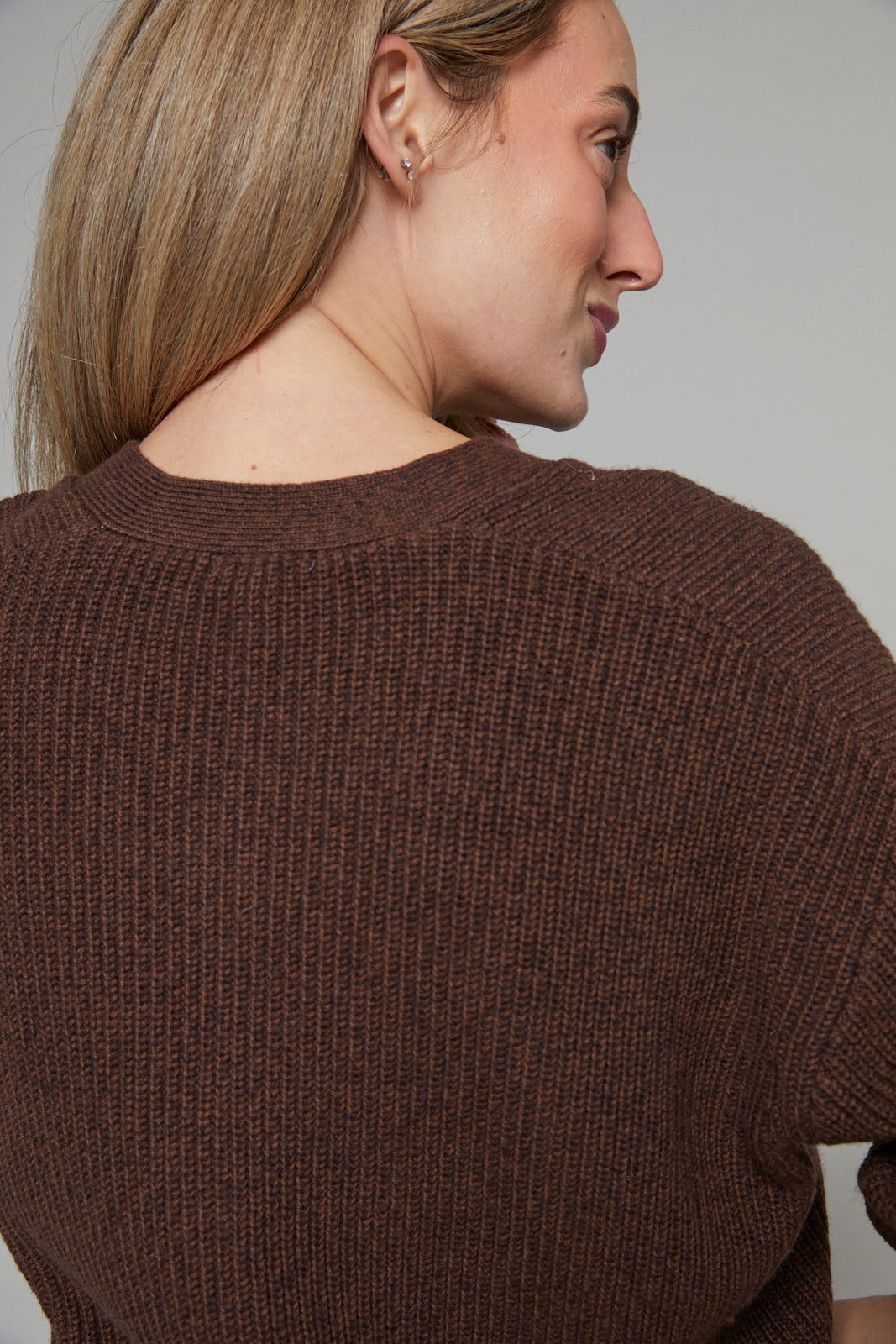 The cardigan has a beautiful, rich brown color and the texture is lovely. I also appreciate that it’s a blend with a high percentage of natural wool.