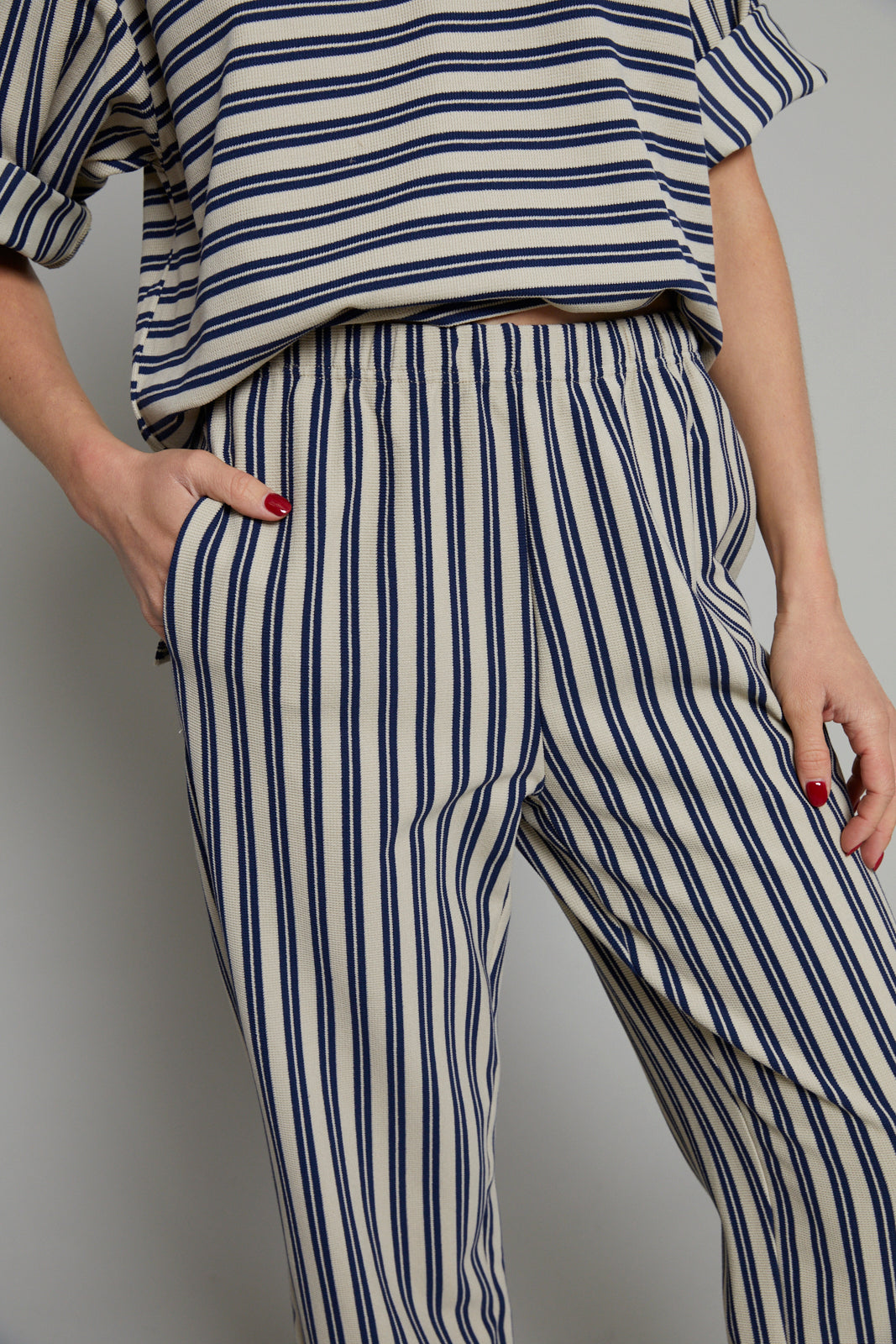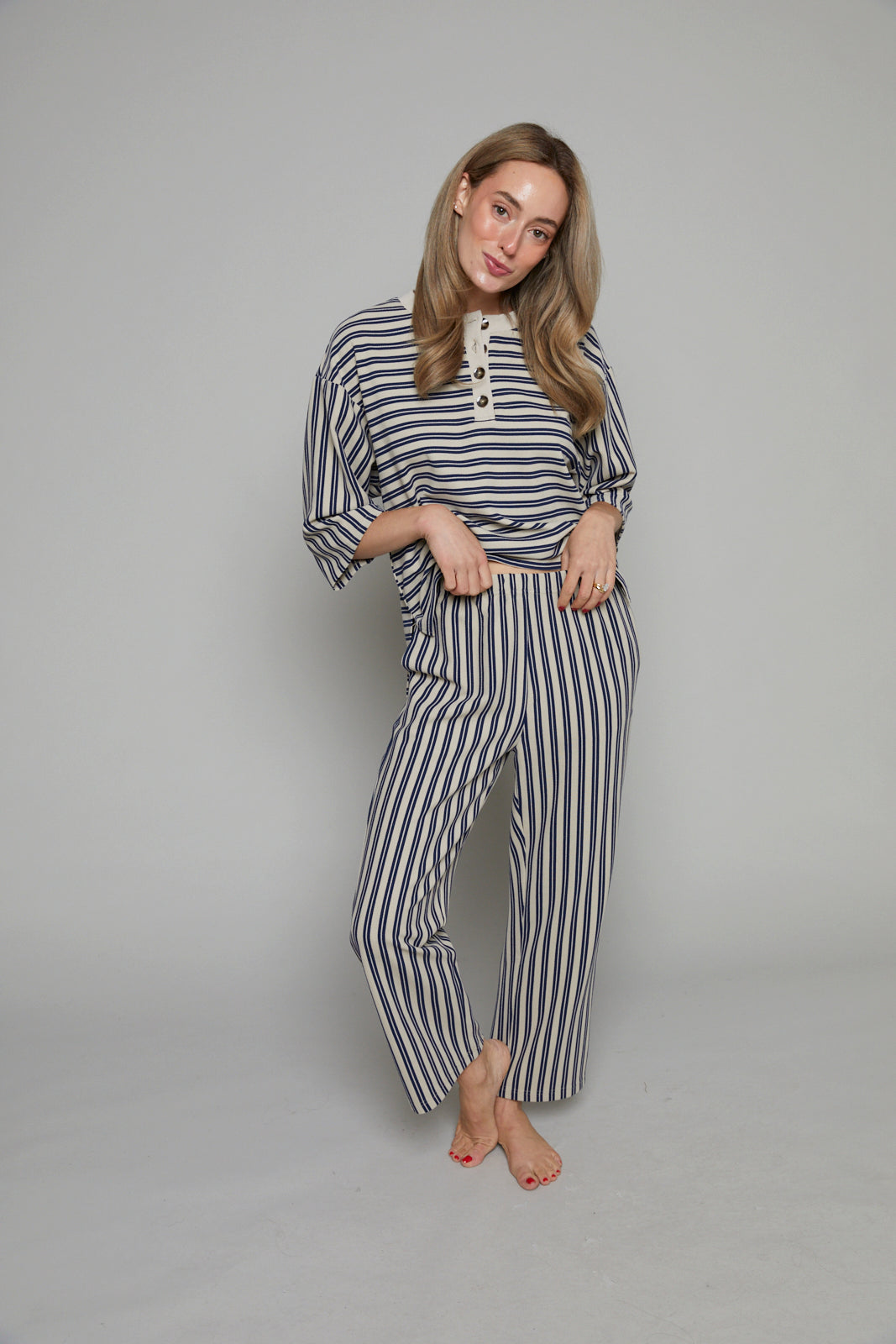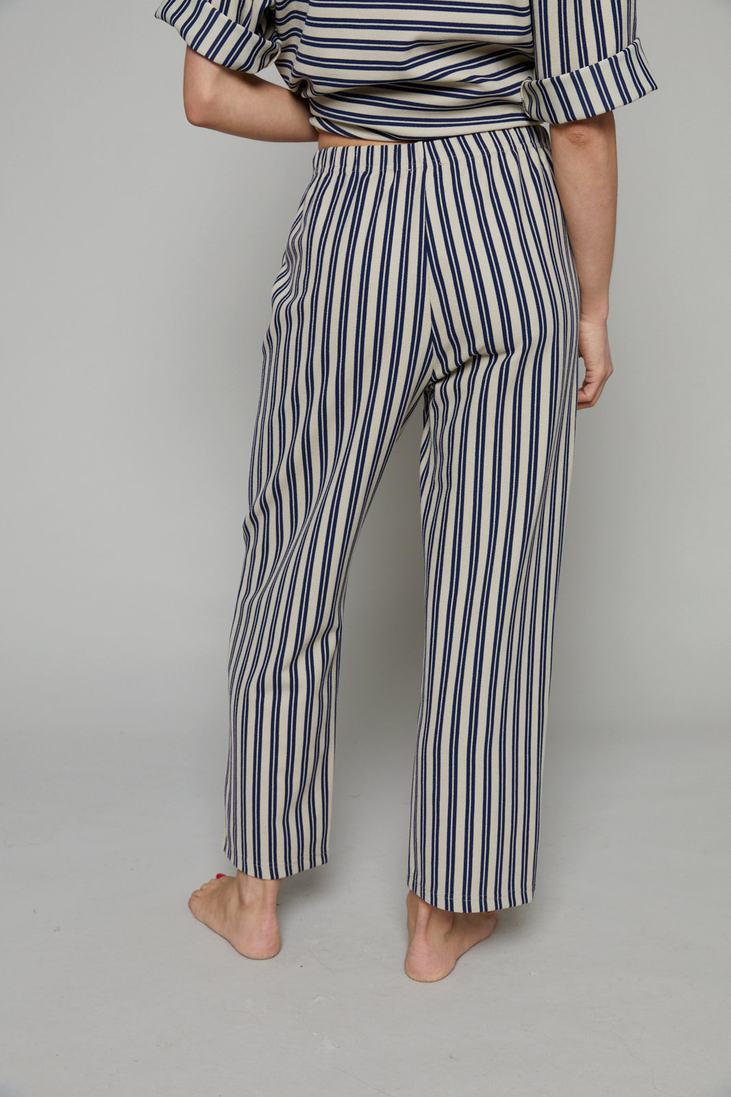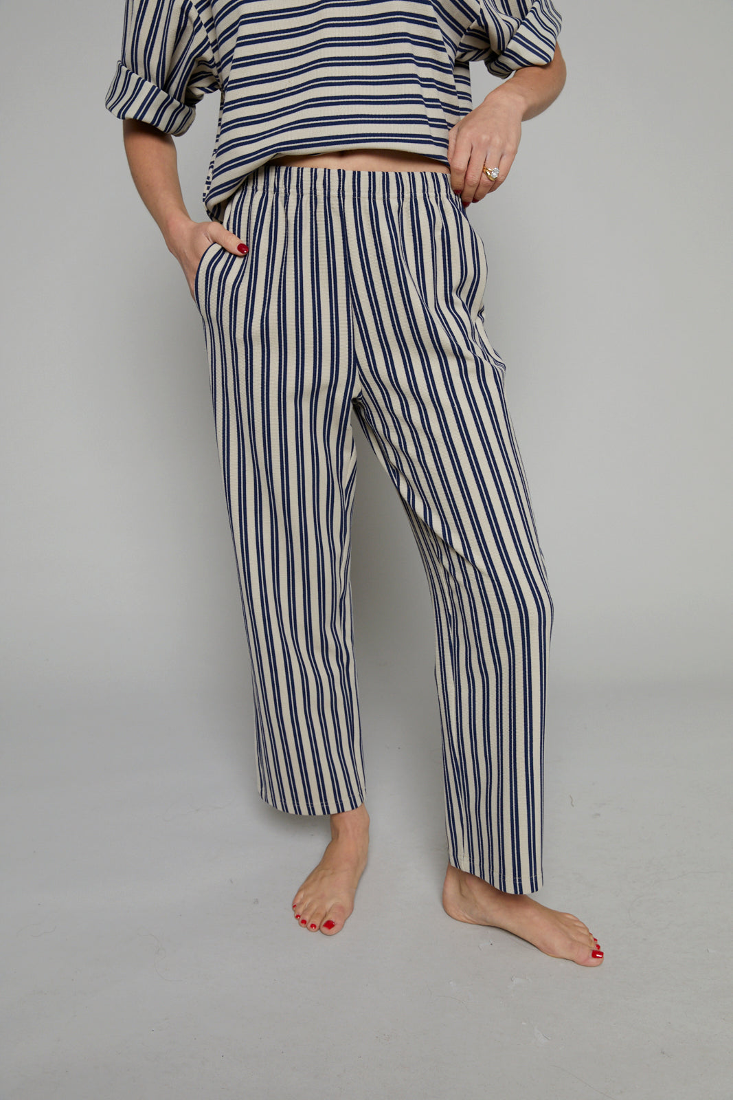 Elevate your casual style with the Catherine straight-leg relaxed fit pants, designed for ultimate comfort and versatility. Featuring a smocked elastic waistband and convenient side pockets, these pants are crafted from a soft Navy/Taupe vertical stripe fabric that adds a chic touch to any outfit. Perfect for lounging or running errands.