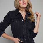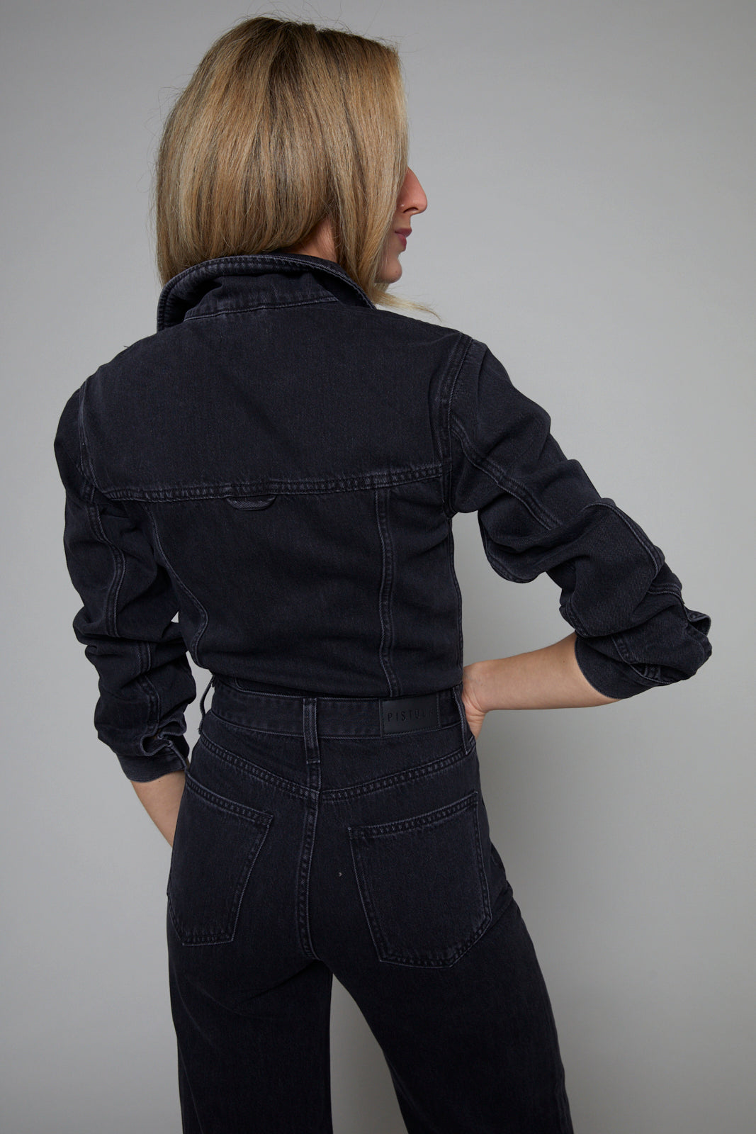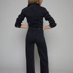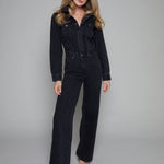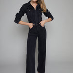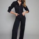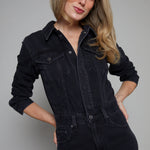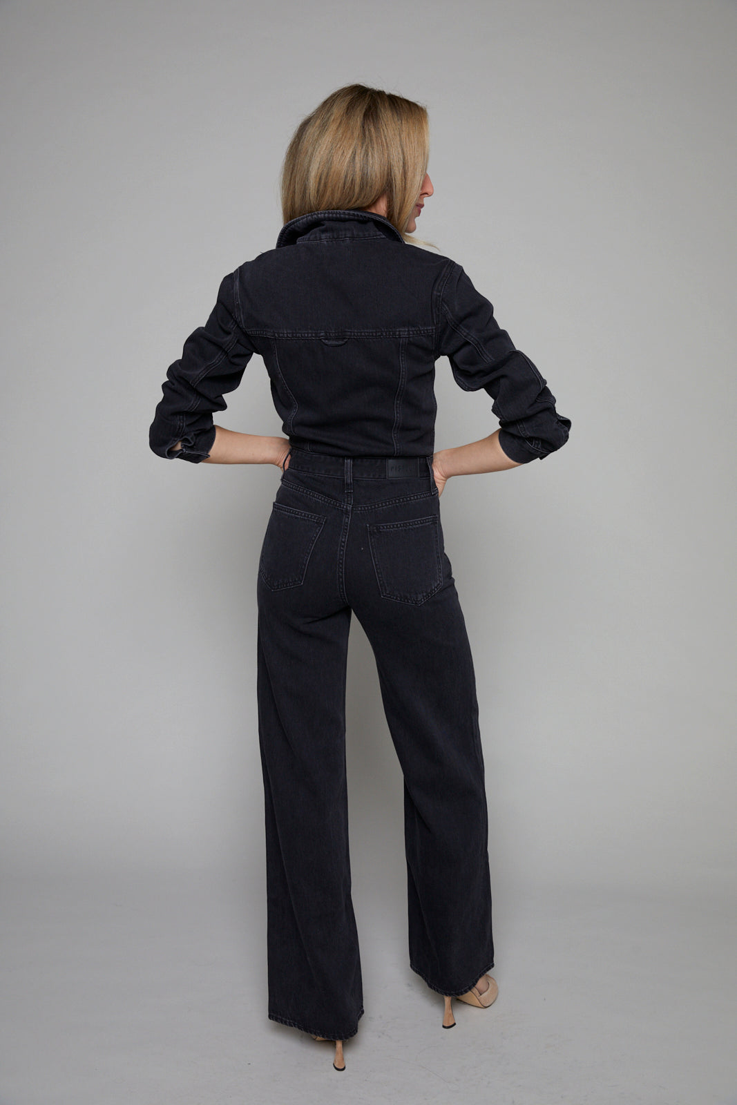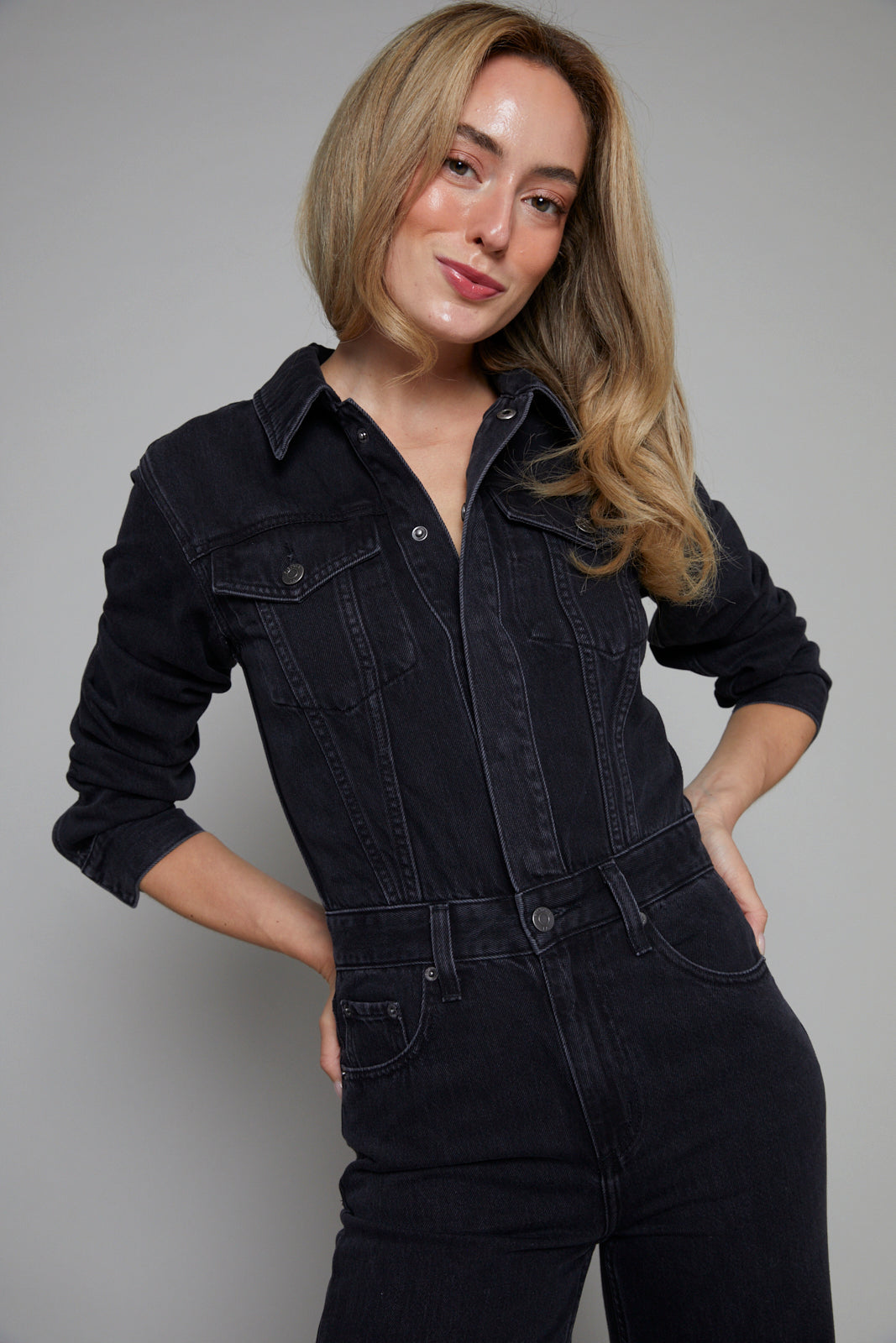 Longsleeve denim jumpsuit with collared neckline and concealed snap button front closure. Five pocket denim design details with a wide leg silhouette and clean finished look. Front flap pockets and directional seaming. Slope is a washed black denim hue with tonal stitching and chrome hardware accents.