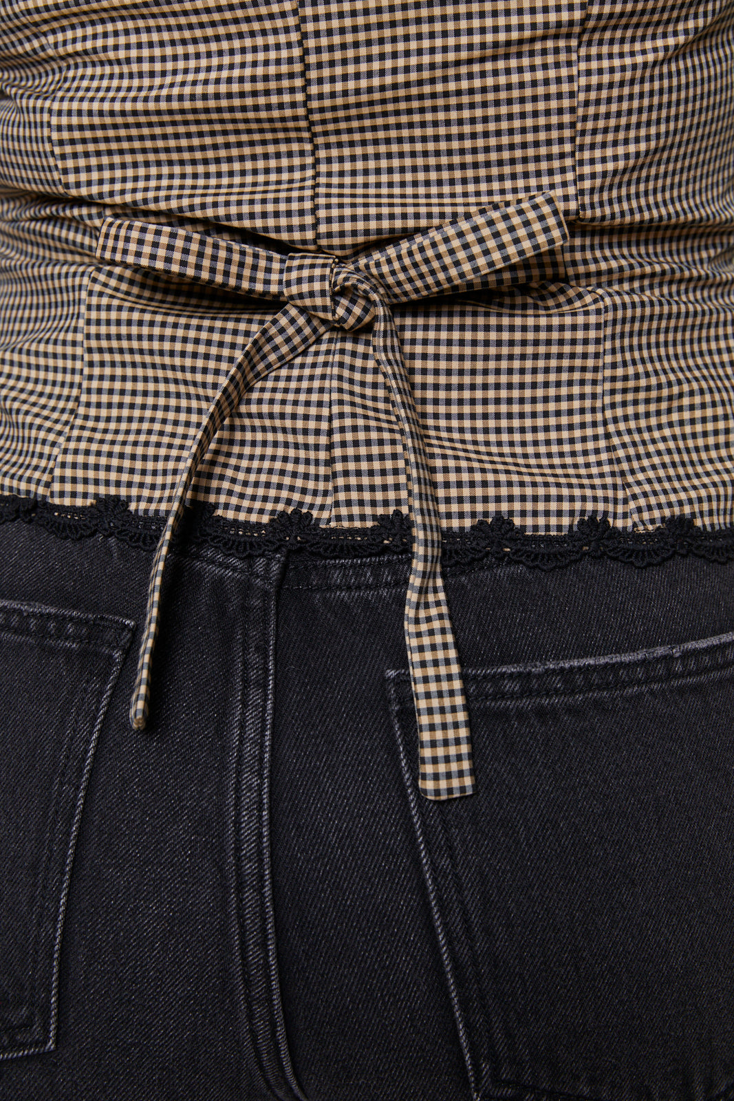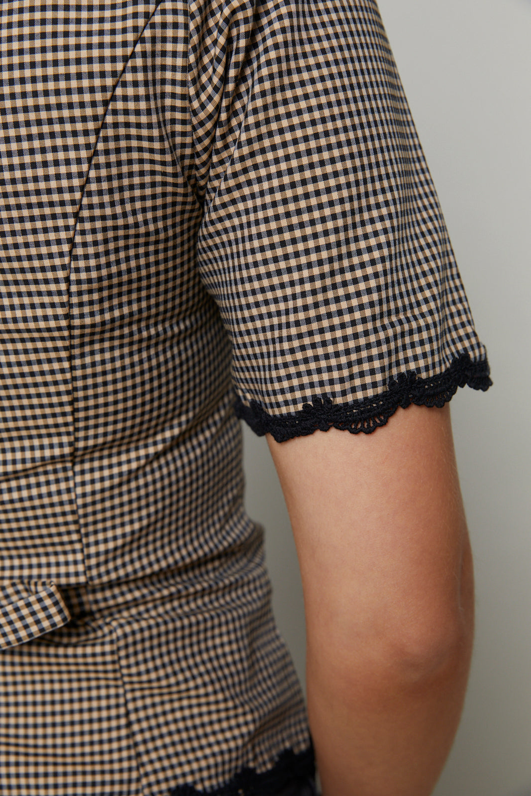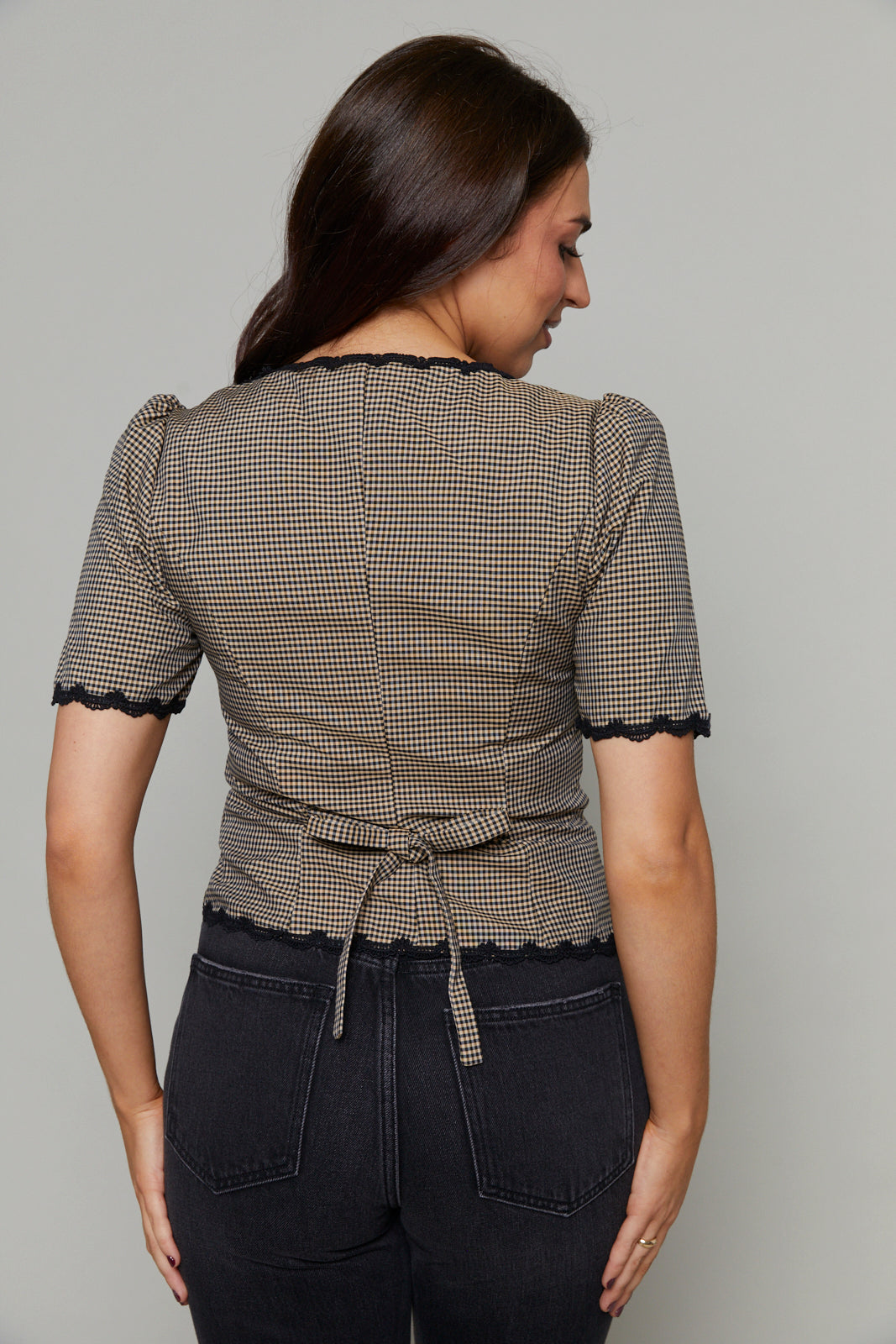 and delicate scallop trim along the sleeves and hem. - Button front - Scallop trim detailing - Fitted bodice - Square neckline - Short sleeves with subtle puff