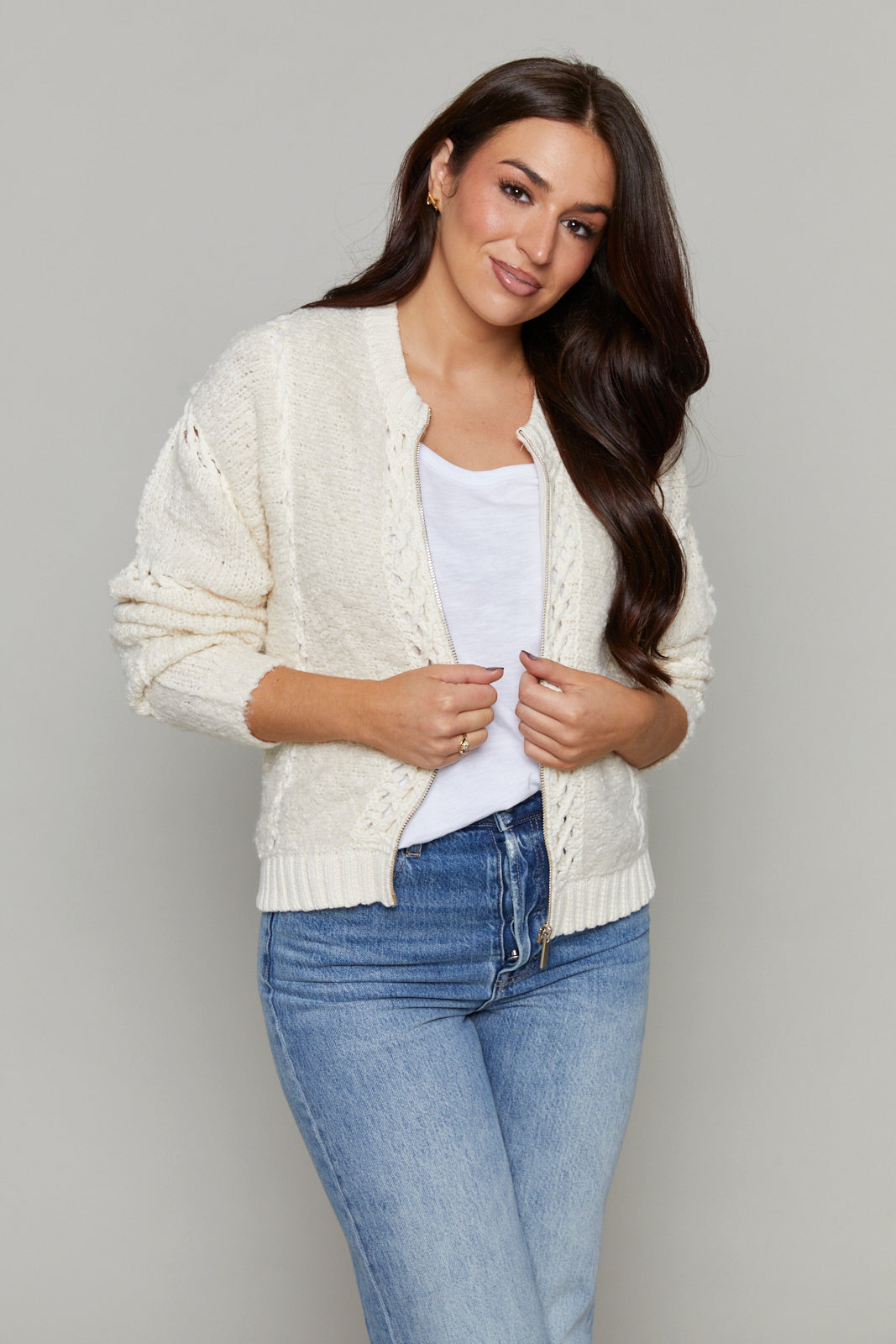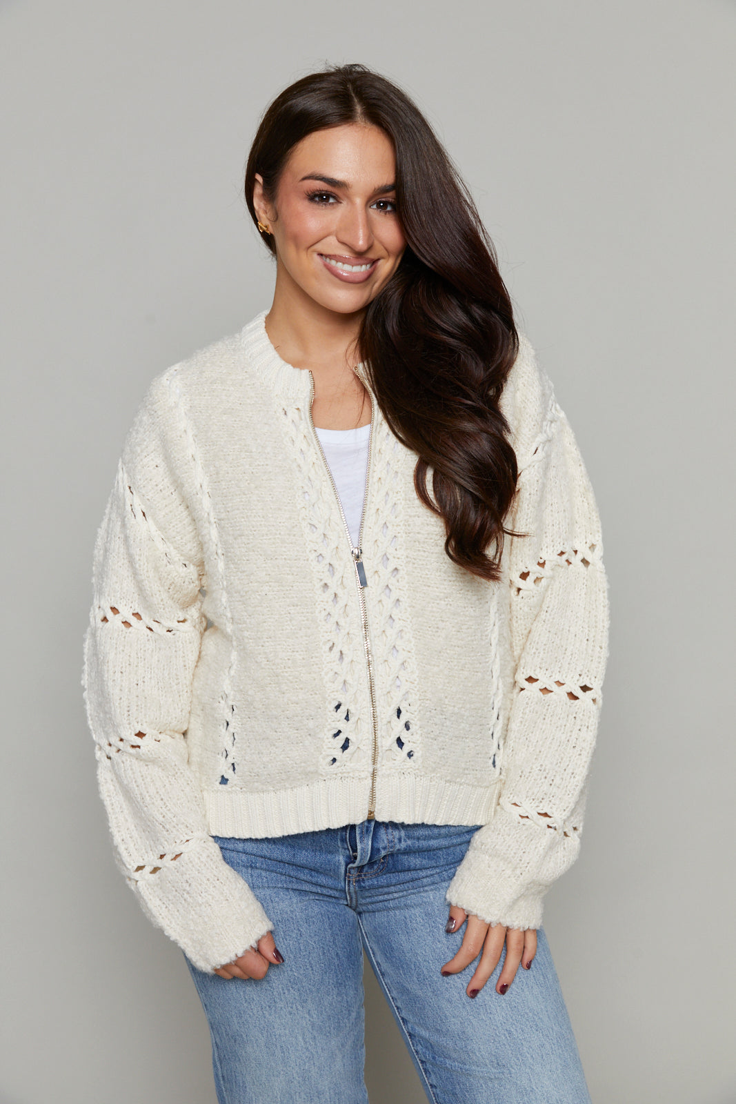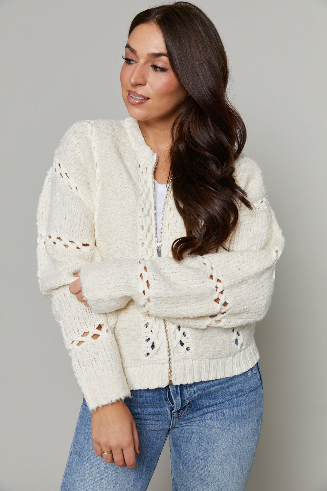 Soft texture meets delicate details in this zip-up sweater, crafted from plush, high-pile yarns and finished with intricate crochet insets and ribbed trim. It’s a feel-good layer that adds polish to any look.