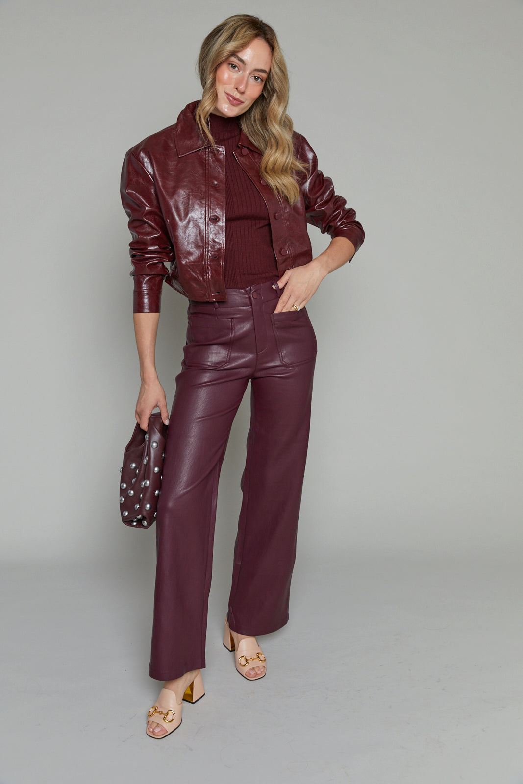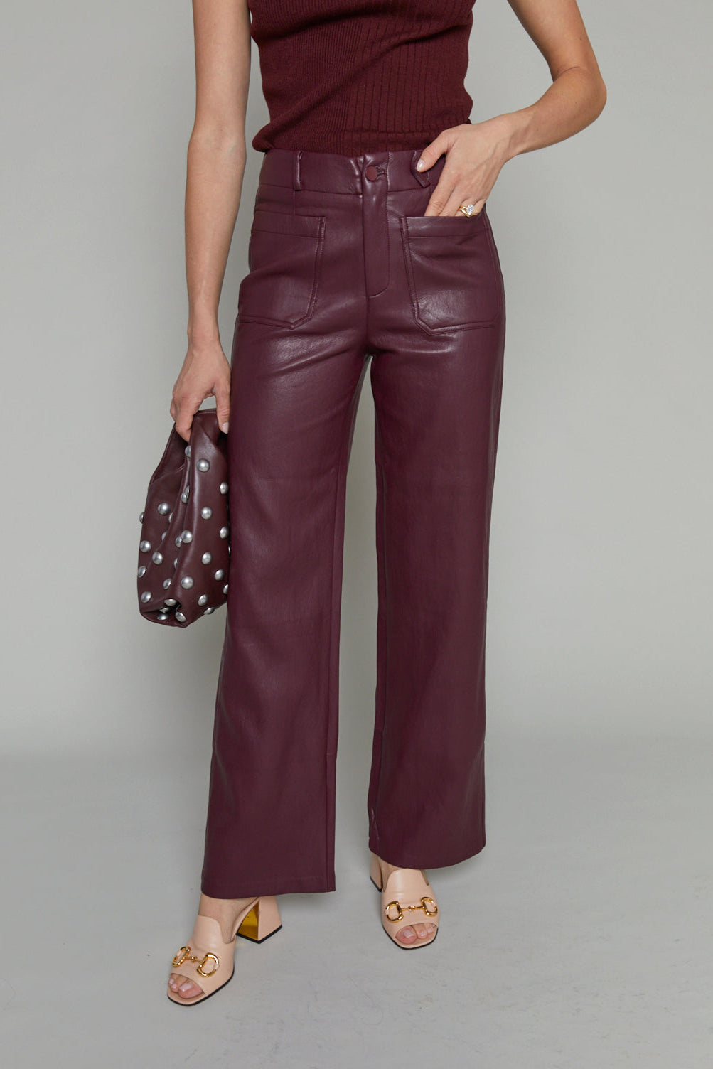 Slip into the rich burgundy hue of the Leanne Faux Leather Pants and feel the perfect blend of bold style and comfort. Their sleek, supple texture offers the allure of leather with an easygoing touch, making them a wardrobe staple.