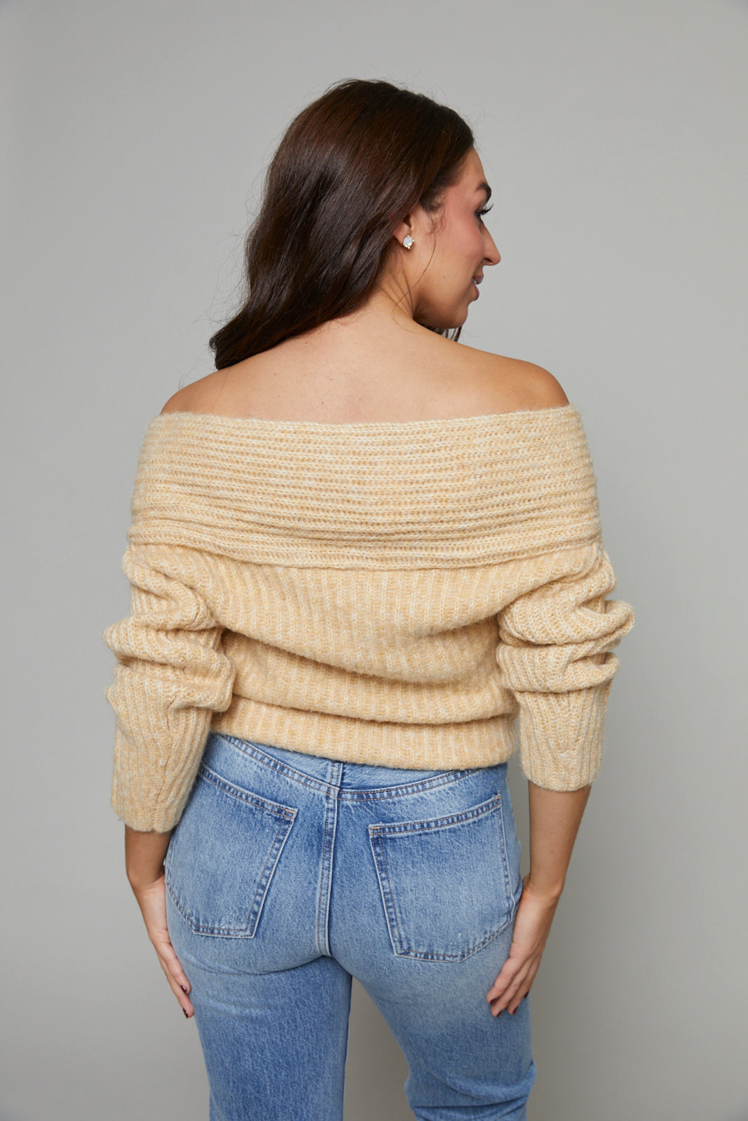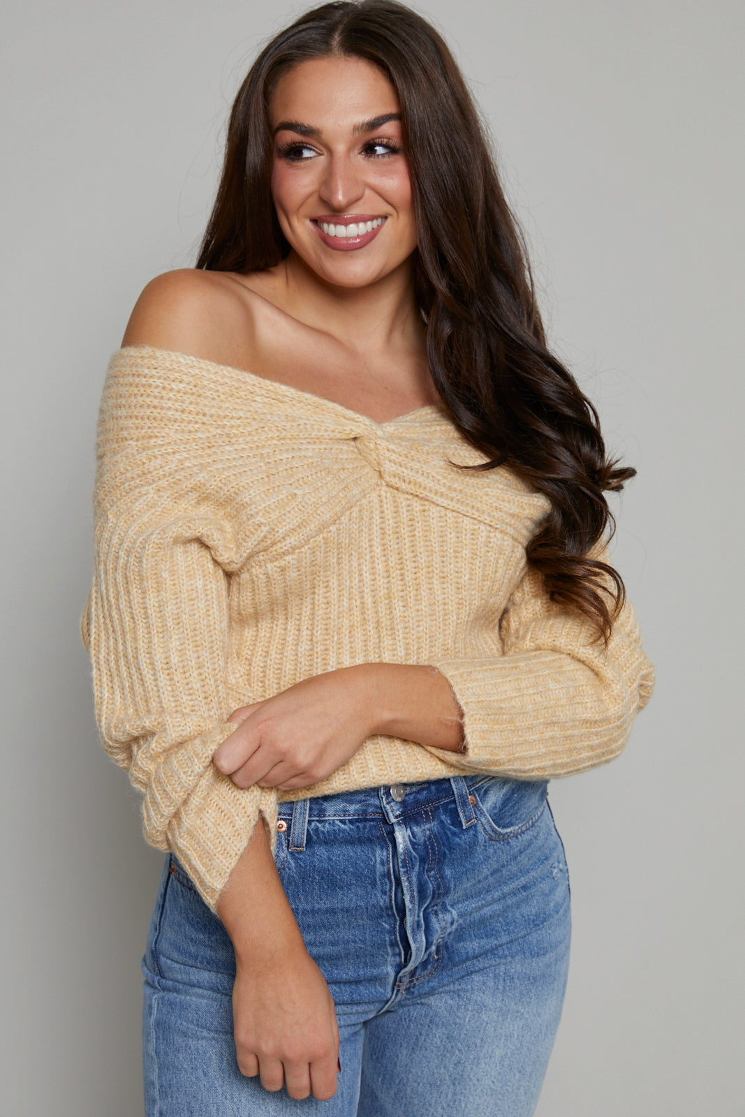 A twisted front brings graceful drape to this wool-kissed sweater designed to be slung off the shoulders.