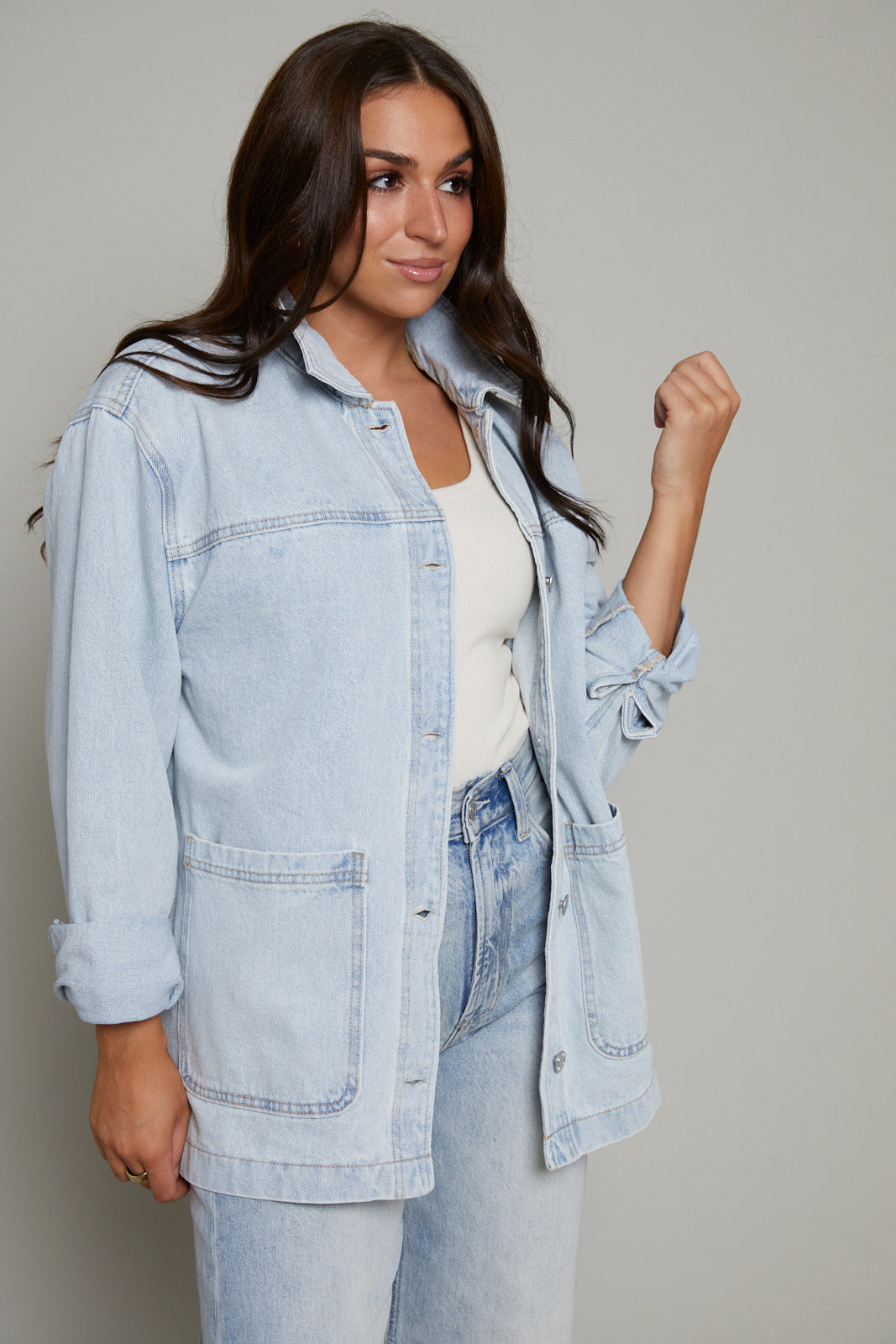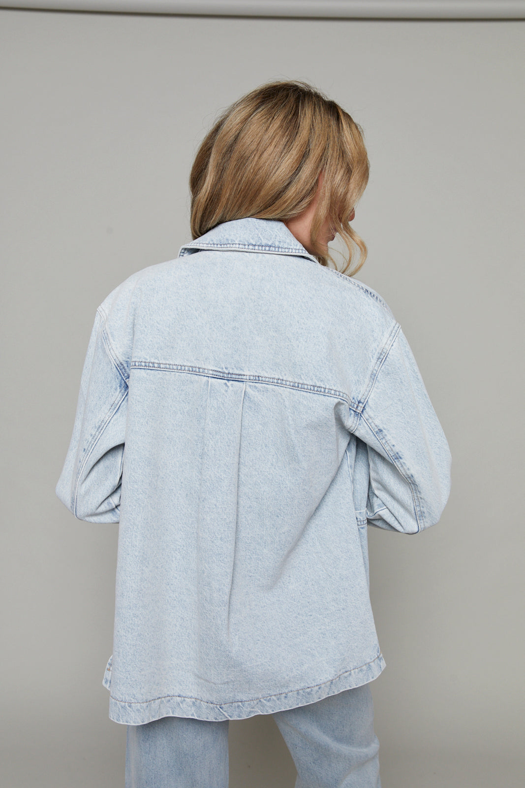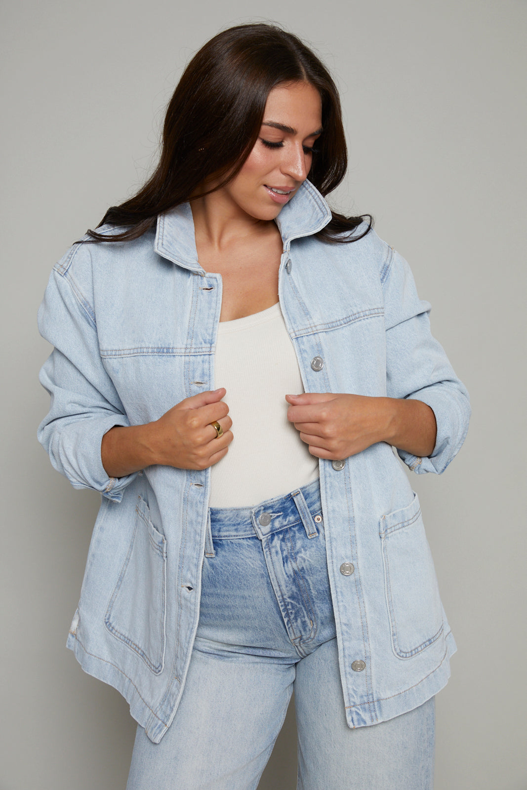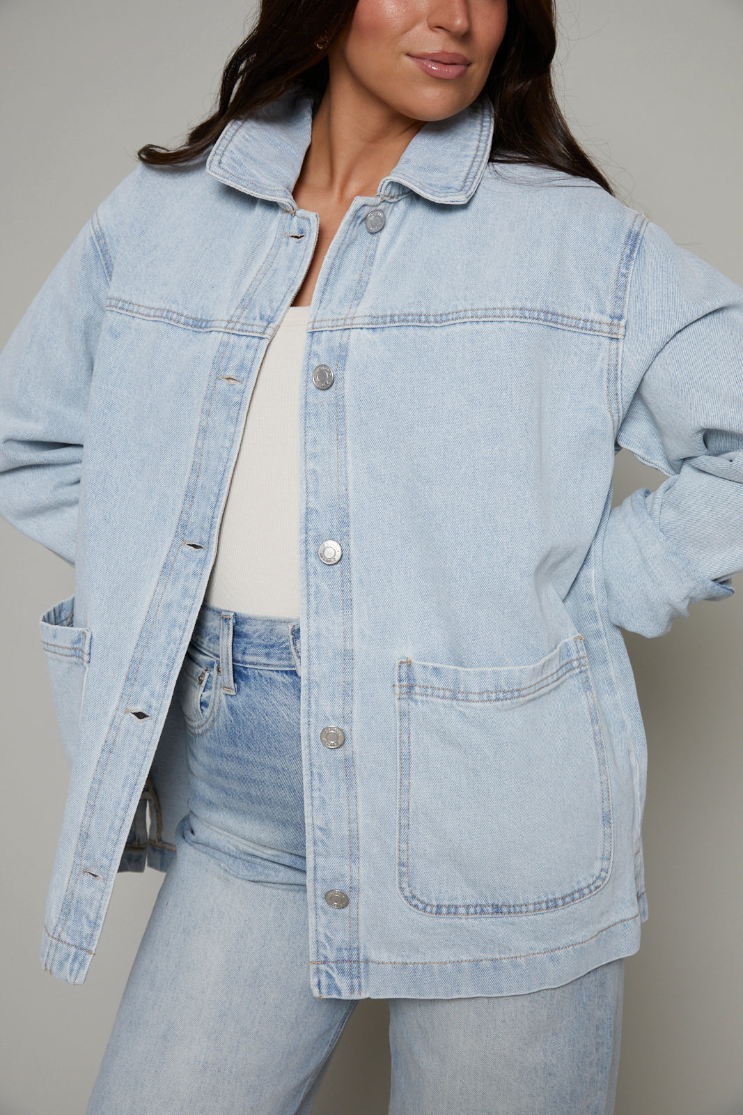 This collared jacket has patch pockets and a button front closure. The easy oversized fit and midweight feel make it a must-have for layered looks.