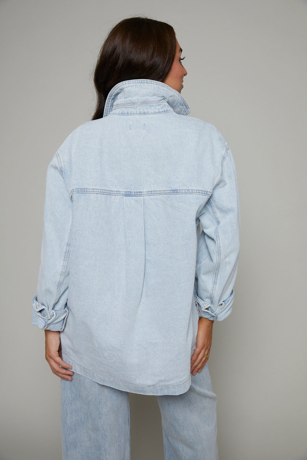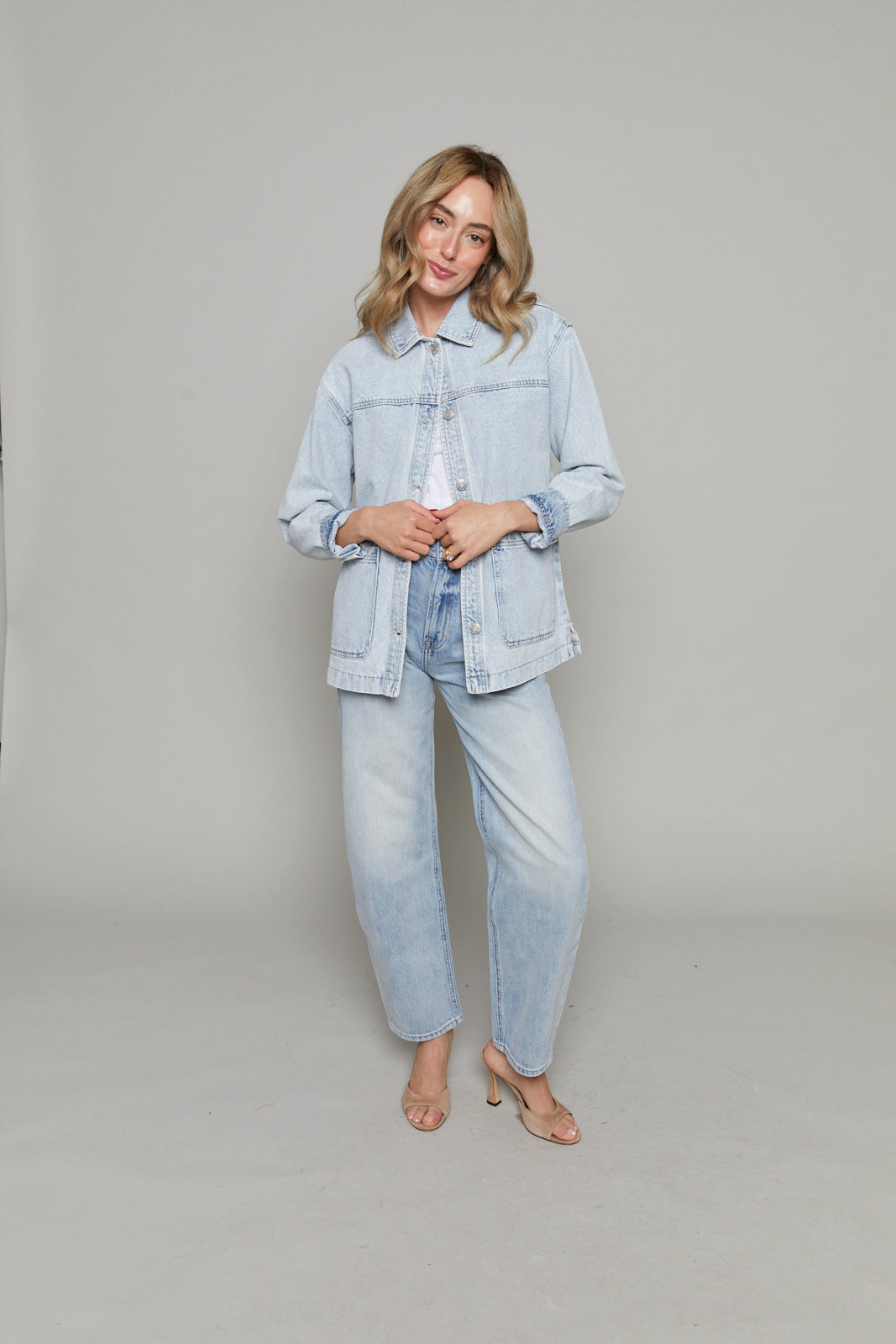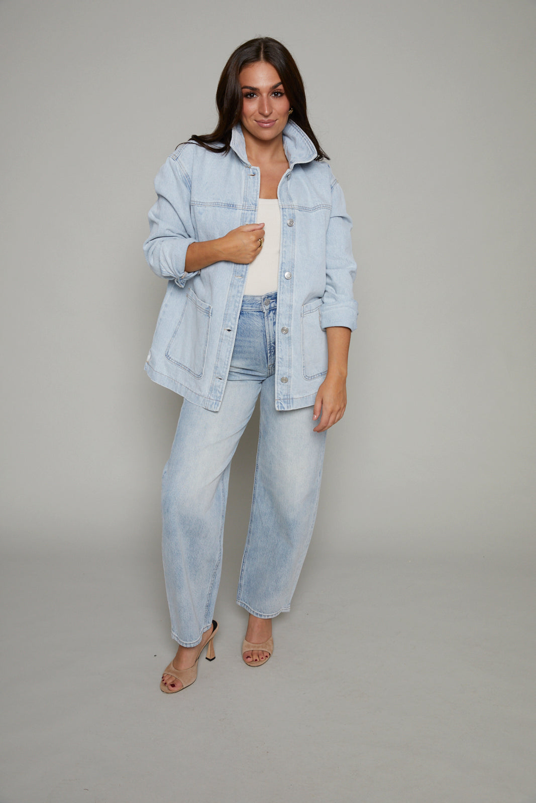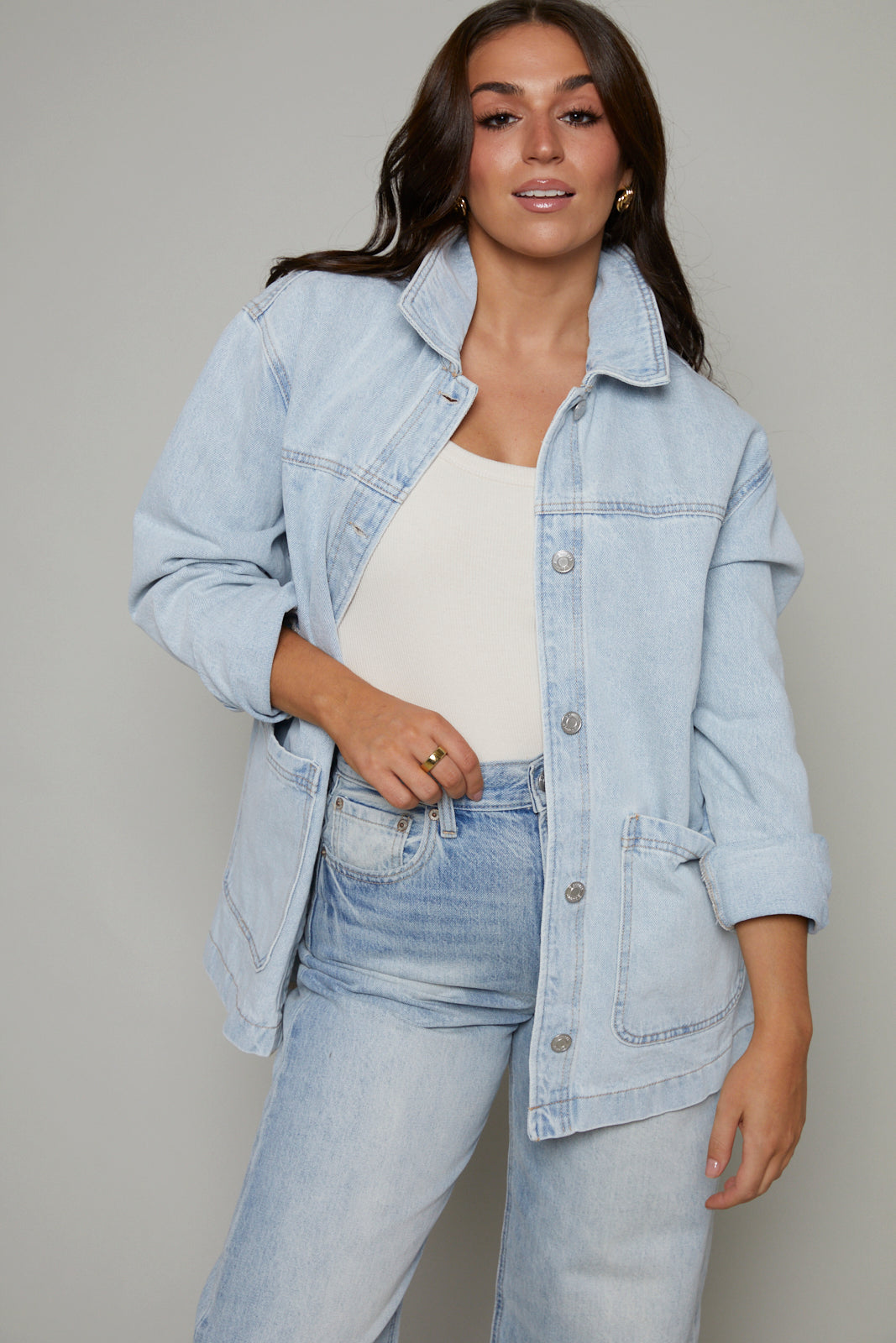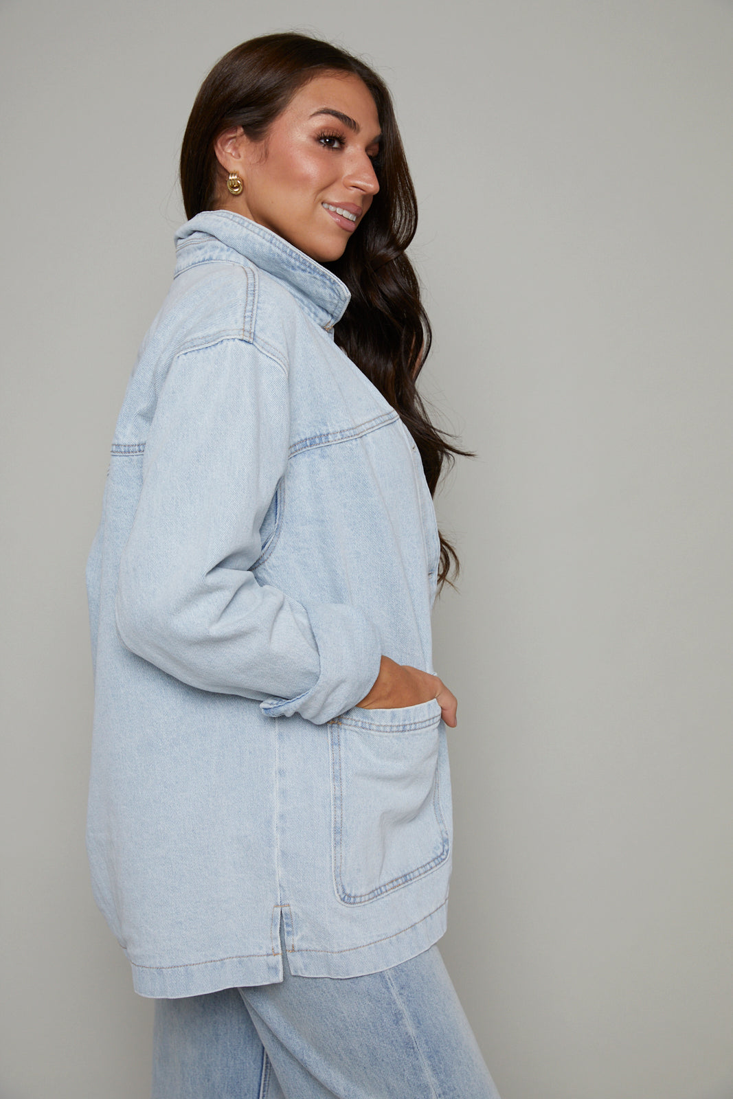 This collared jacket has patch pockets and a button front closure. The easy oversized fit and midweight feel make it a must-have for layered looks.