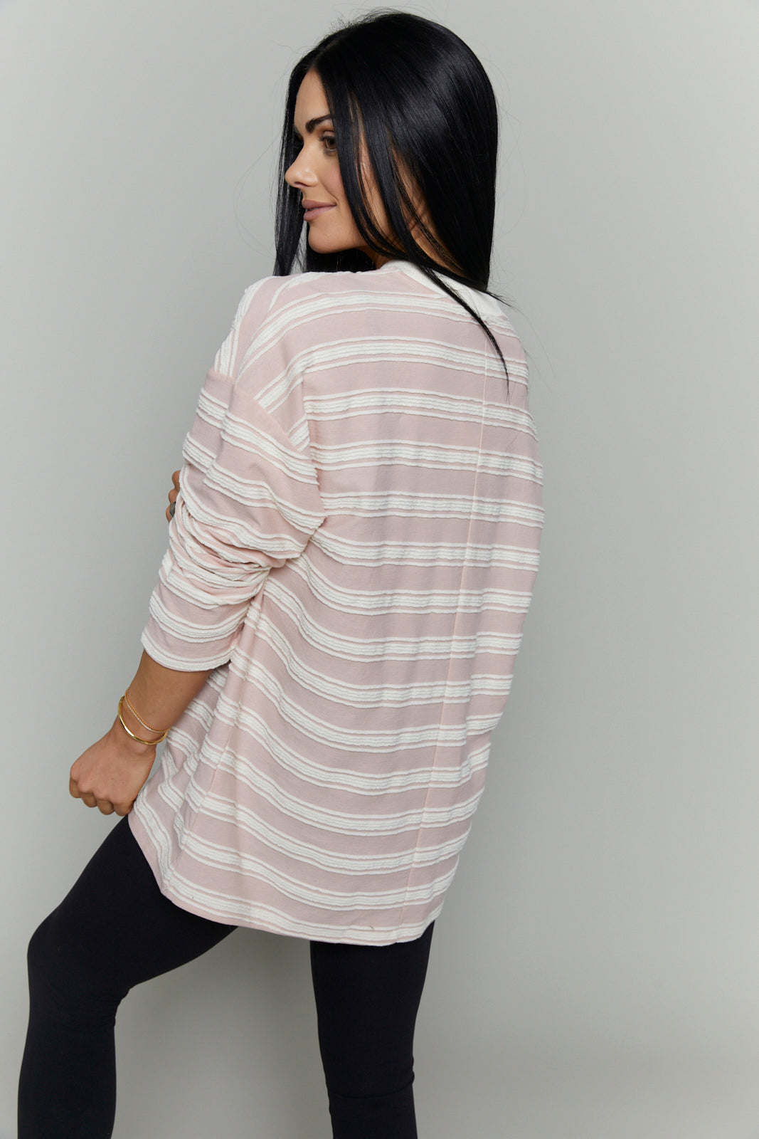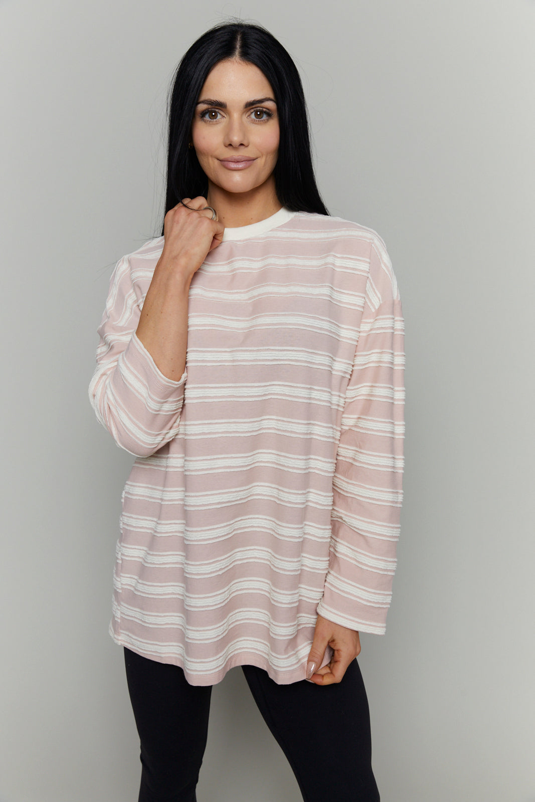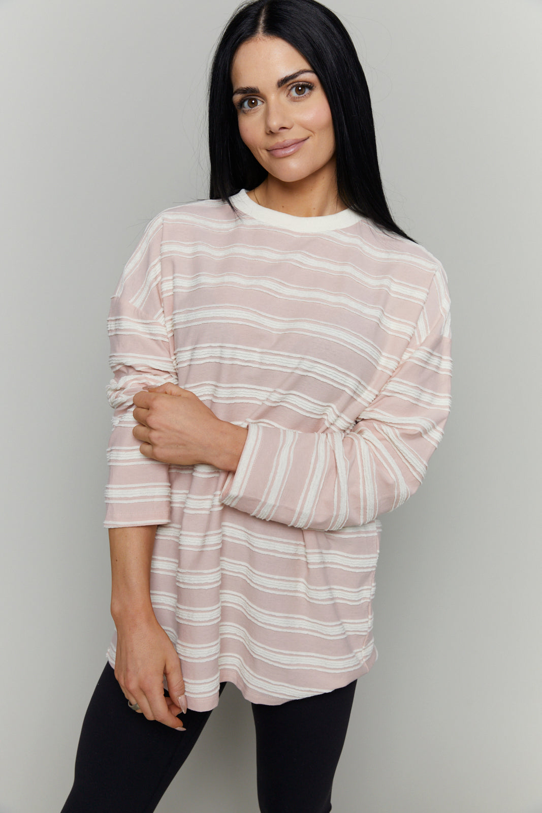 knit top features soft horizontal textured stripes throughout