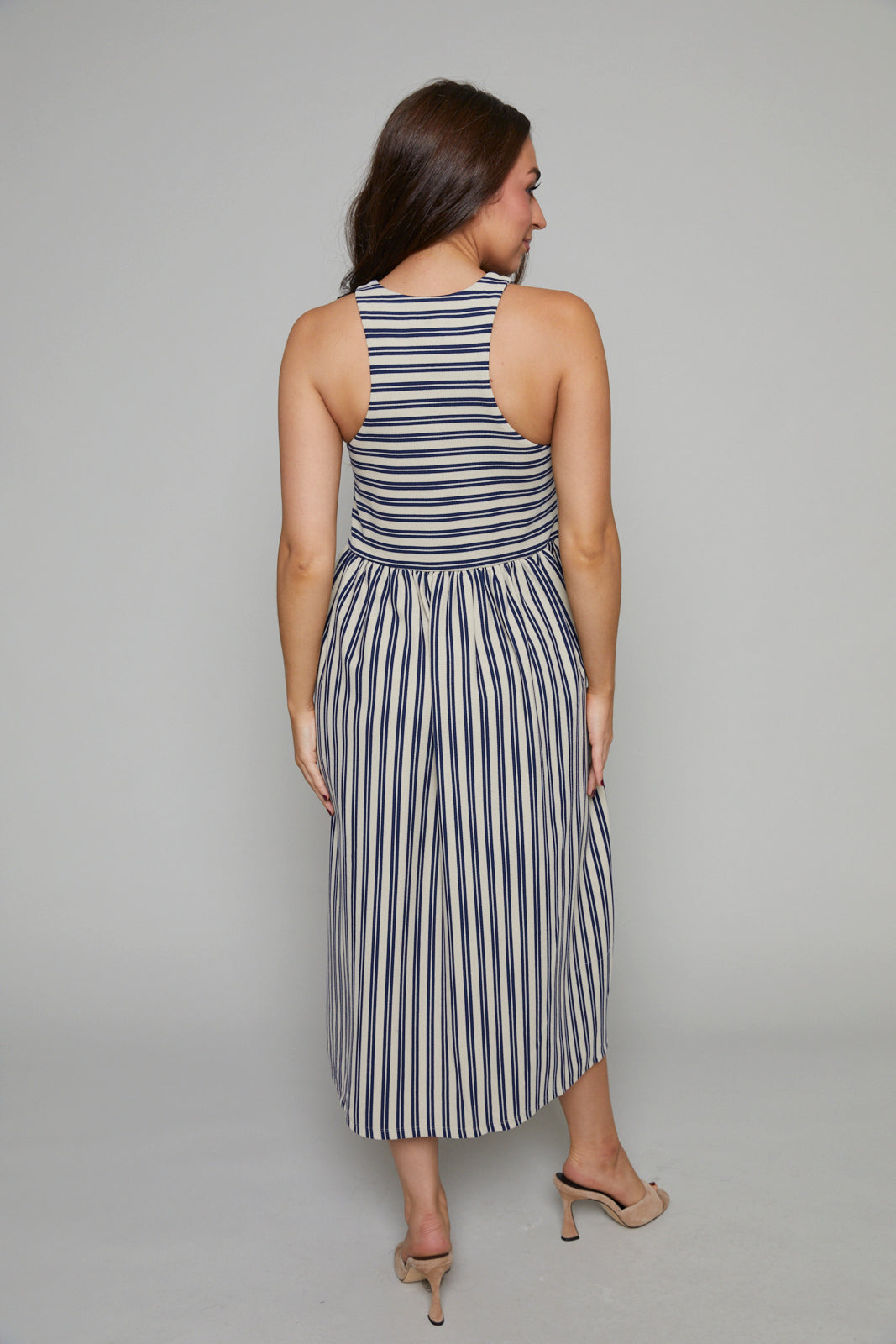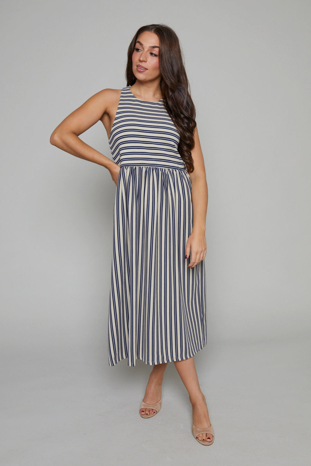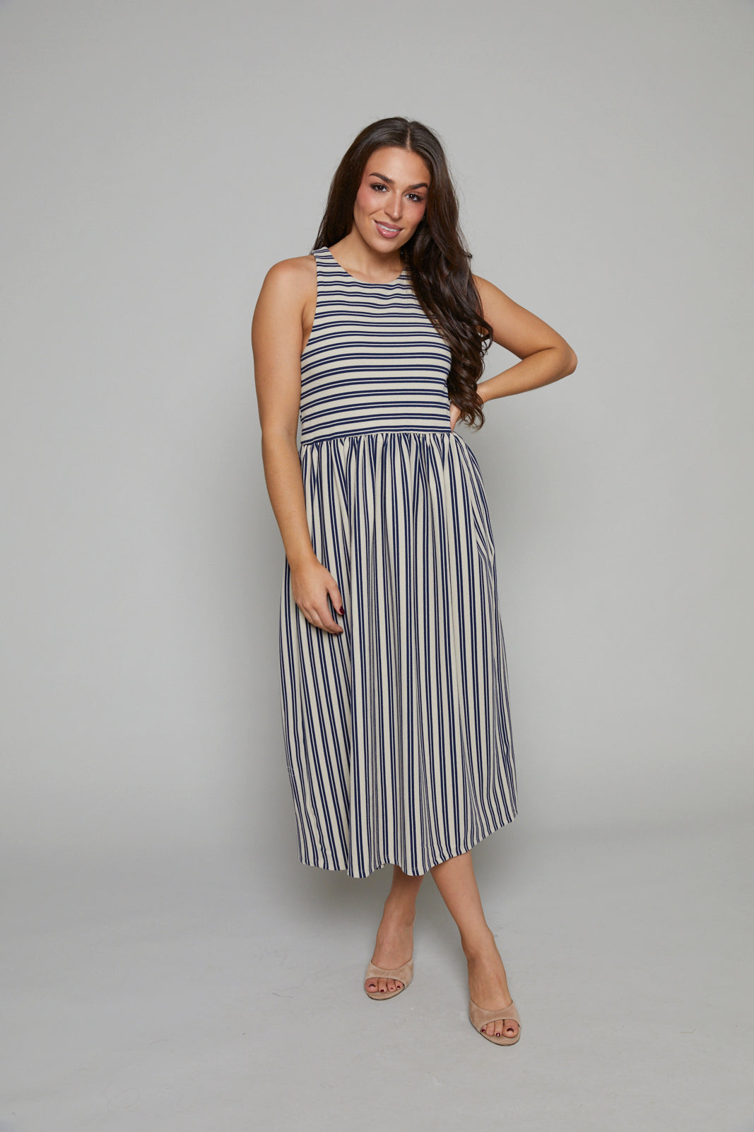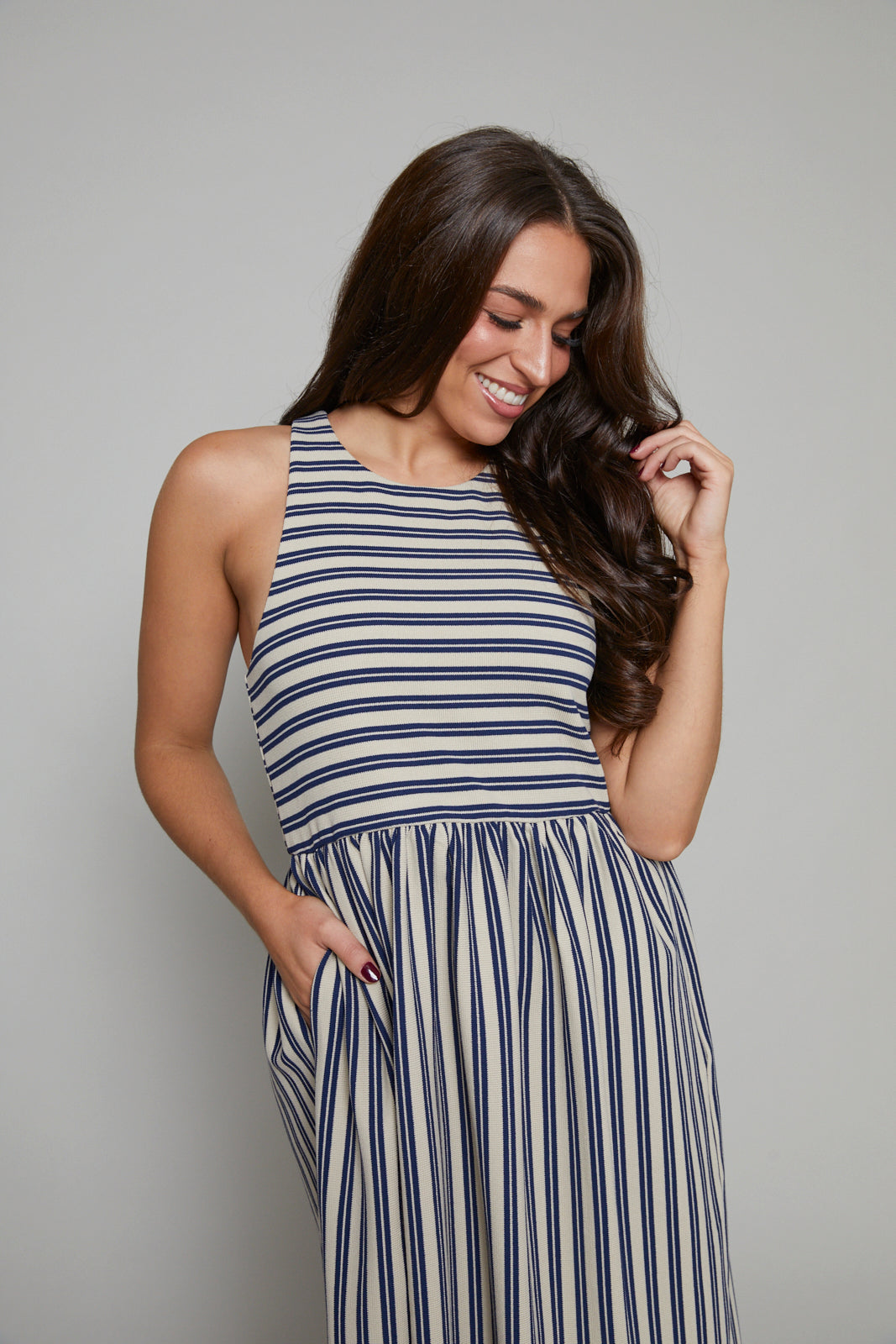 The Tawyna muscle tank dress, crafted from a striped knit, is your go-to one-piece essential for effortless style. This midi-length dress features convenient inseam pockets and a flattering round neckline, embodying a fit-and-flare silhouette that promises both comfort and elegance. Perfect for spring, this dress combines practicality with a timeless look, making it an ideal choice for any casual outing.