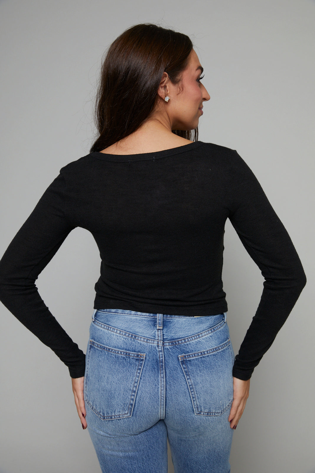 A super soft, sweater knit long sleeve top featuring a scoop neck design. Fits close to the body, making it the perfect top to wear alone or underneath your favorite layering pieces.