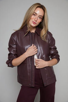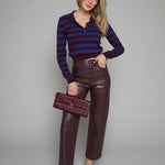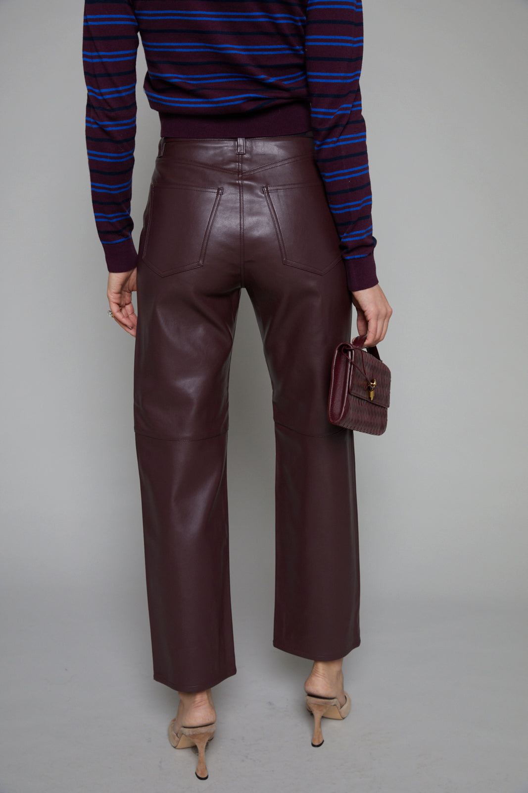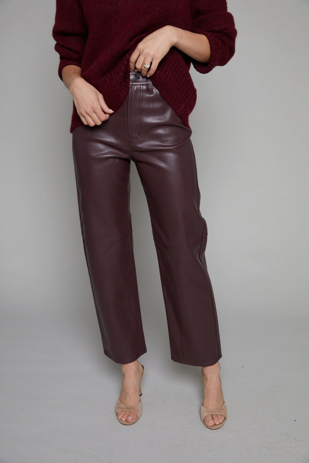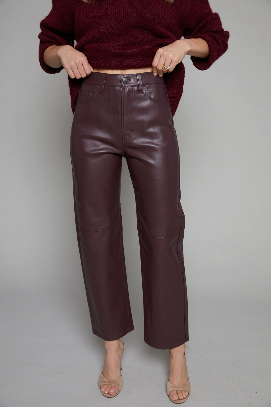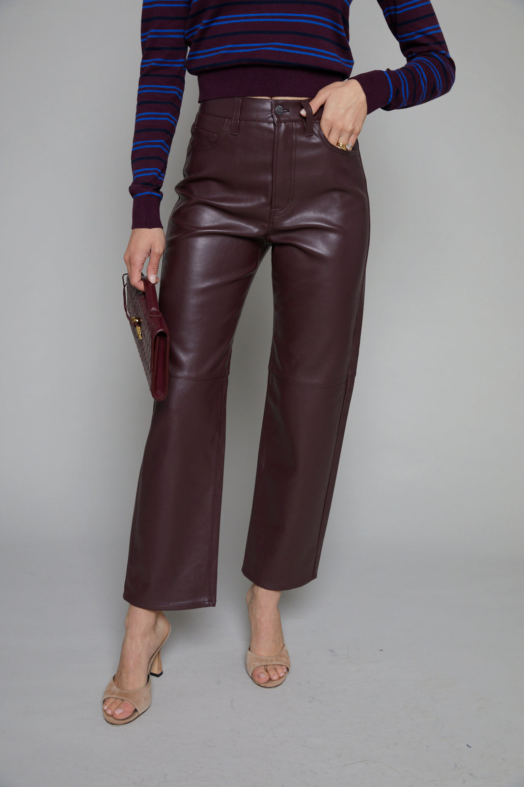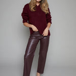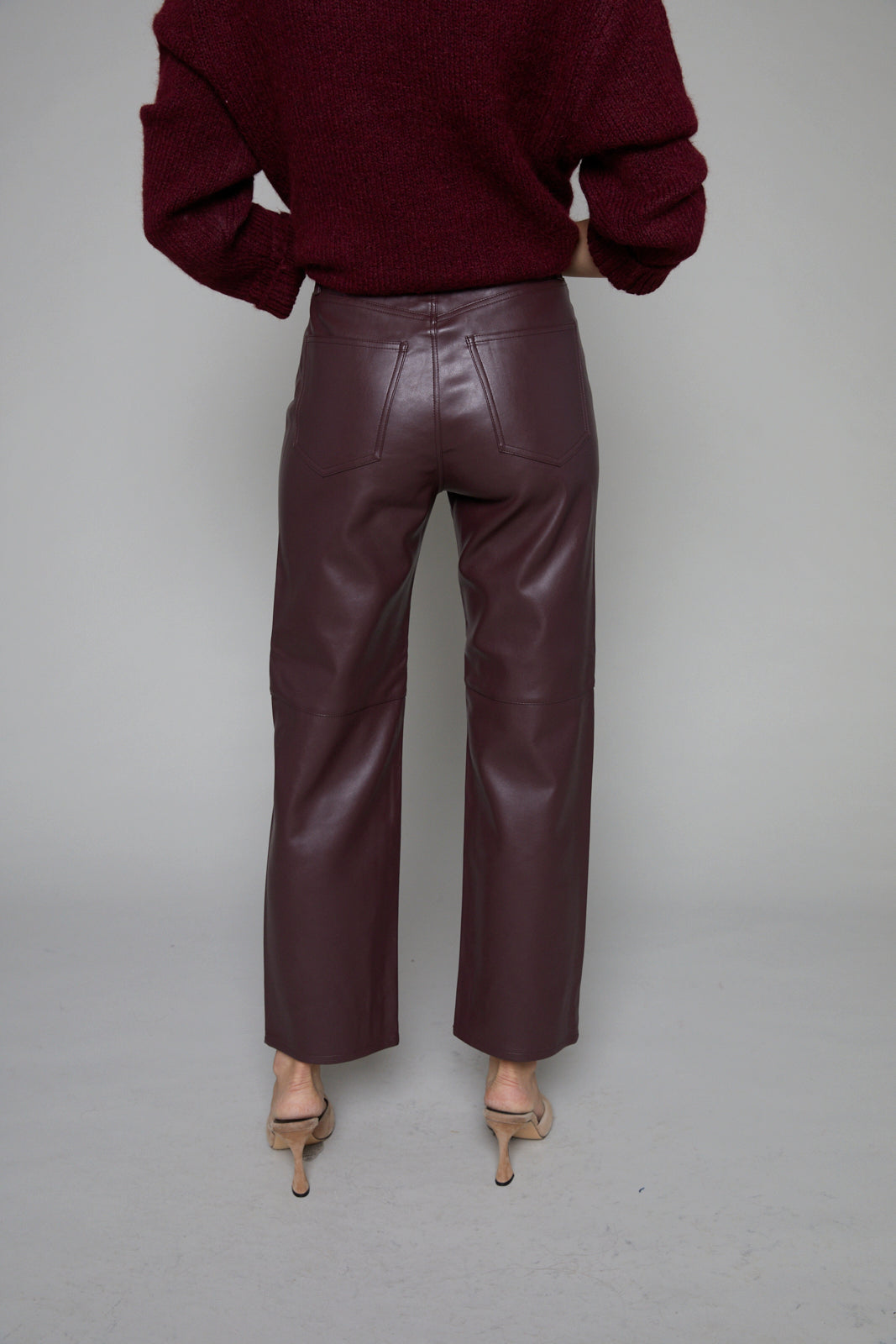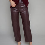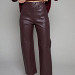 Alt leather meets architectural precision. Wrigley delivers our signature bowed leg silhouette with a high rise and cropped 28" inseam that creates dimensional interest. The subtle curve adds dimension while the straight leg maintains clean lines. Crafted with 100% PU coating face and 100% polyester back for a luxurious leather-like finish that holds its expert shape. Cabernet brings rich sophistication with its deep burgundy finish—the trending color of the moment that's defining this season's palette.