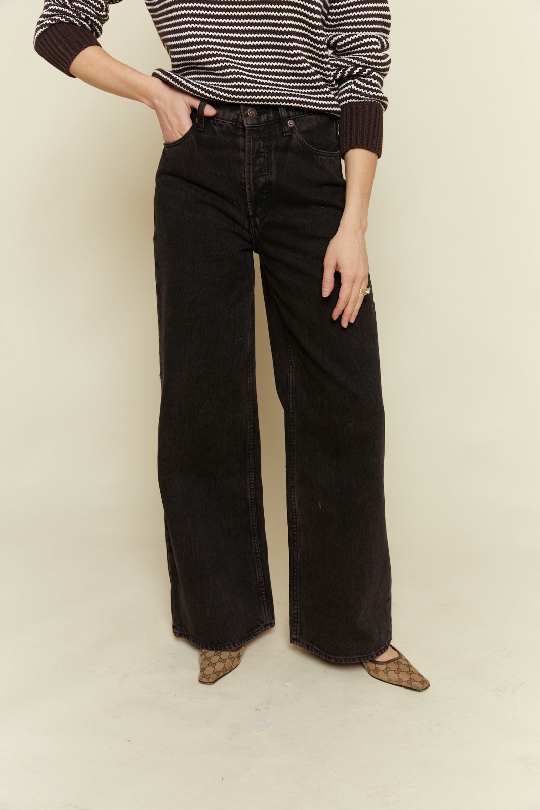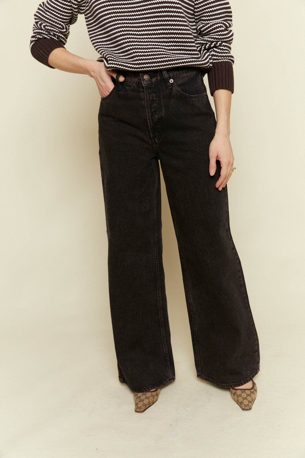 - Relaxed fit with a flared leg