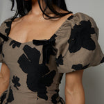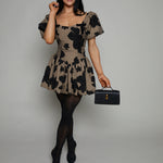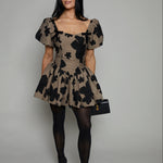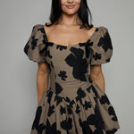 The Jillian Floral Jacquard Mini Dress brings a touch of vintage charm to modern elegance. Its delicate floral jacquard fabric tells a story of timeless beauty, while the puff sleeves add a playful softness to the silhouette.