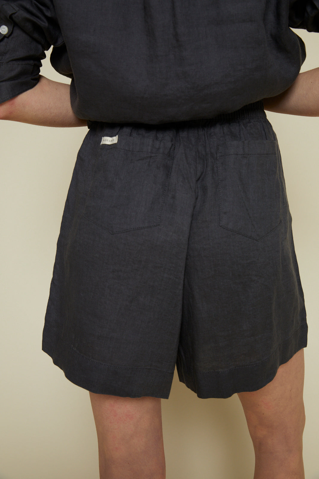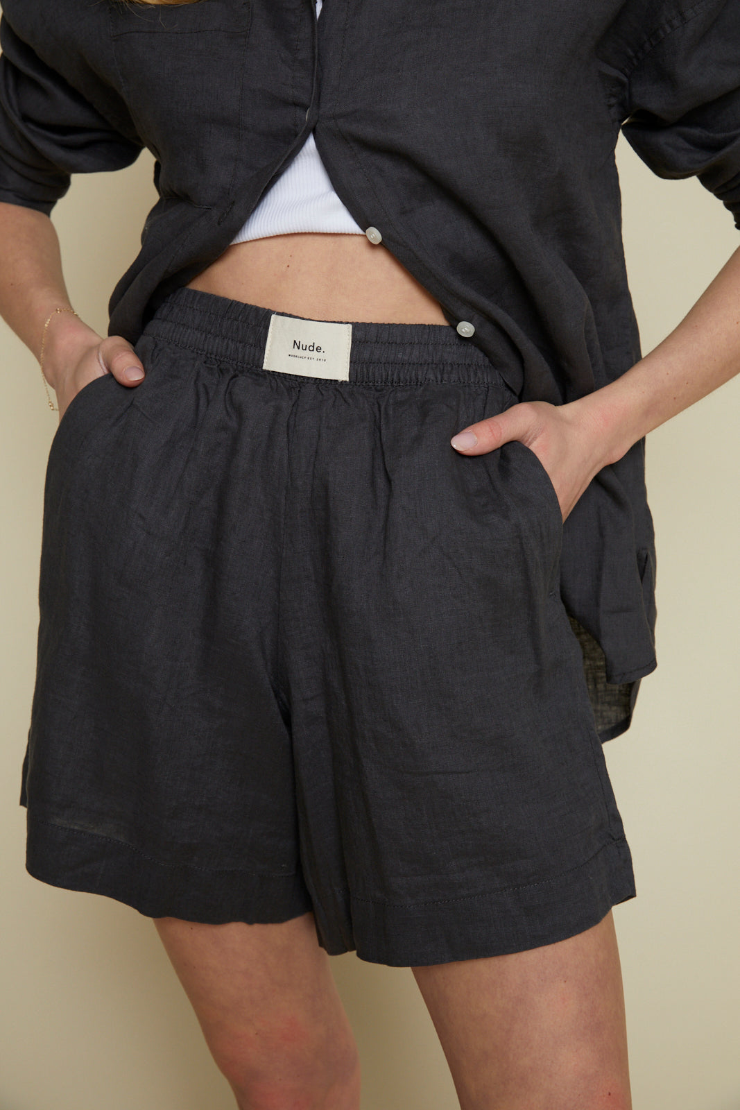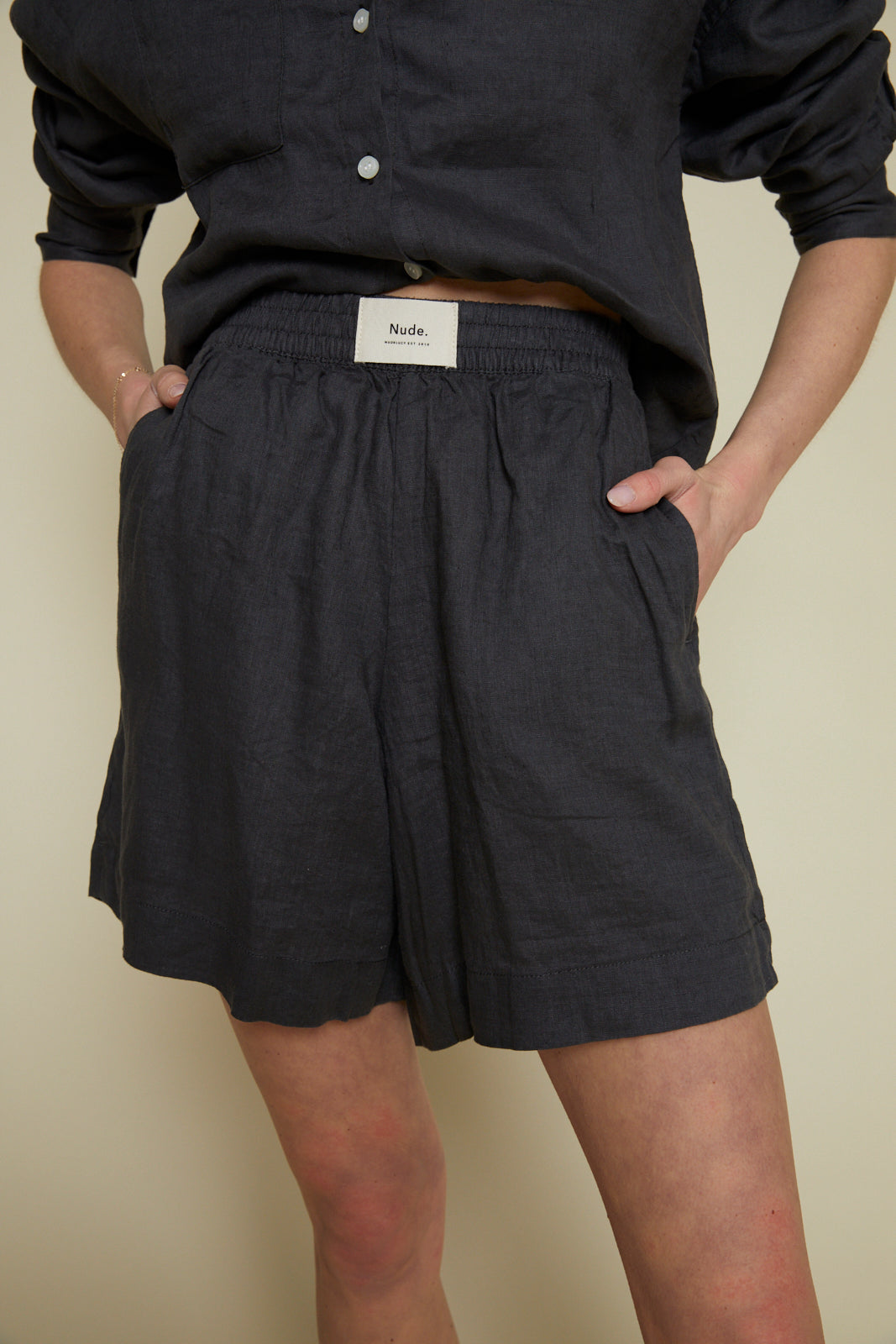 The Lounge Heritage Linen Short has been washed down for a soft and breathable hand feel. The silhouette is a classic boxer short silhouette finishing mid-thigh. Features include an elasticated waistband with a Nude. Heritage patch label on the center front, and patch pockets on the back.