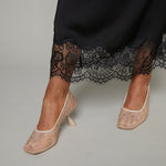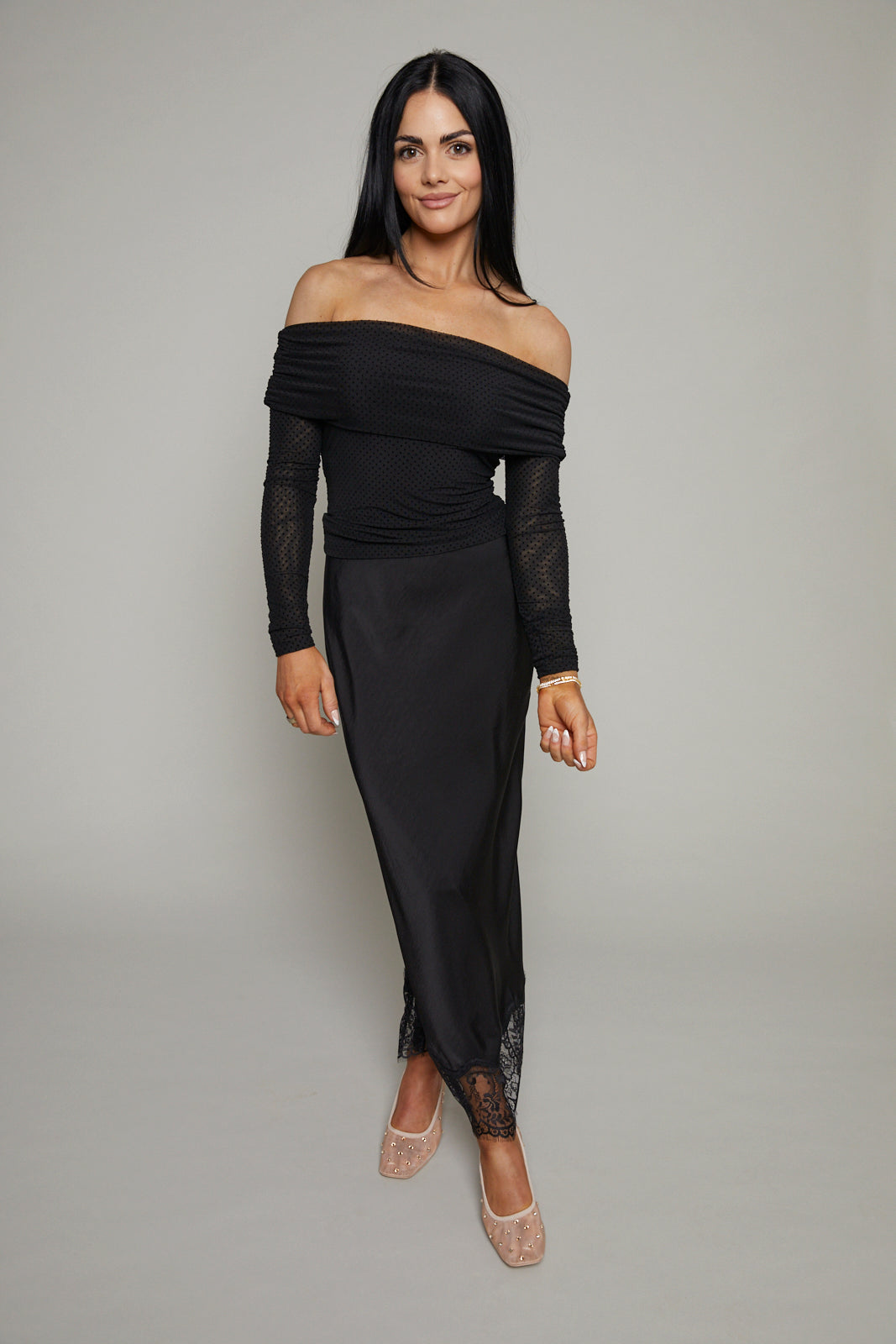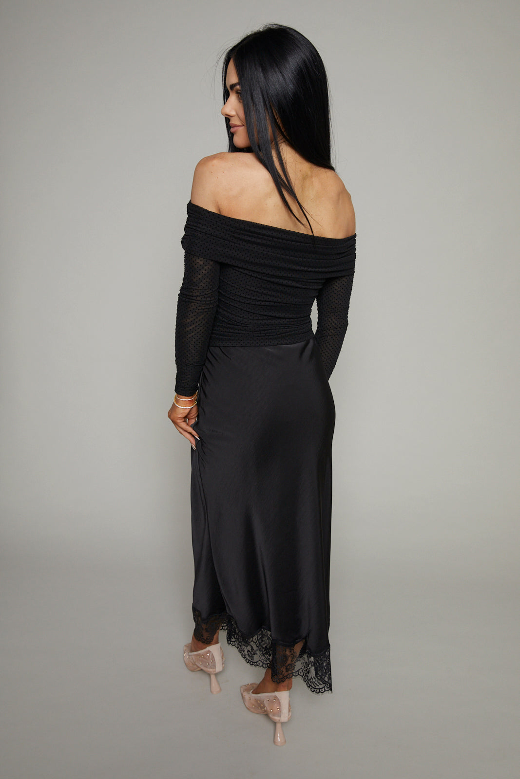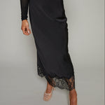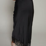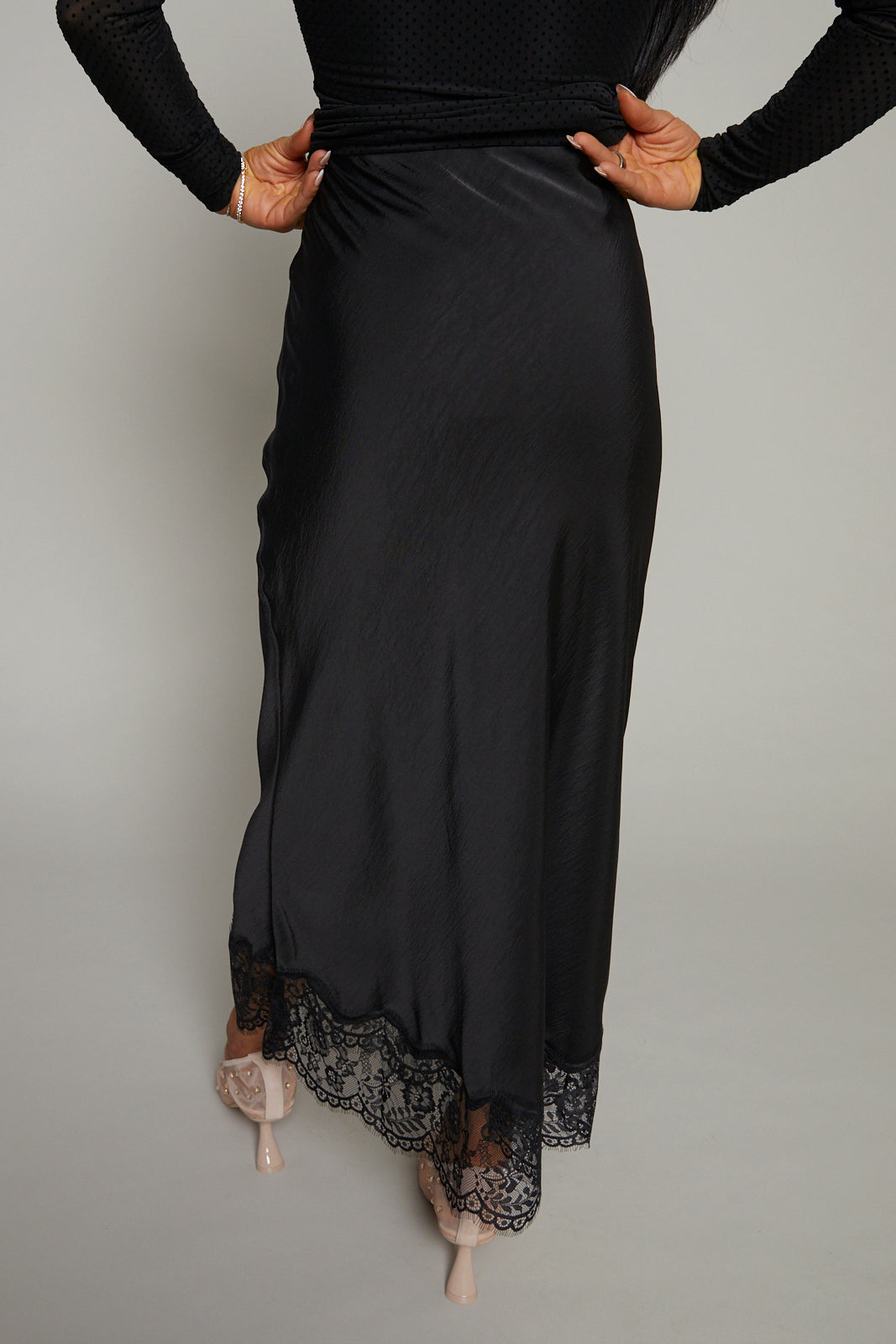 Luxe satin and delicate lace come together in this midi skirt that instantly elevates your look.