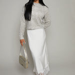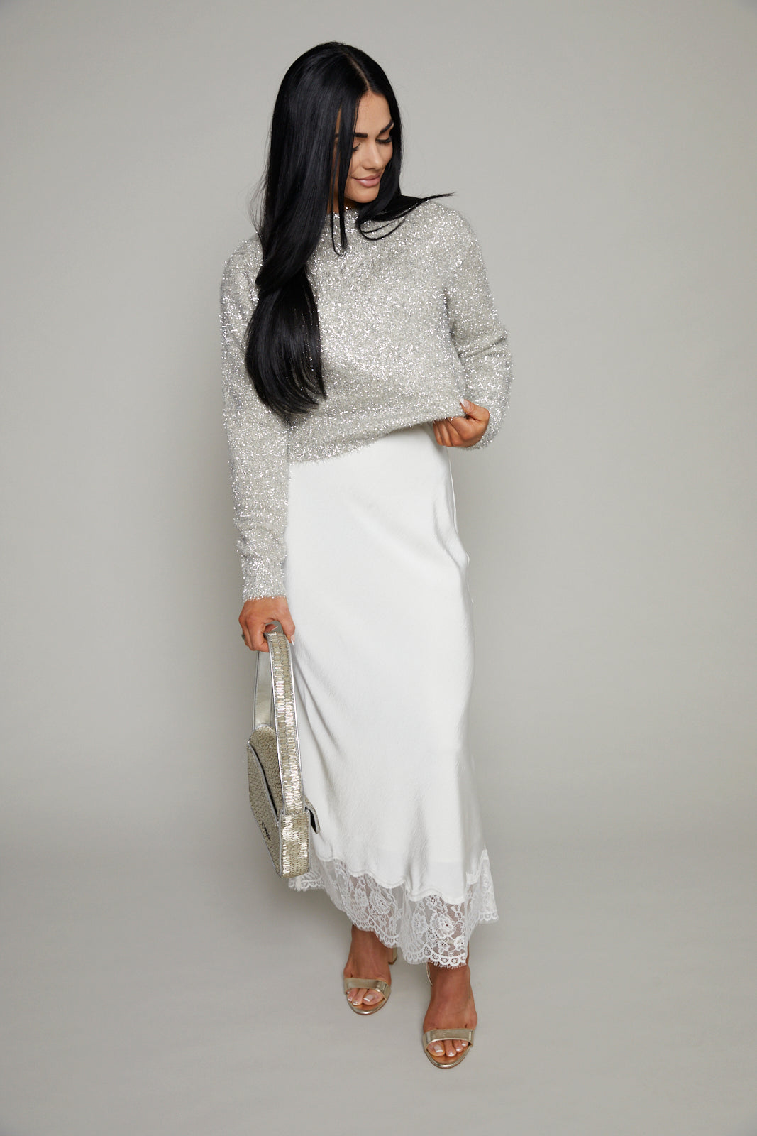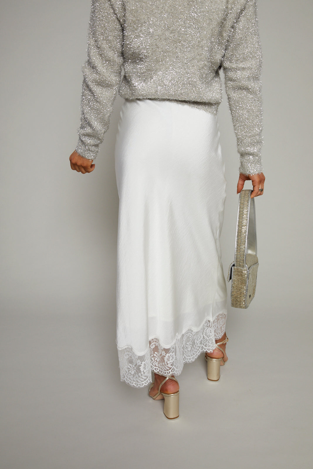 Luxe satin and delicate lace come together in this midi skirt that instantly elevates your look.