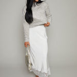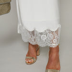 Crafted from smooth, lustrous satin, this high-rise midi skirt brings an elevated touch with a scalloped lace hem. The pull-on silhouette offers comfort and polish in equal measure, perfect for holiday dinners, cocktail hours, and everything in between.