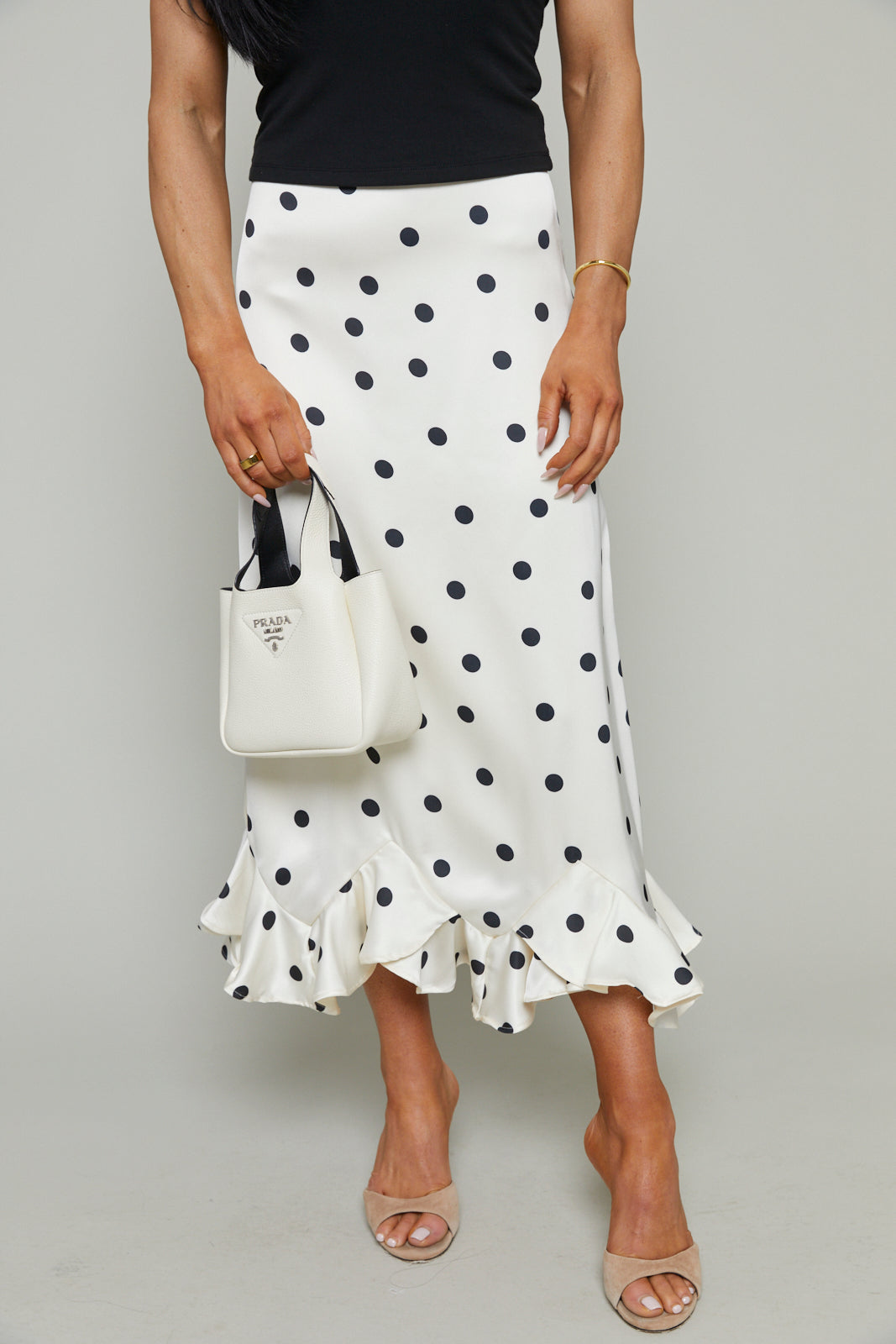 Midi satin slip skirt with polka dots and angle ruffle hem