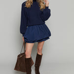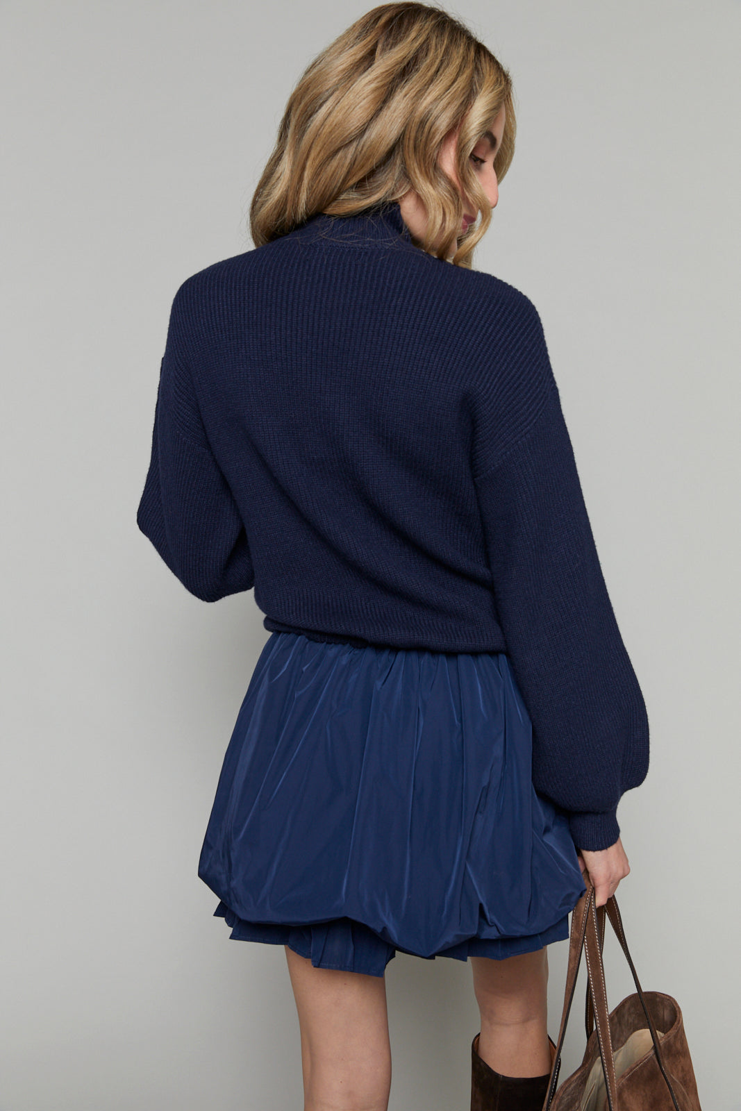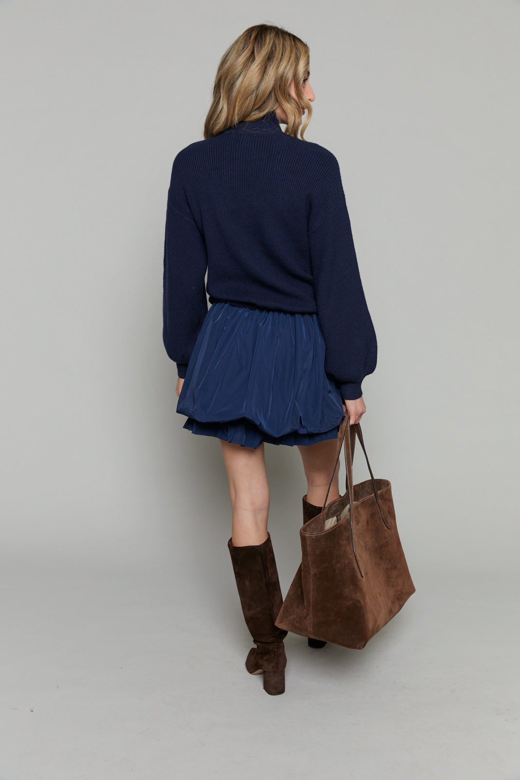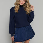 Turtle Neck Balloon Sleeve Sweater With Bubble Pleat Skirt Mixed Media Mini Dress