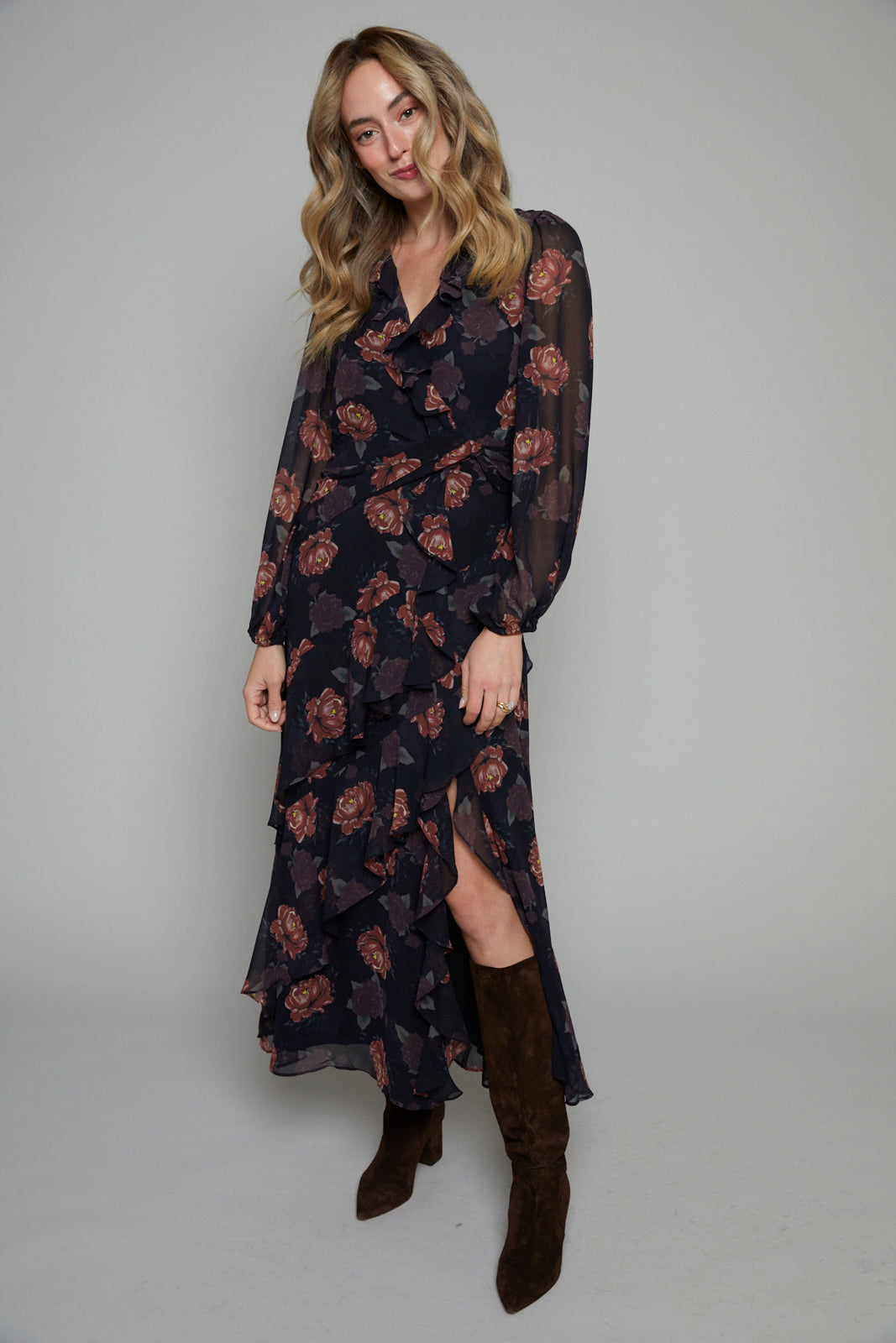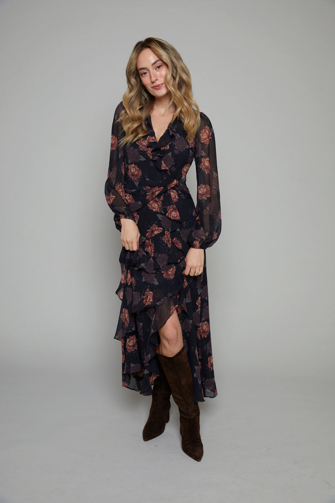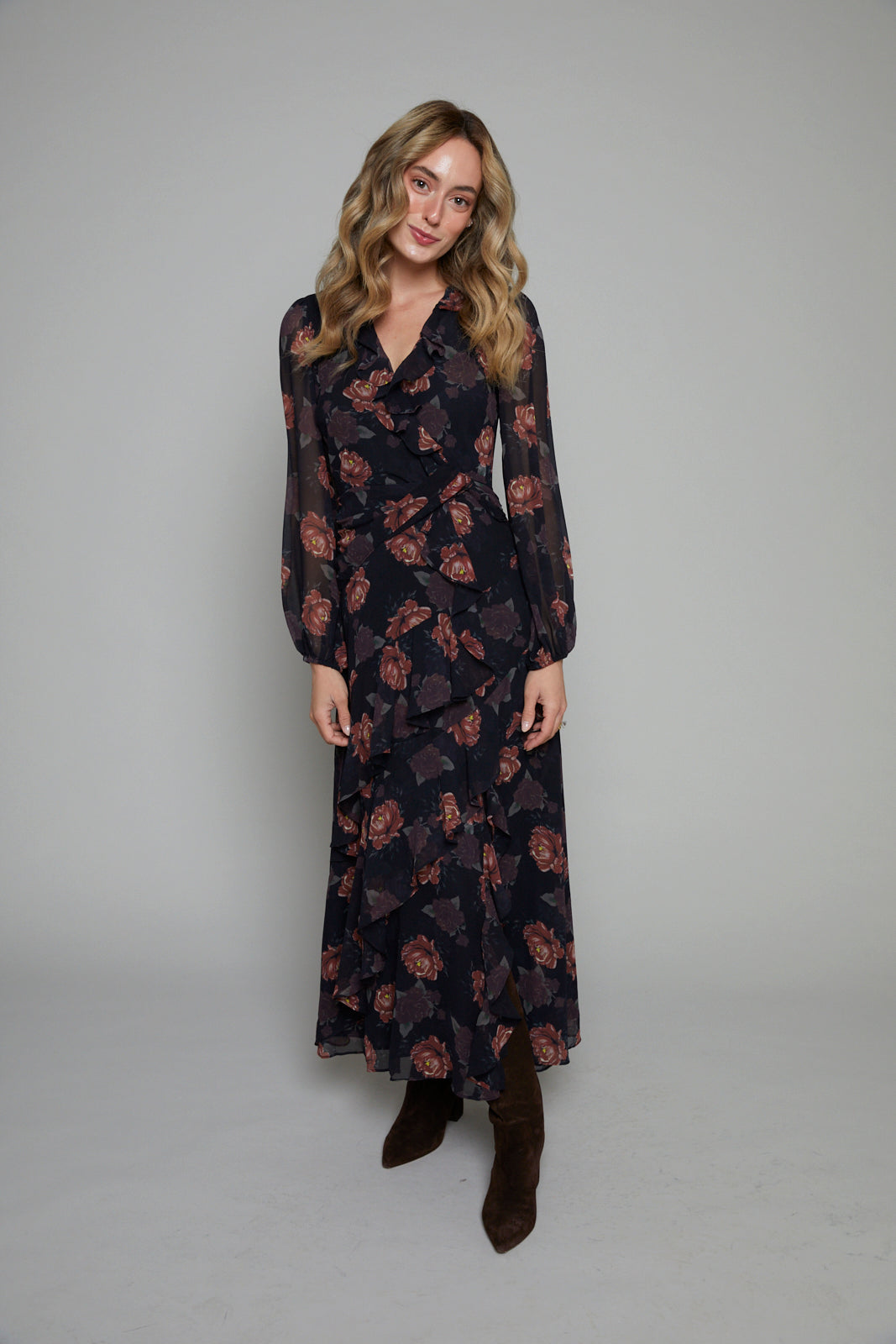 Delicate ruffles add texture and a touch of romantic charm to this maxi length dress. Perfect for weddings, fancy dinners, or any occasion where you want to feel beautiful without trying too hard.