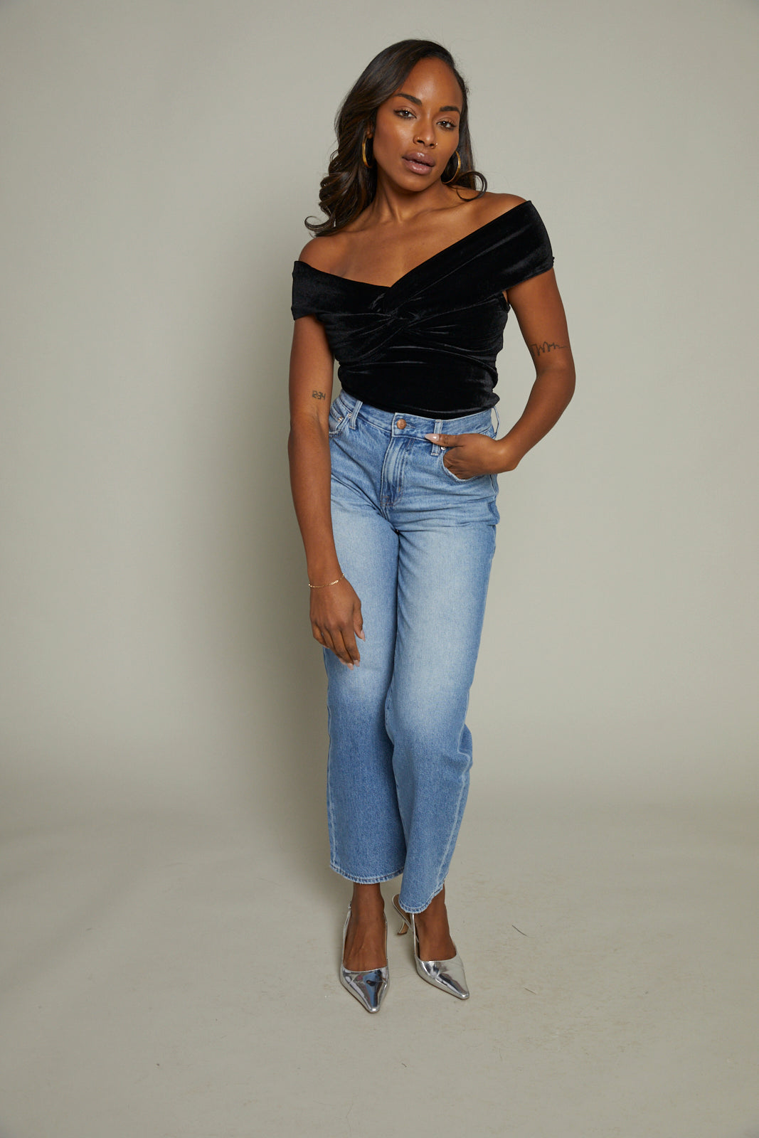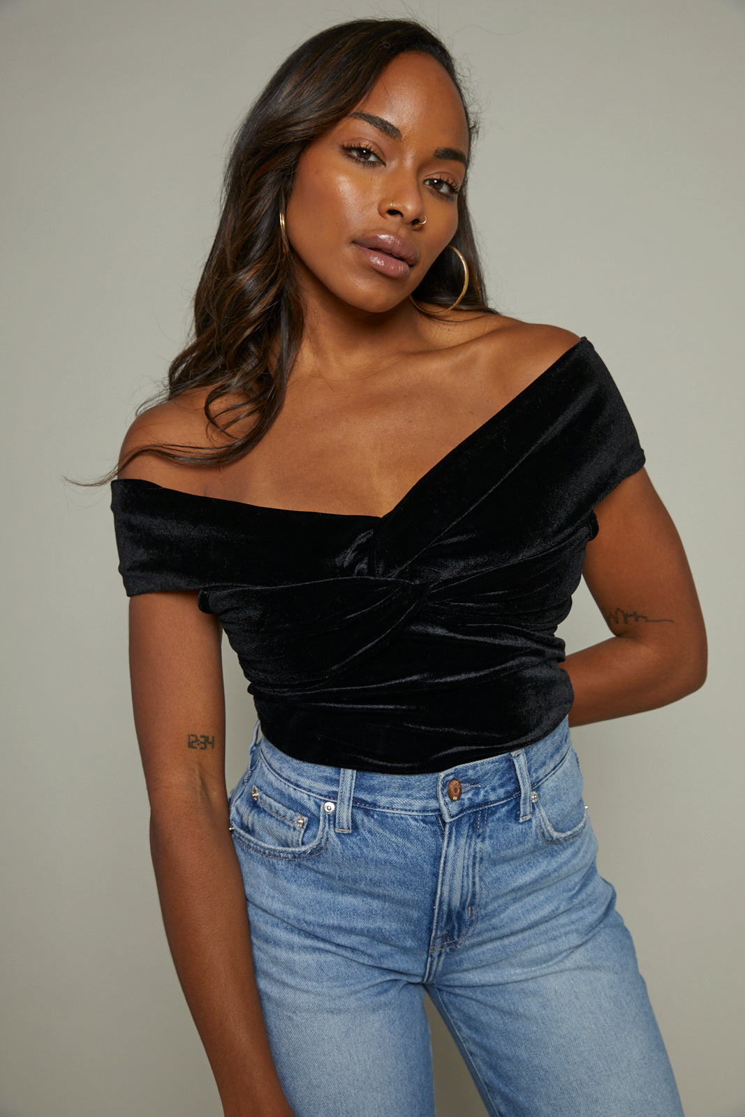 A black velvet bodysuit featuring off the shoulder sleeves and a twist front, sweetheart neckline.