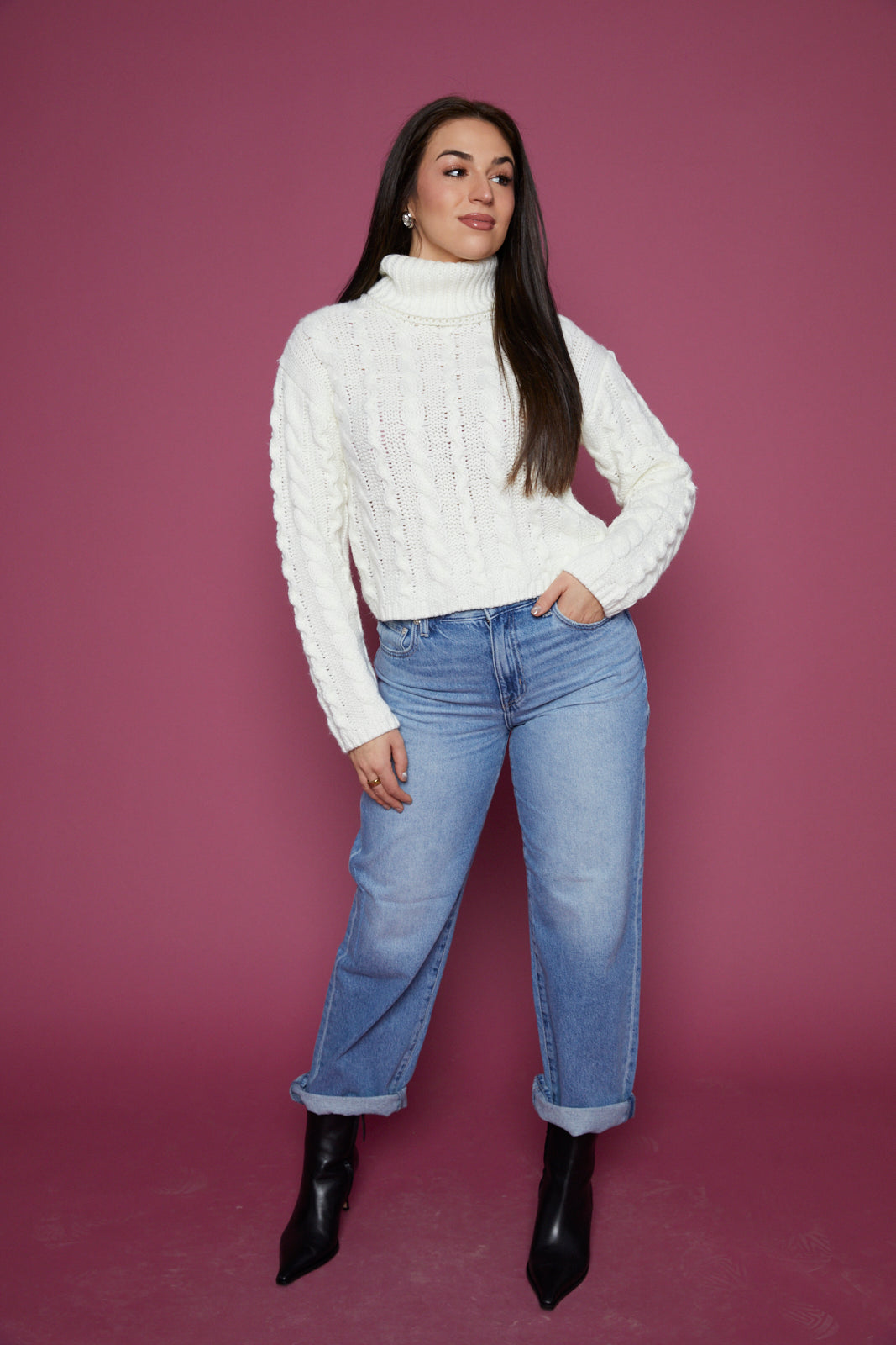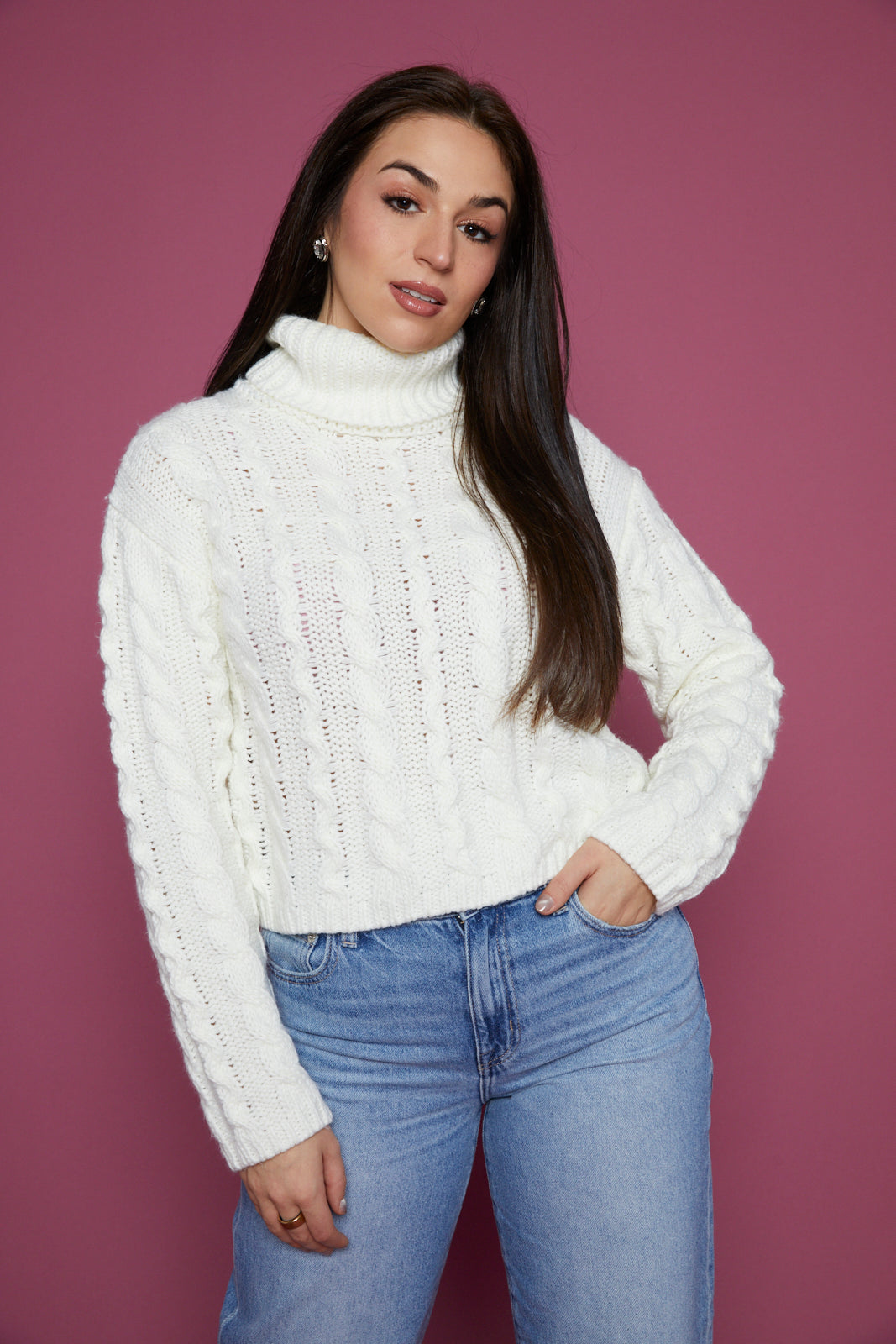 Cozy up in this classic turtleneck sweater, crafted from soft acrylic sweater yarns with a timeless cable knit design. The long sleeves and body skimming fit make it a chic option for layering up on chilly days.