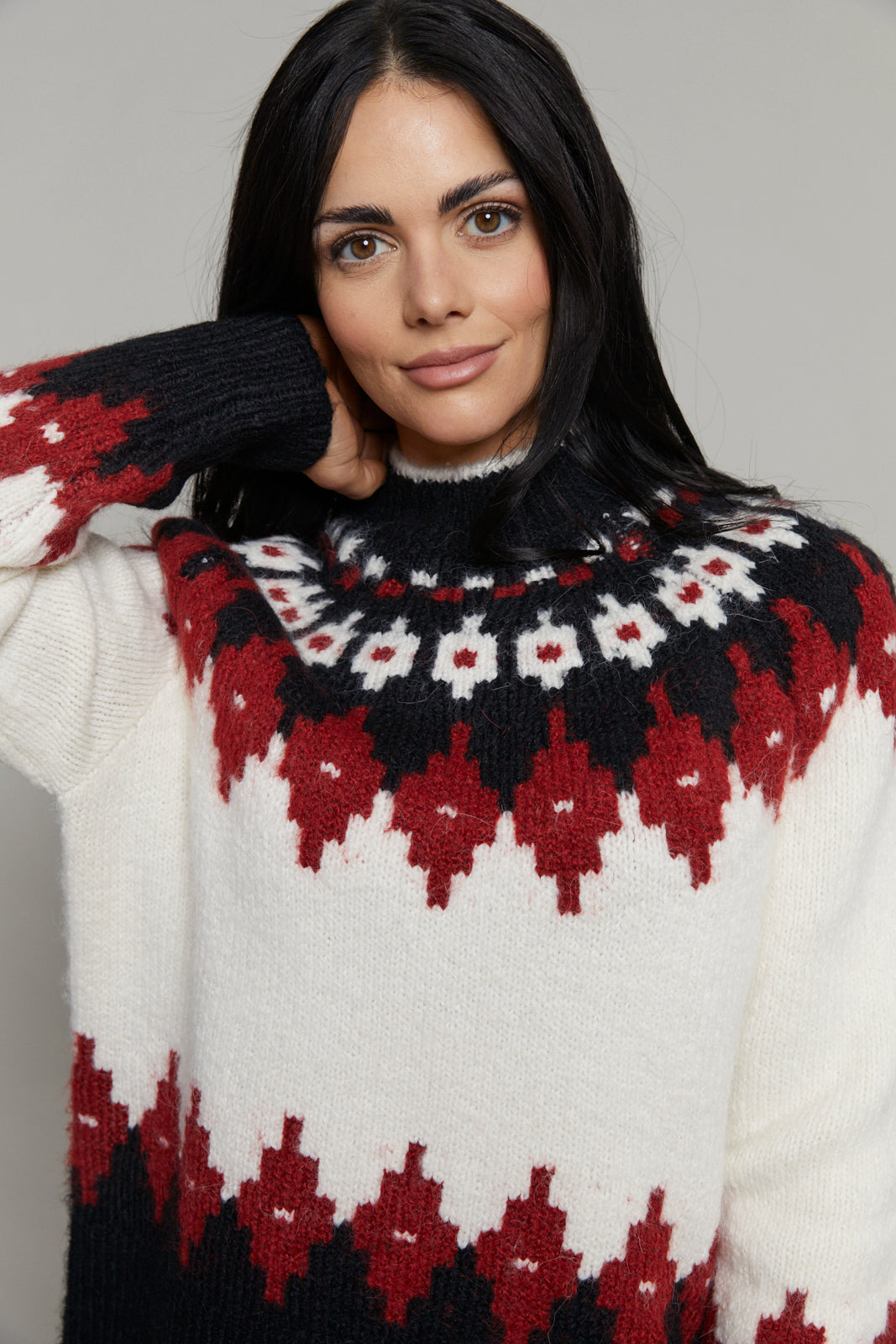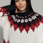 A modern update to a heritage knit, Darra reimagines the classic Fair Isle with bold contrast tones and an easy pullover fit that feels equal parts cozy and refined. Crafted from a soft, substantial blend of acrylic, wool, alpaca, and nylon. White Oxblood Fair Isle brings a graphic contrast that transitions effortlessly from après-ski to city days.