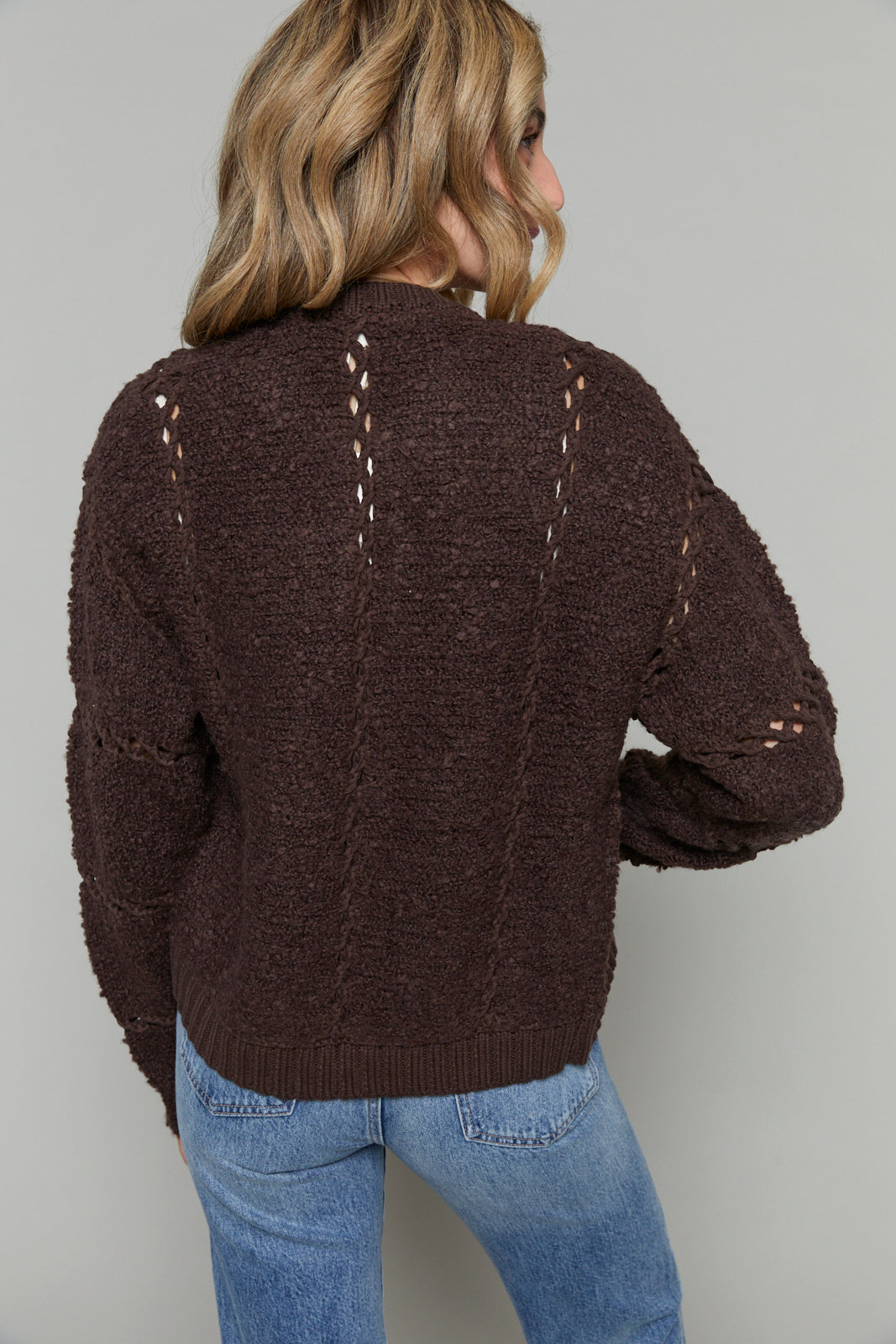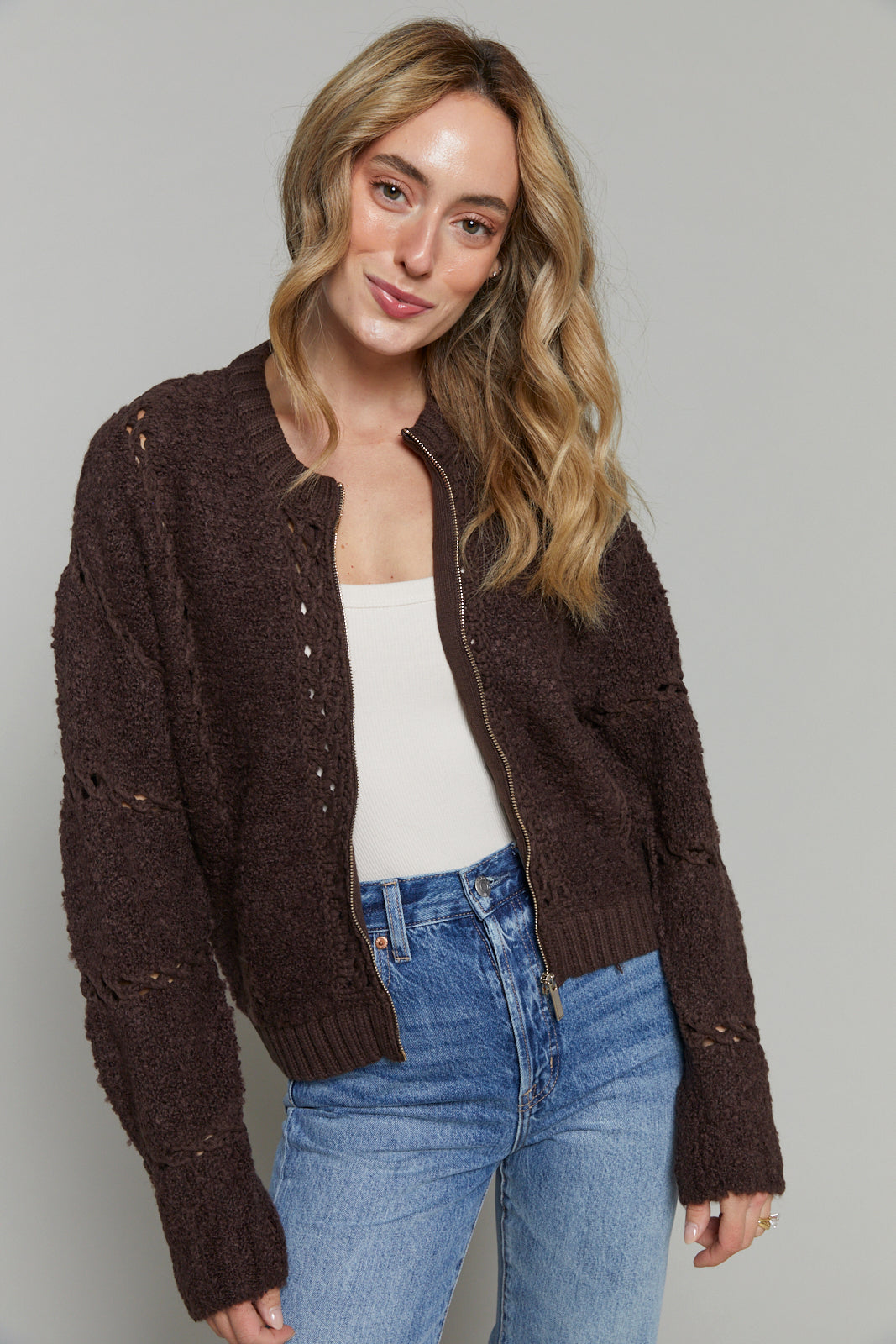 Soft texture meets delicate details in this zip-up sweater, crafted from plush, high-pile yarns and finished with intricate crochet insets and ribbed trim. It’s a feel-good layer that adds polish to any look.