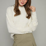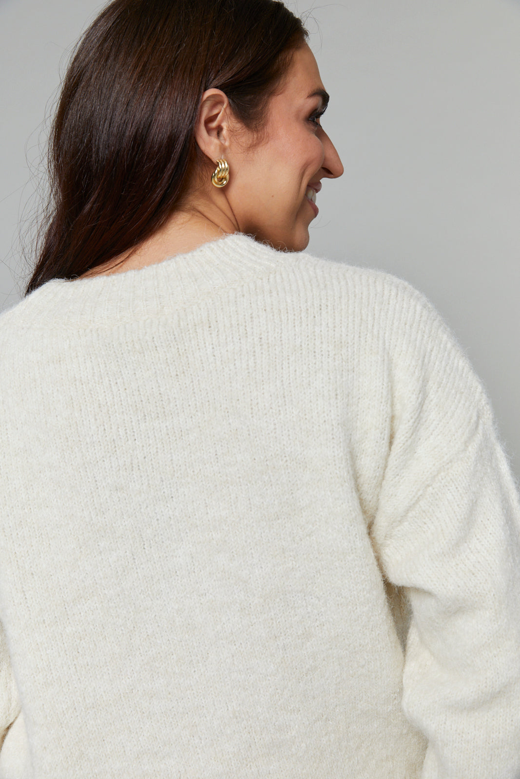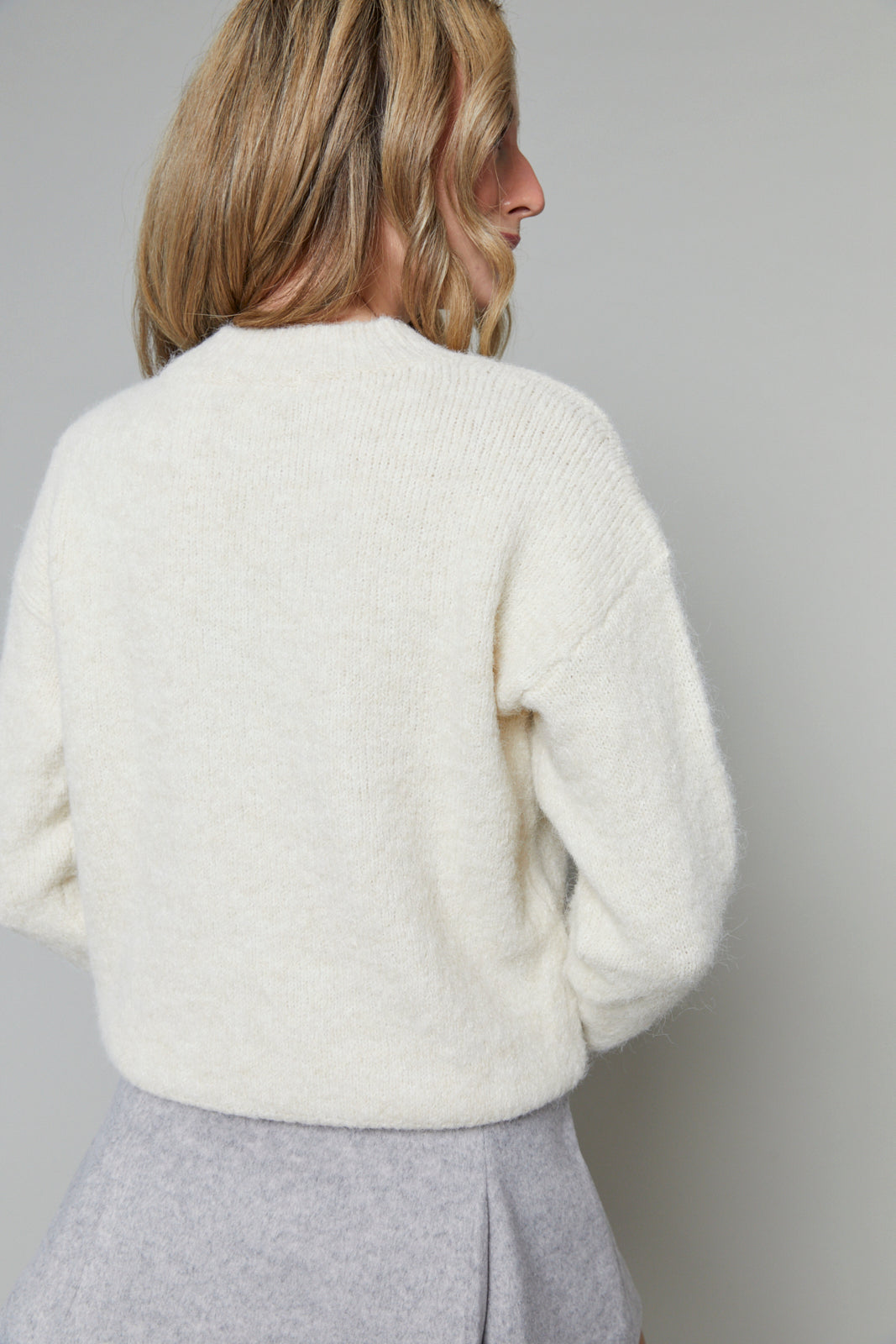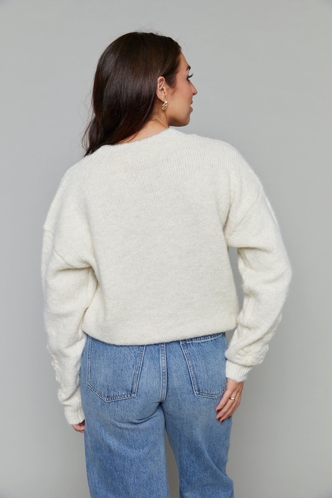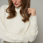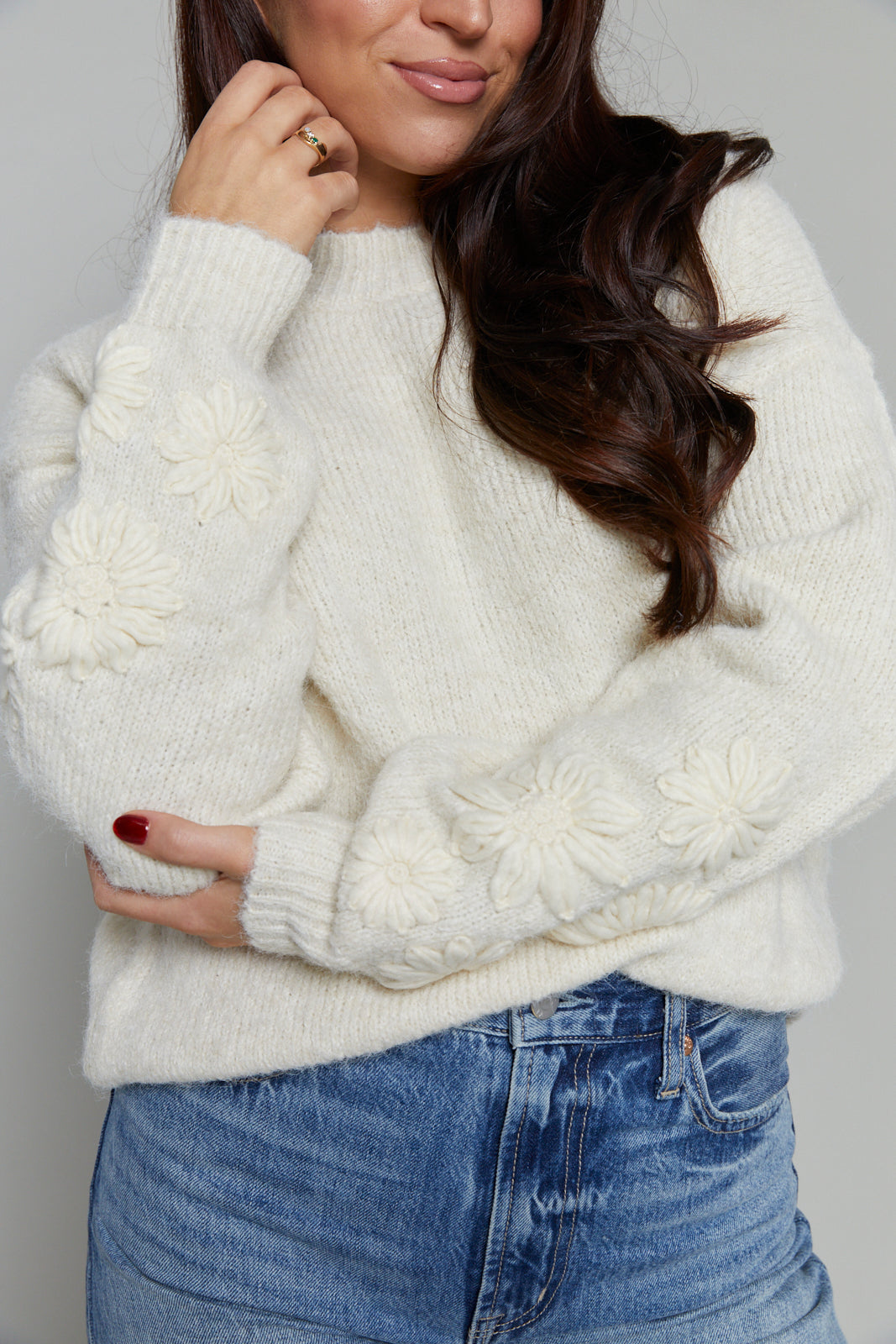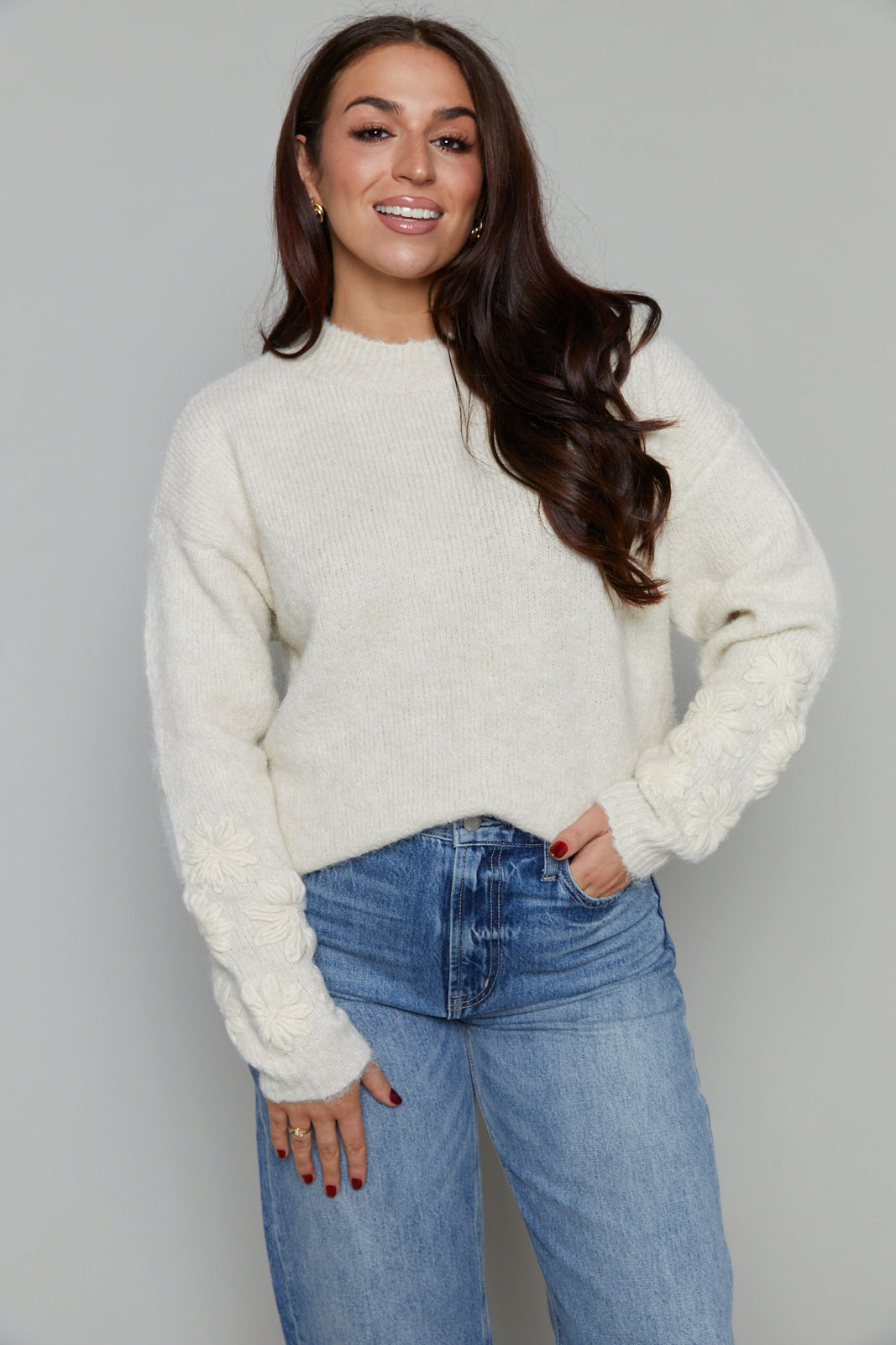 • Crew Neck Sweater With Border Floral Applique Embroidery at Sleeves