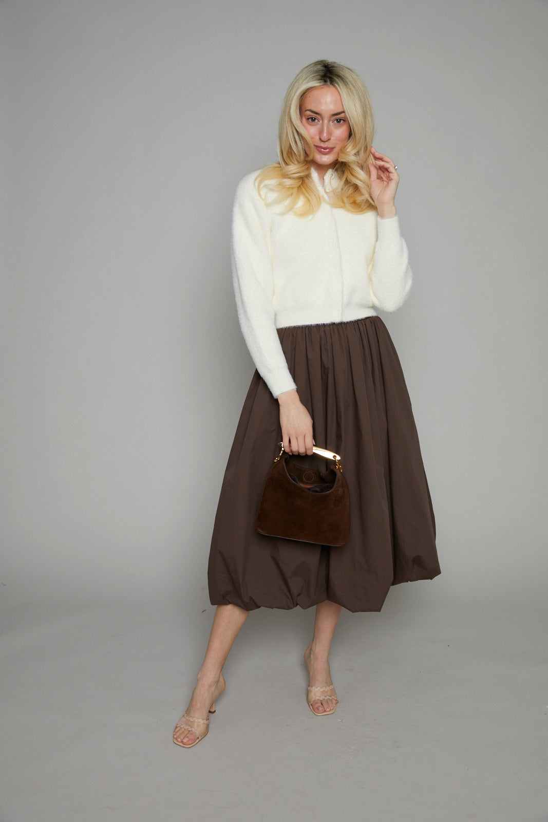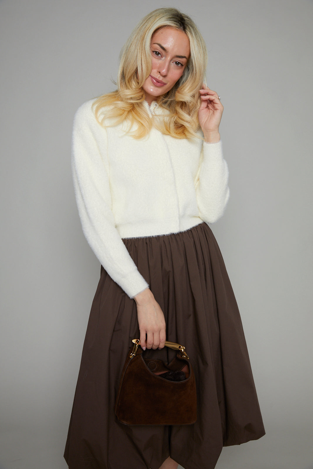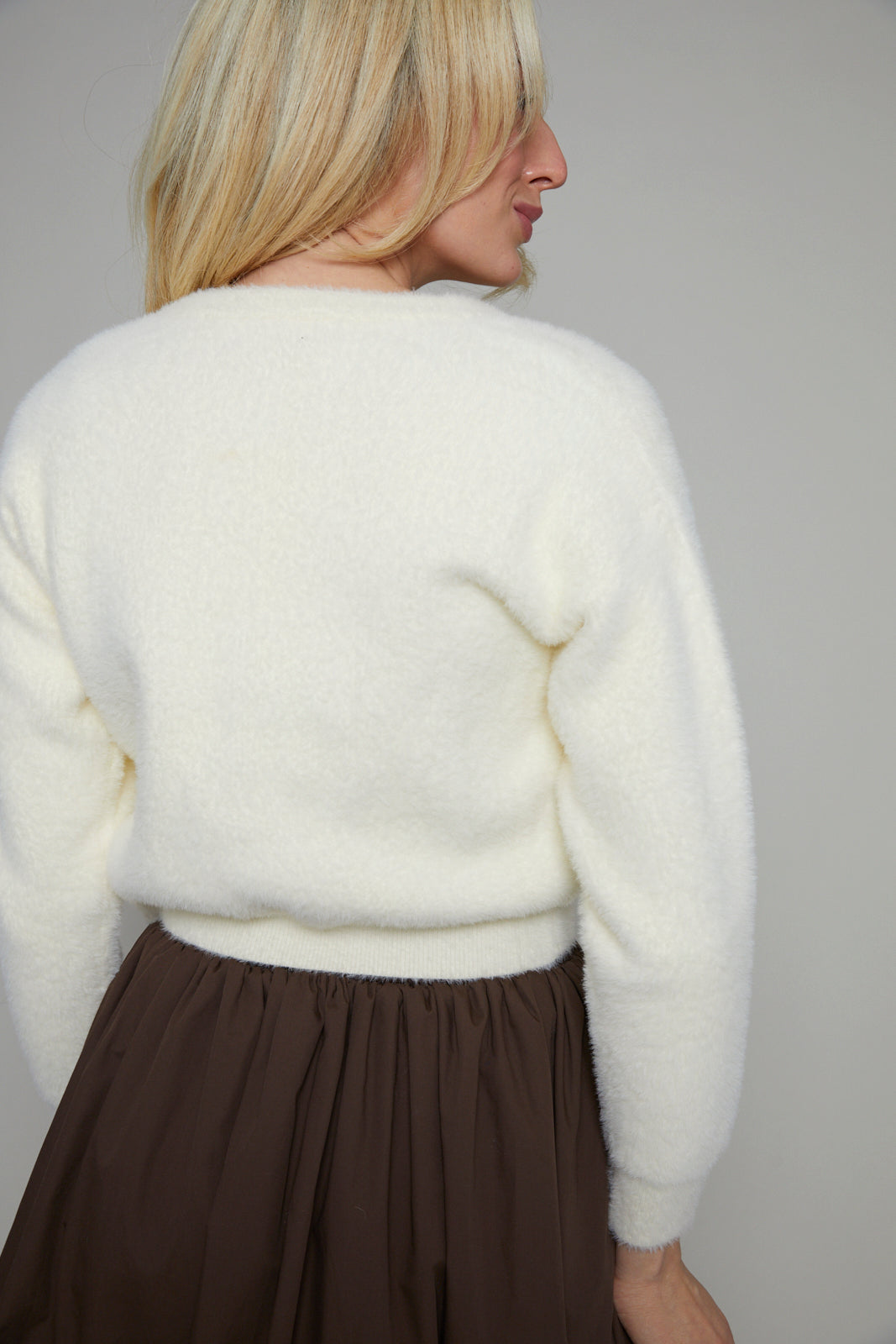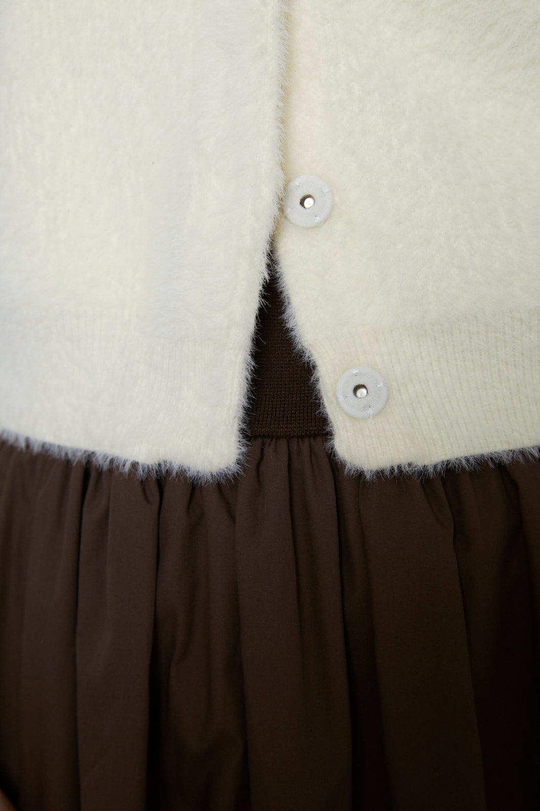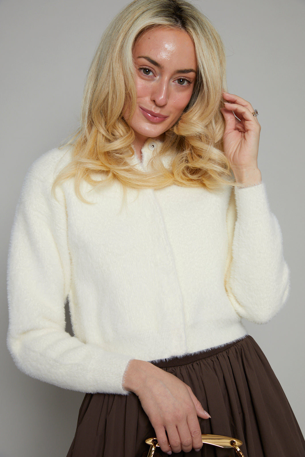 An invisible button cardigan in a fuzzy knit fabrication, perfect for the holidays.