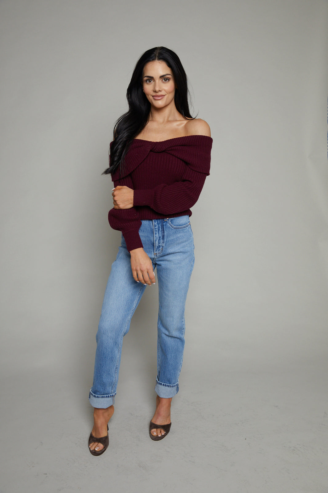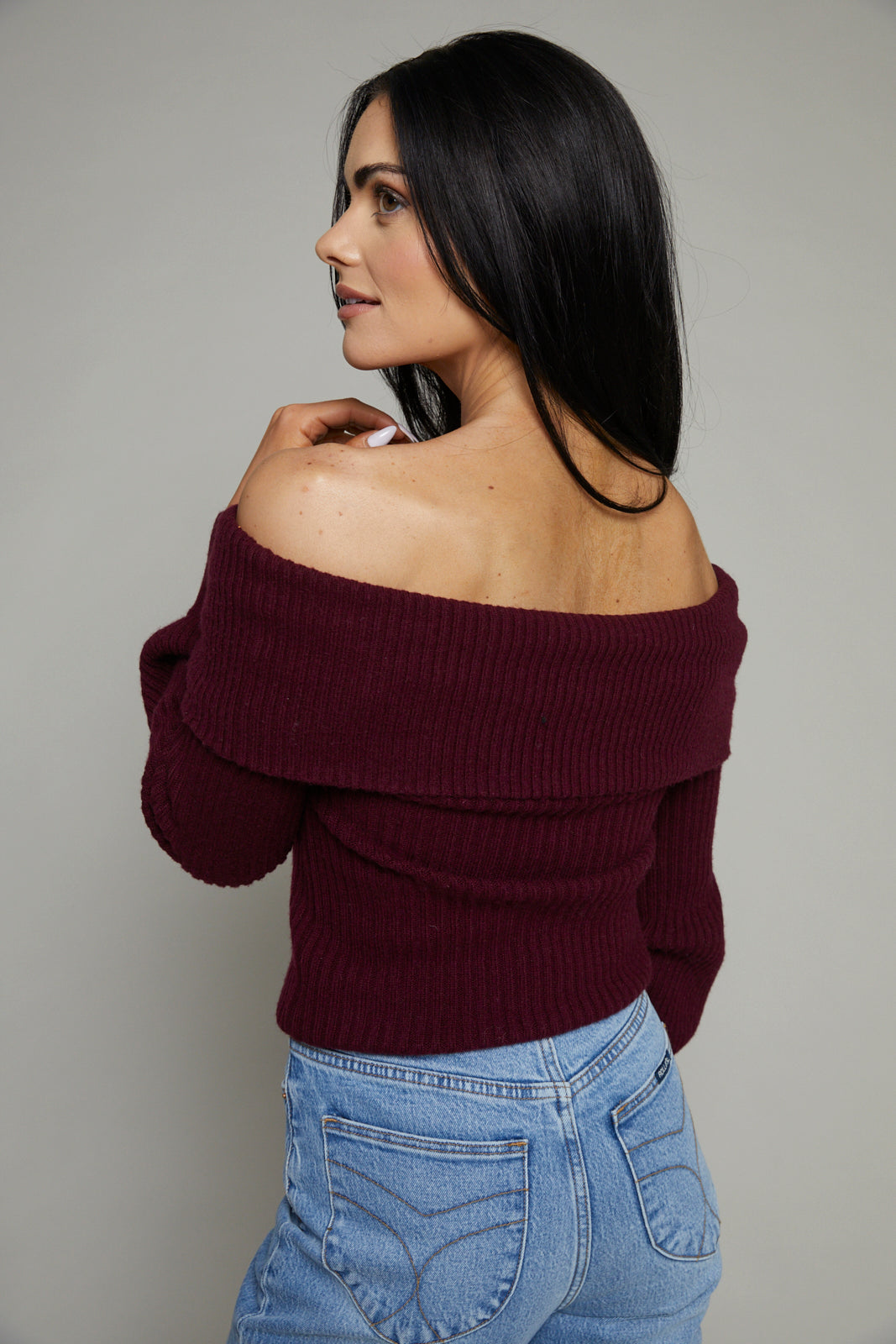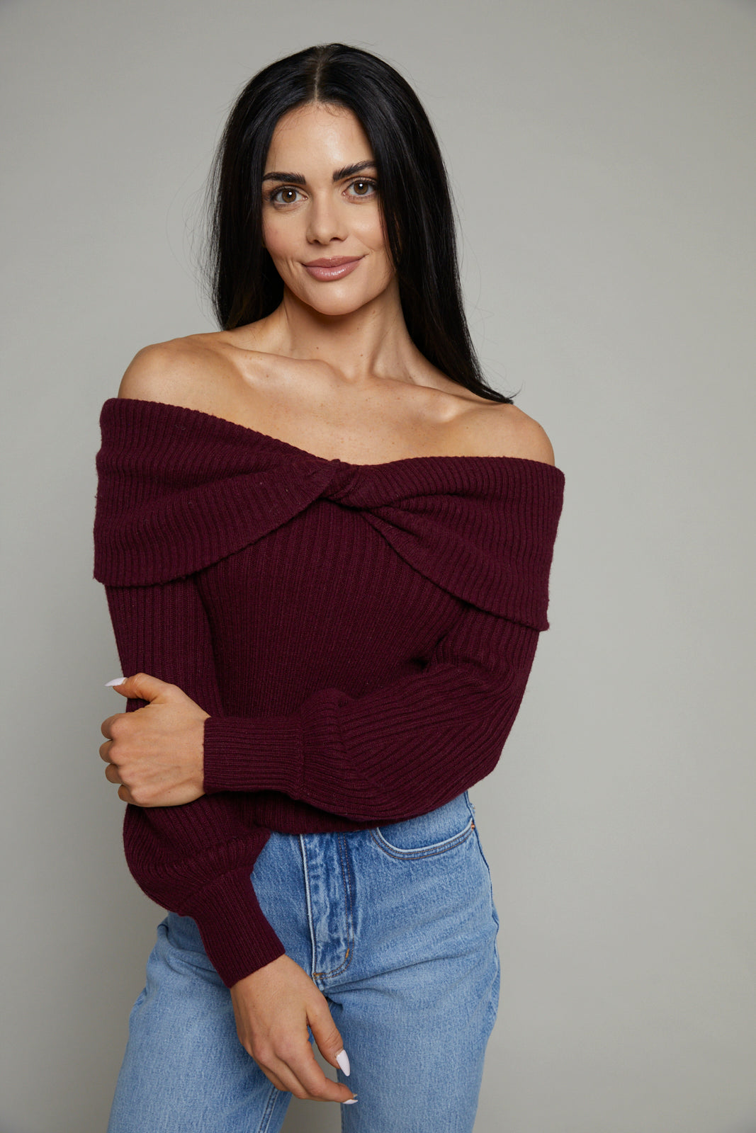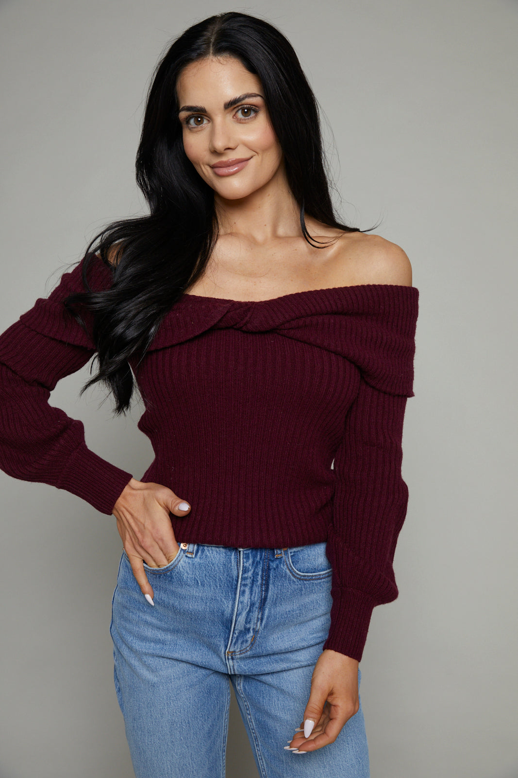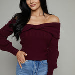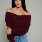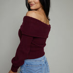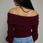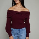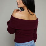 Prim Ribbed Off The Shoulder Sweater - Wine