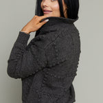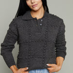 - Mid-weight knit sweater fabric - Textured knit pattern - Wide fold collar neckline - Front button - Long sleeves - Pullover design - Ribbed cuffs and bottom opening